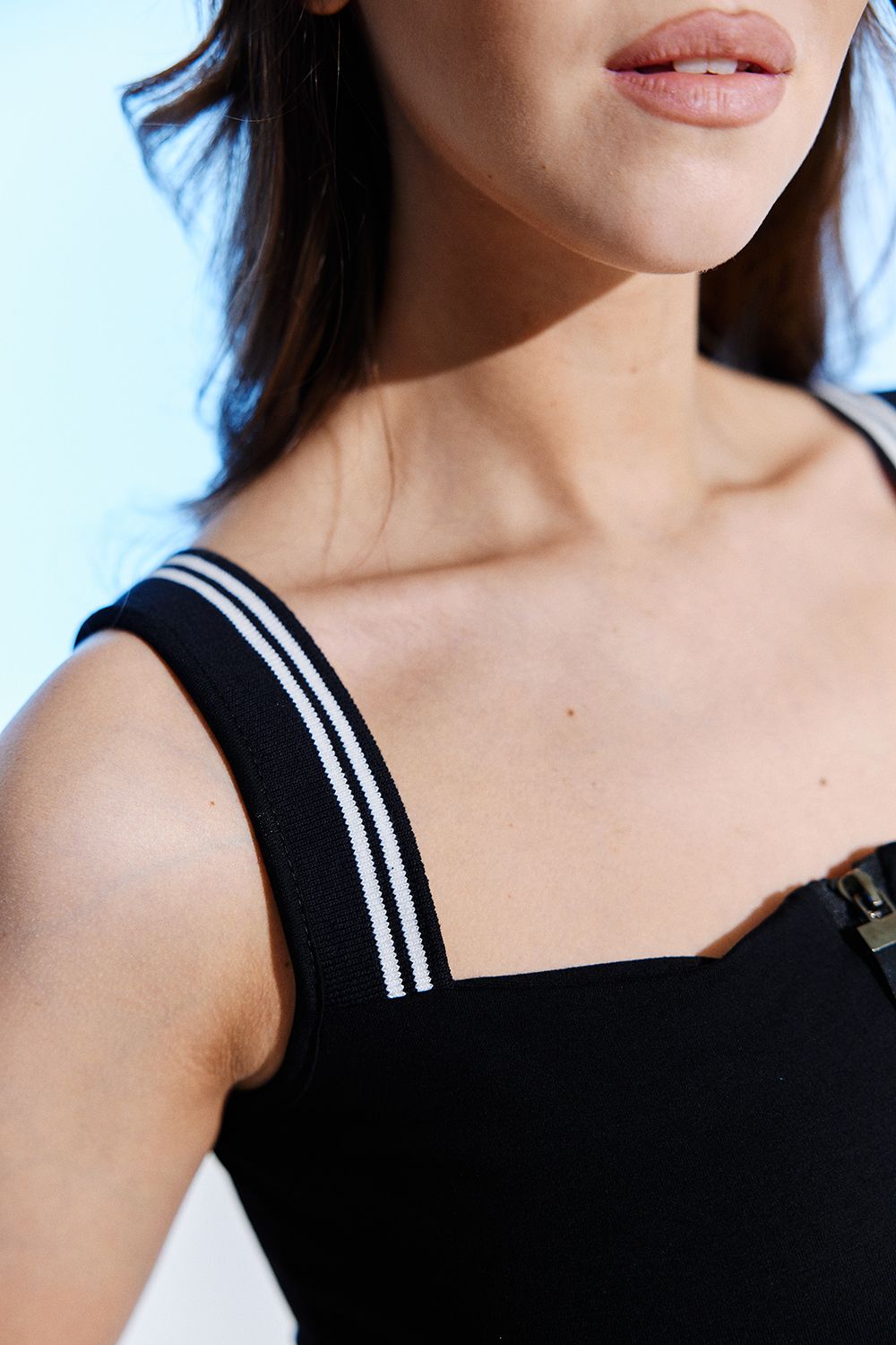 Комплект состоит из топа и юбки. Топ на широких бретелях из эластичного полотна с контрастными полосками, с квадратной горловиной, с декоративной молнией. Бретели и верх спинки обработаны бейкой из основного полотна. Юбка расклешенная, на поясе.