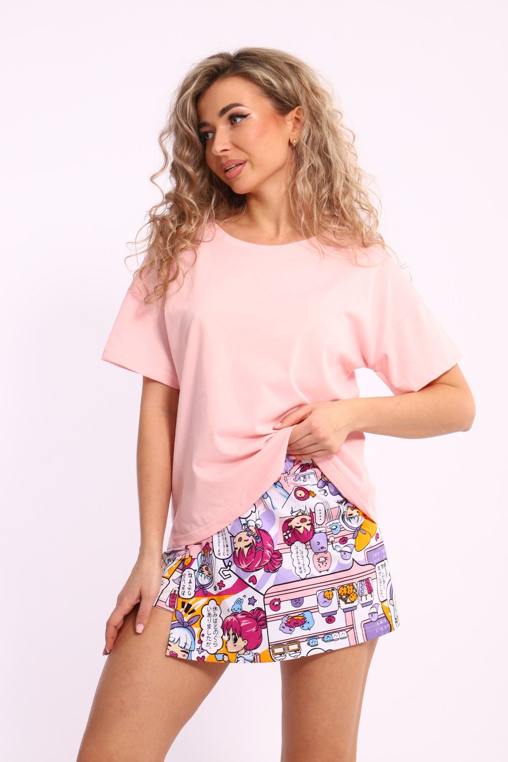 Костюм женский футболка с шортами-юбка Данная модель выполнена из трикотажного полотна кулирка (хлопок 100%). Отличная модель для дома и отдыха. Футболка свободного покроя со спущенным рукавом. Шорты-юбка с поясом 5см с тремя строчками. Отличная модель для отдыха.