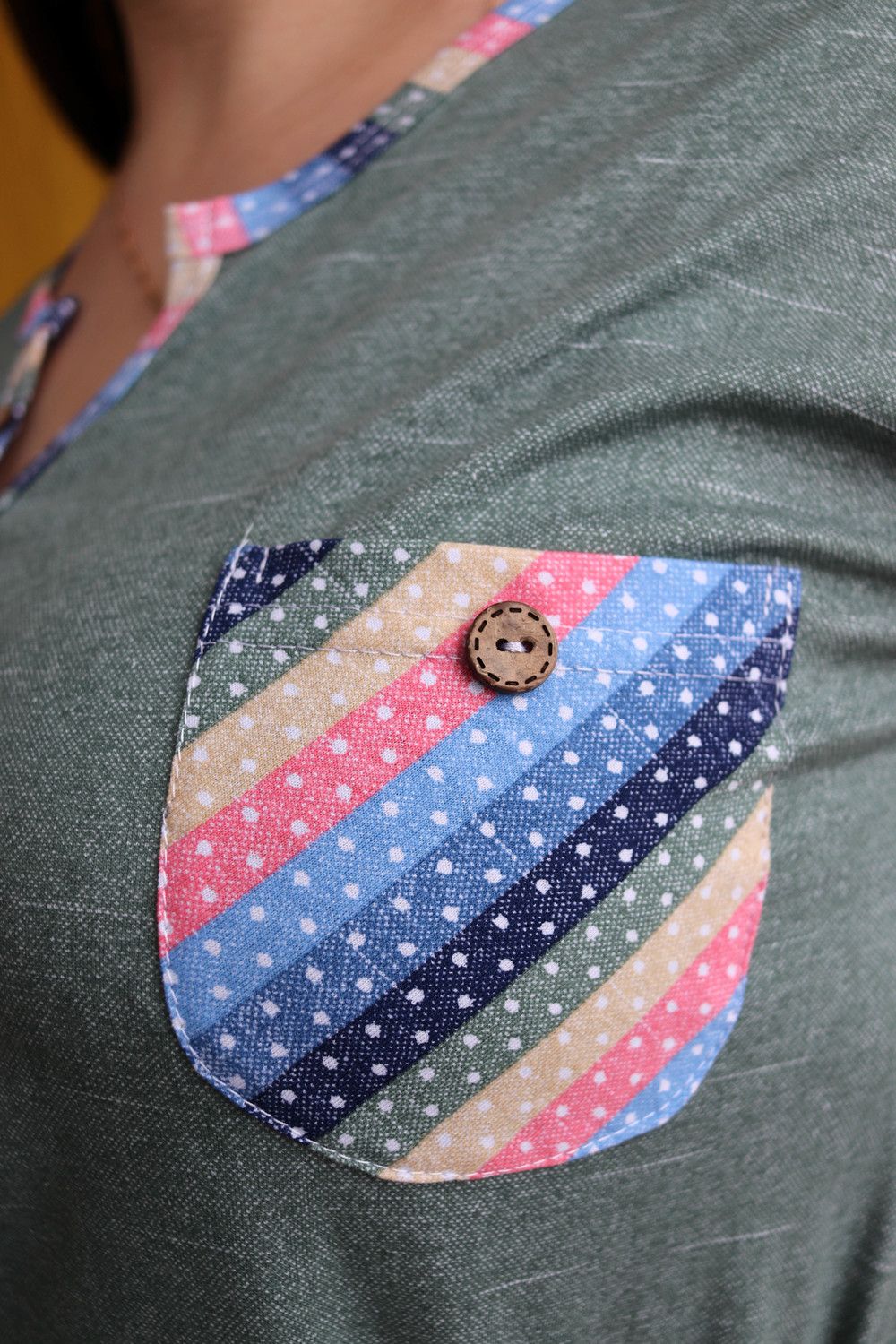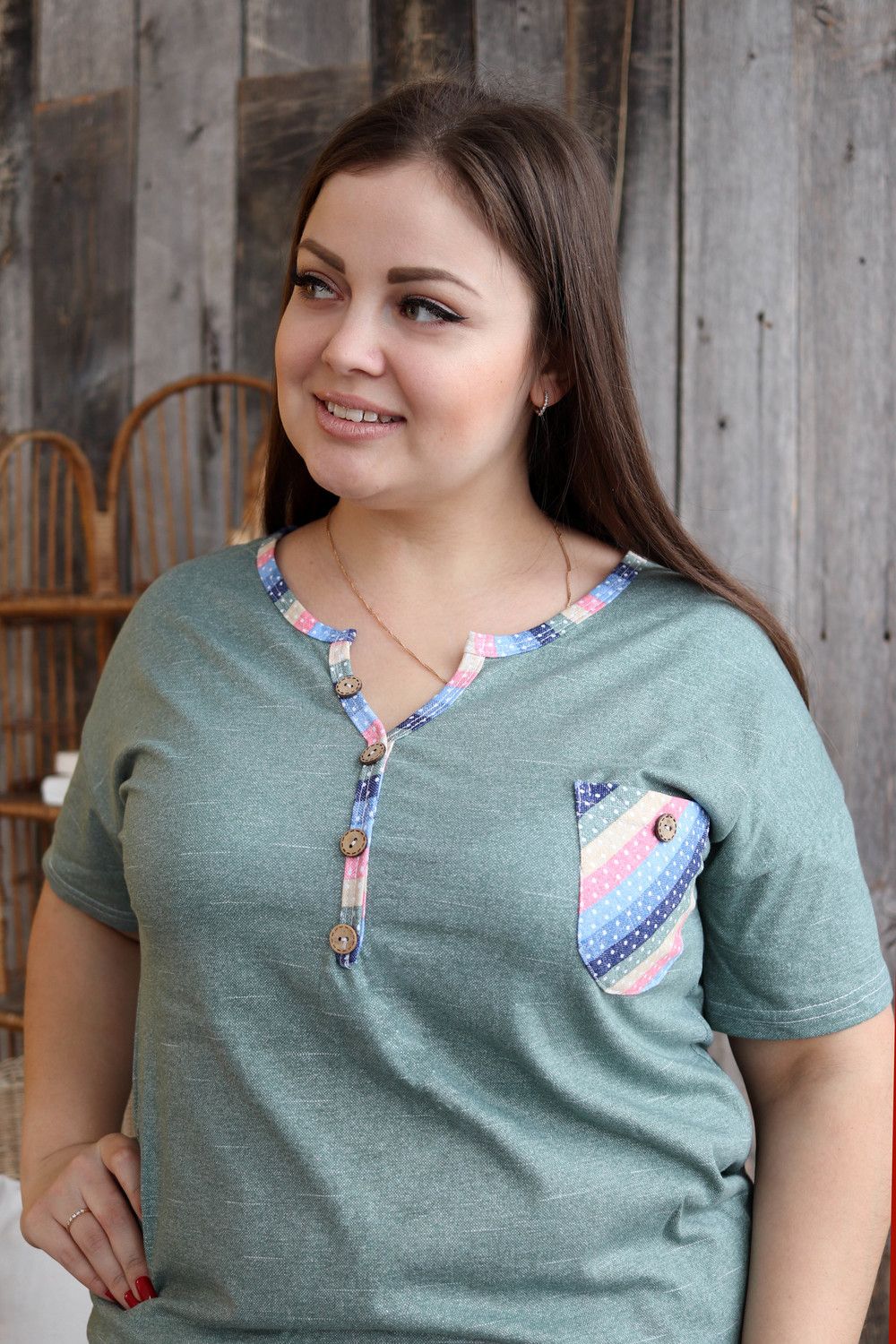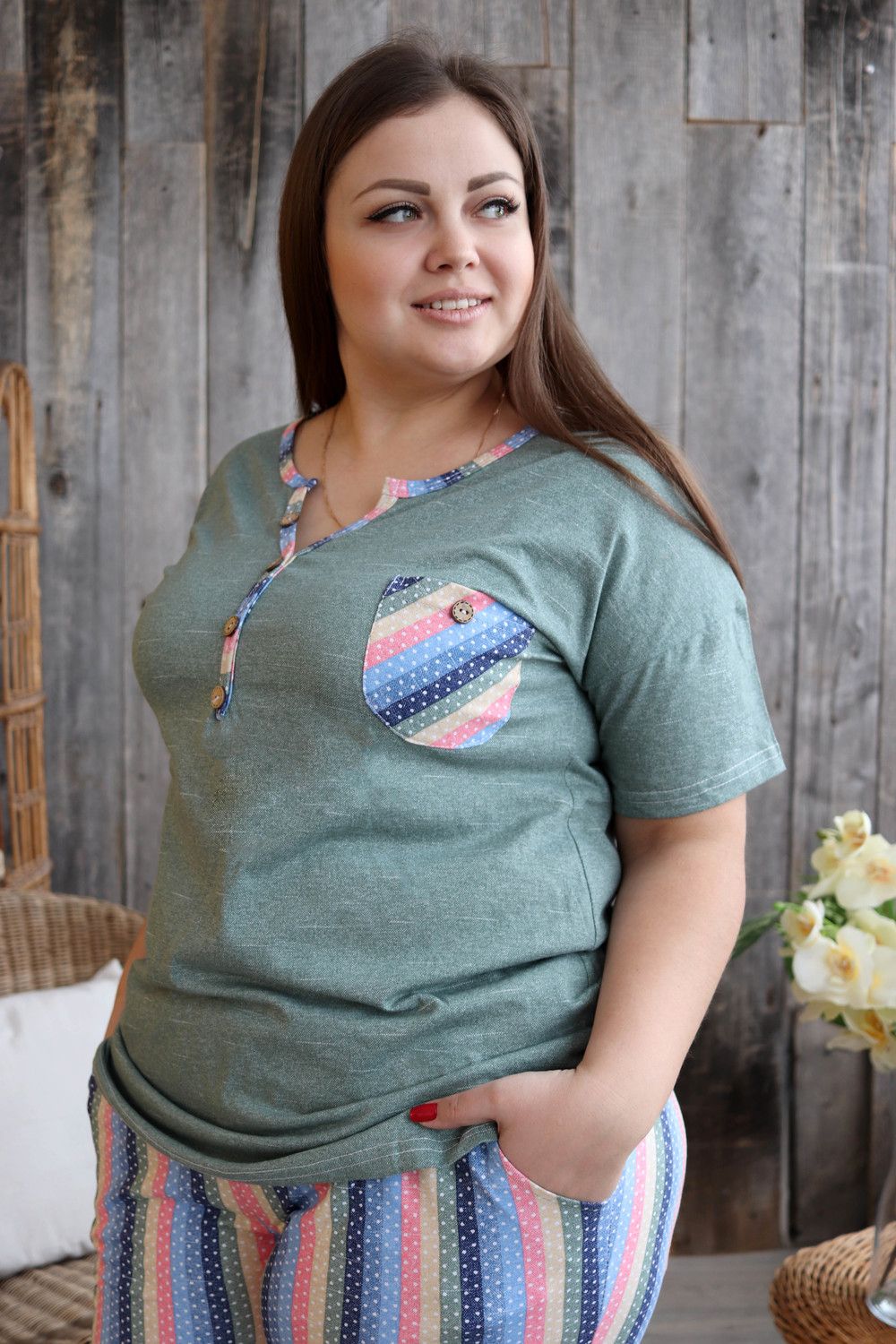 Костюм женский: туника и бриджи. Туника полуприлегающего силуэта с фигурным Y-образным вырезом. Рукав короткий цельнокроенный со швом. На полочке нагрудный карман с пуговицей, из отделочной ткани в полоску. В боковых швах туники и бриджей небольшие разрезы. Бриджи из ткани в полоску, длина ниже колена, на передних частях внутренние карманы, пояс обработан на многоигольной машине. На модели 52 размер