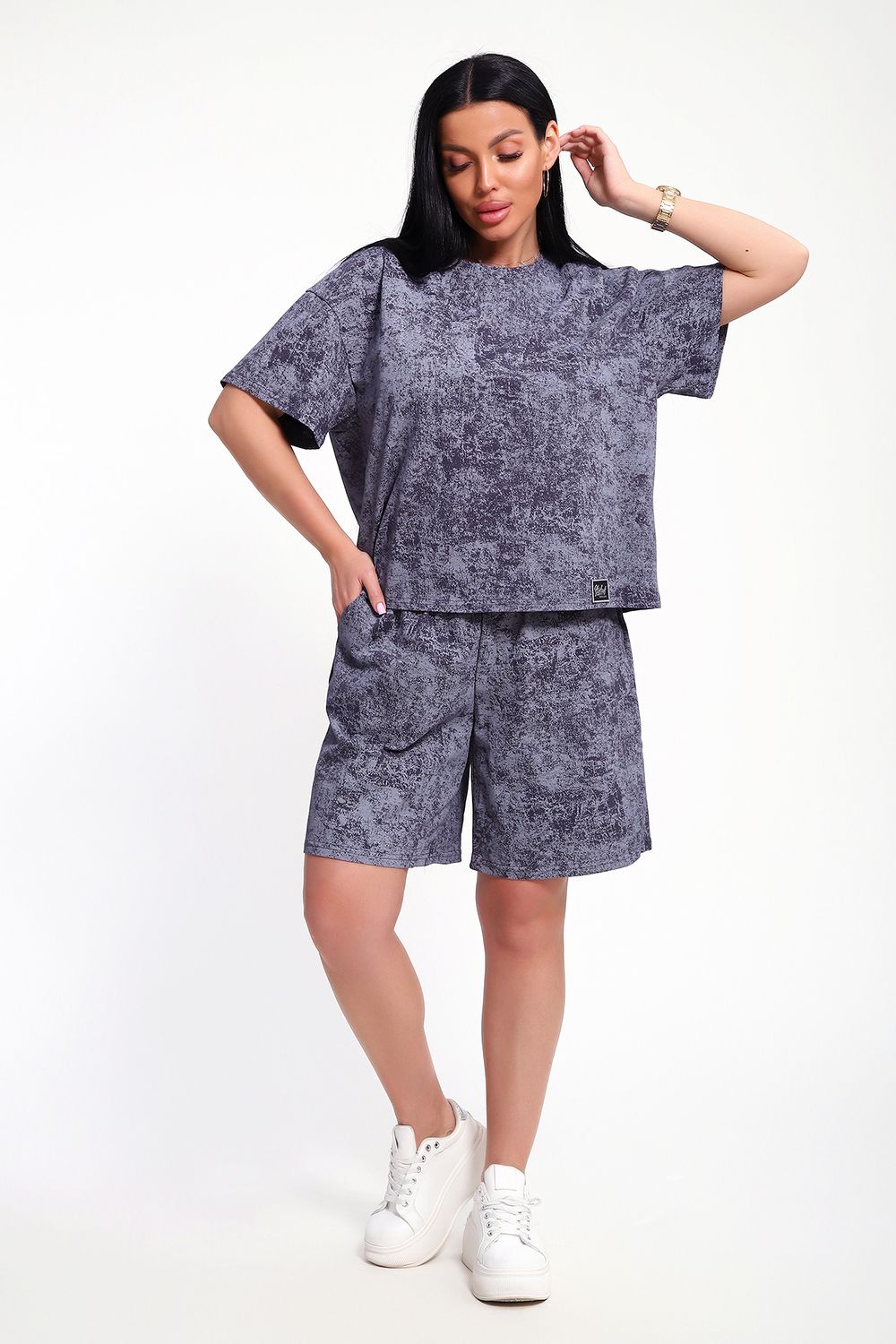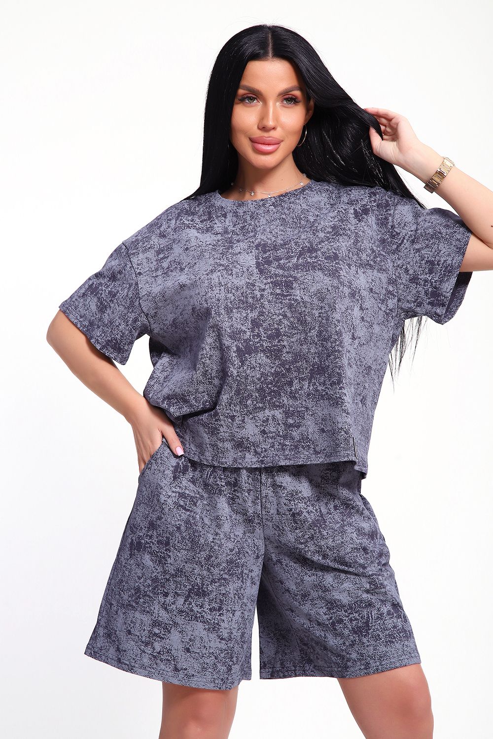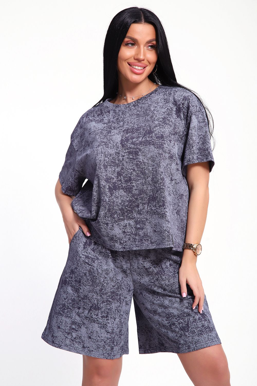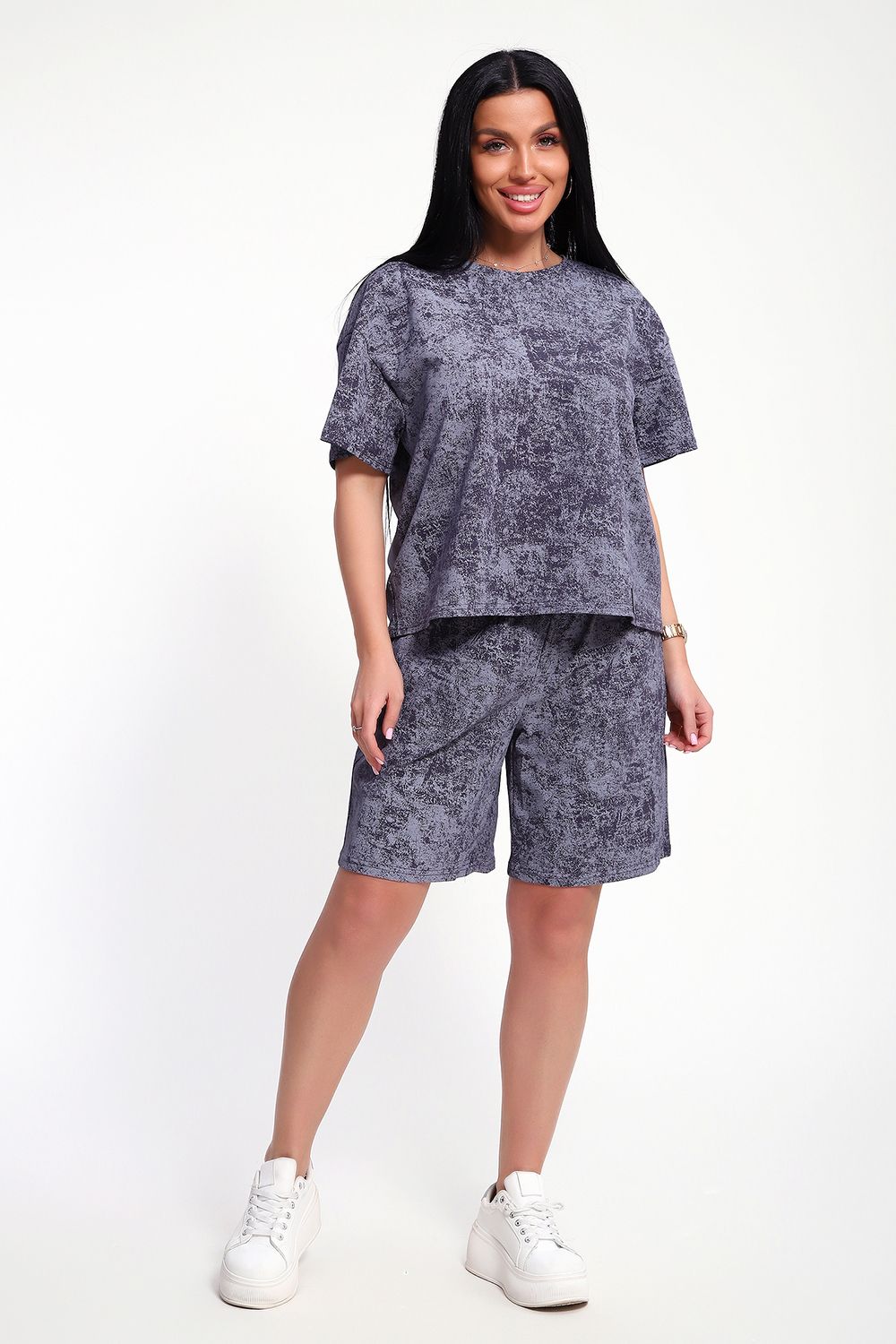 Женский домашний костюм-двойка фасона оверсайз - это стильный и очень уютный вариант, который подойдет всем без исключения. Он отлично сядет на любой тип фигуры и рост, благодаря своему свободному крою. Костюм изготовлен из высококачественного материала - кулирка (100% хлопок), который не только приятен на ощупь, но и обеспечивает комфорт во время носки благодаря своей хорошей воздухопроницаемости. Модный летний костюмчик имеет свободный крой, который не стесняет движений. Он состоит из футболки и шорт. Футболка со спущенной линией плеча и коротким рукавом, горловина круглая. Широкие шорты с эластичным поясом на резинке. Этот костюм-двойка - отличный выбор для домашнего отдыха или для летних прогулок. Он не только стильный, но и очень удобный. Так что, если вы ищете комфортный и модный вариант для своего гардероба, то этот костюм-двойка - именно то, что вам нужно!