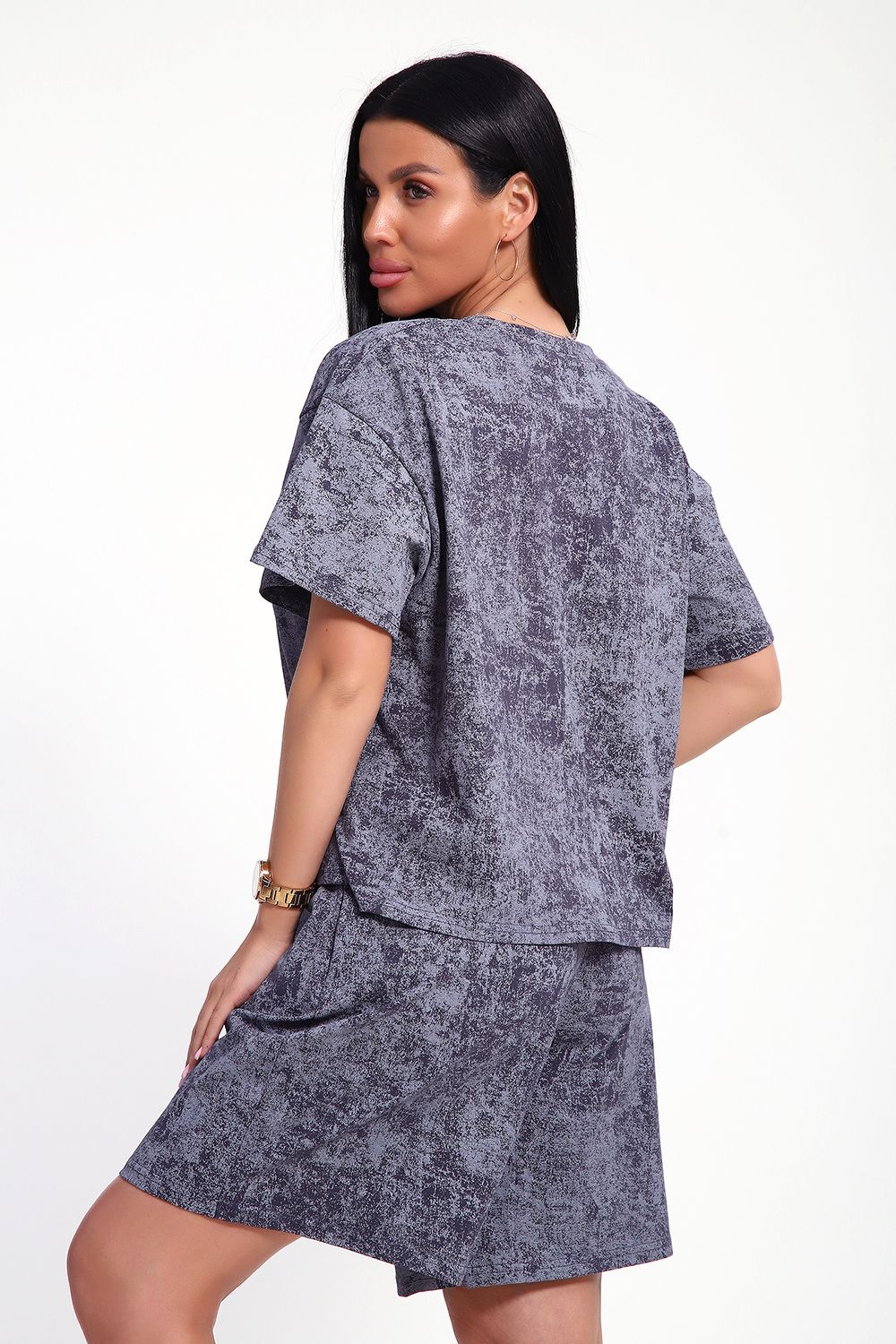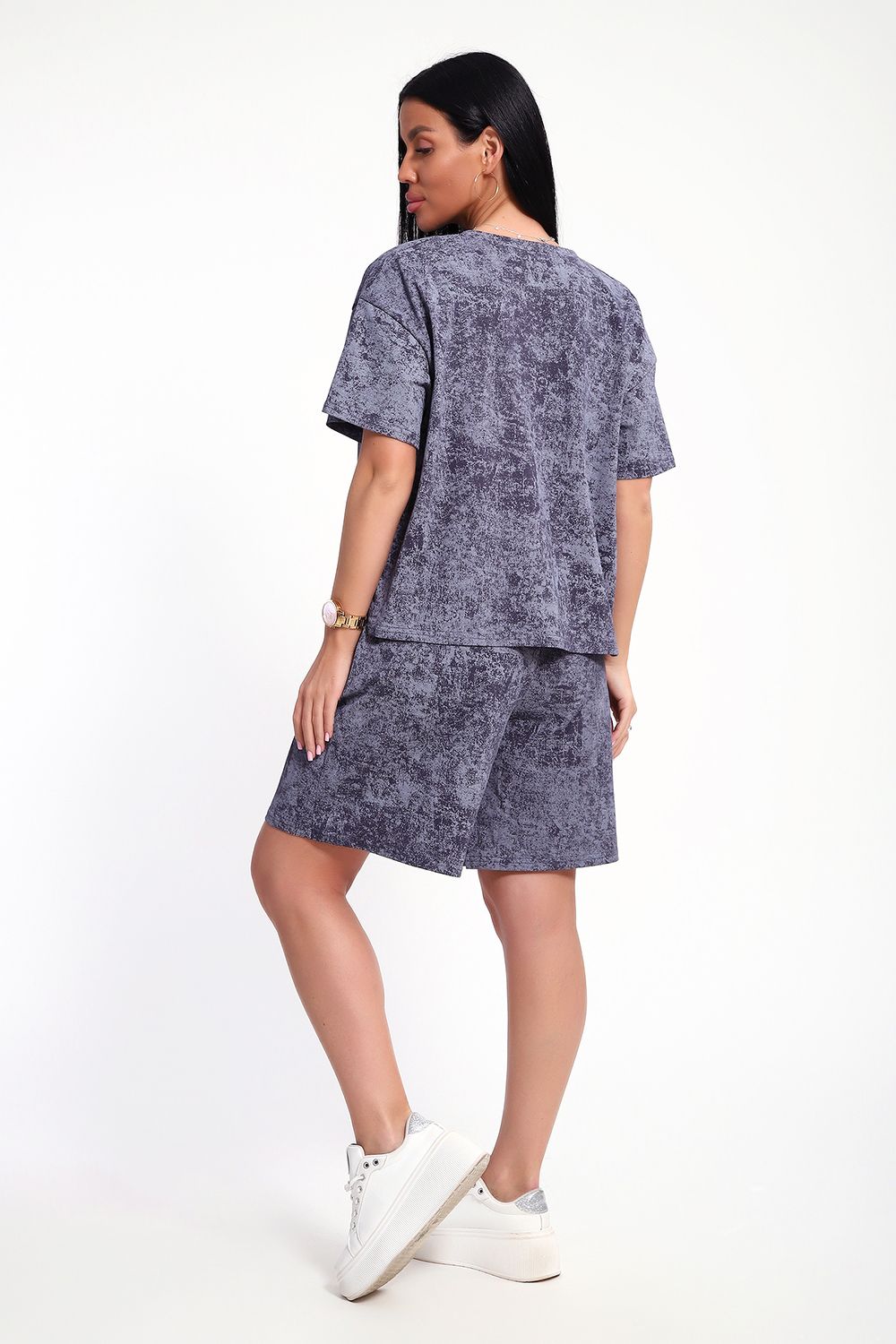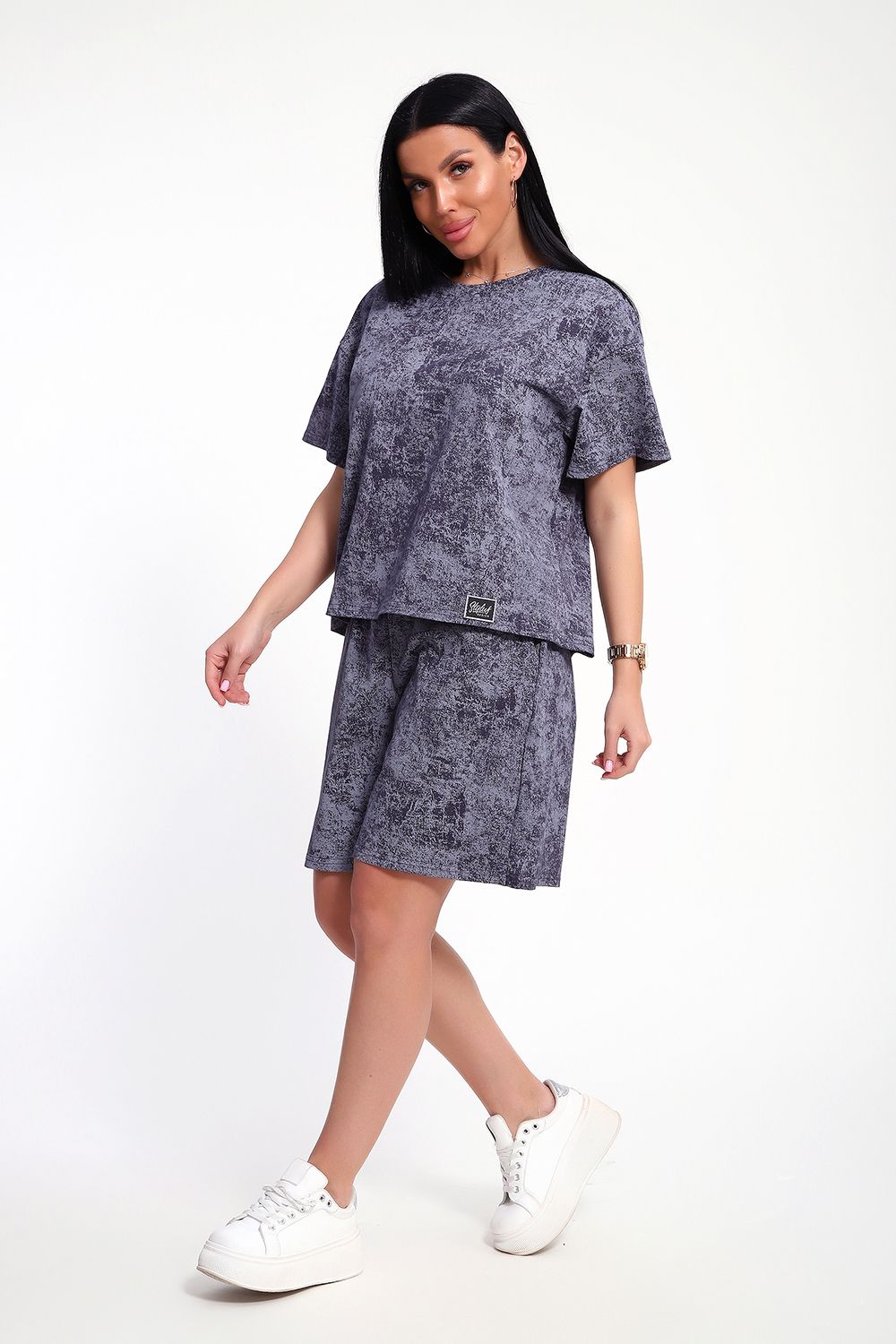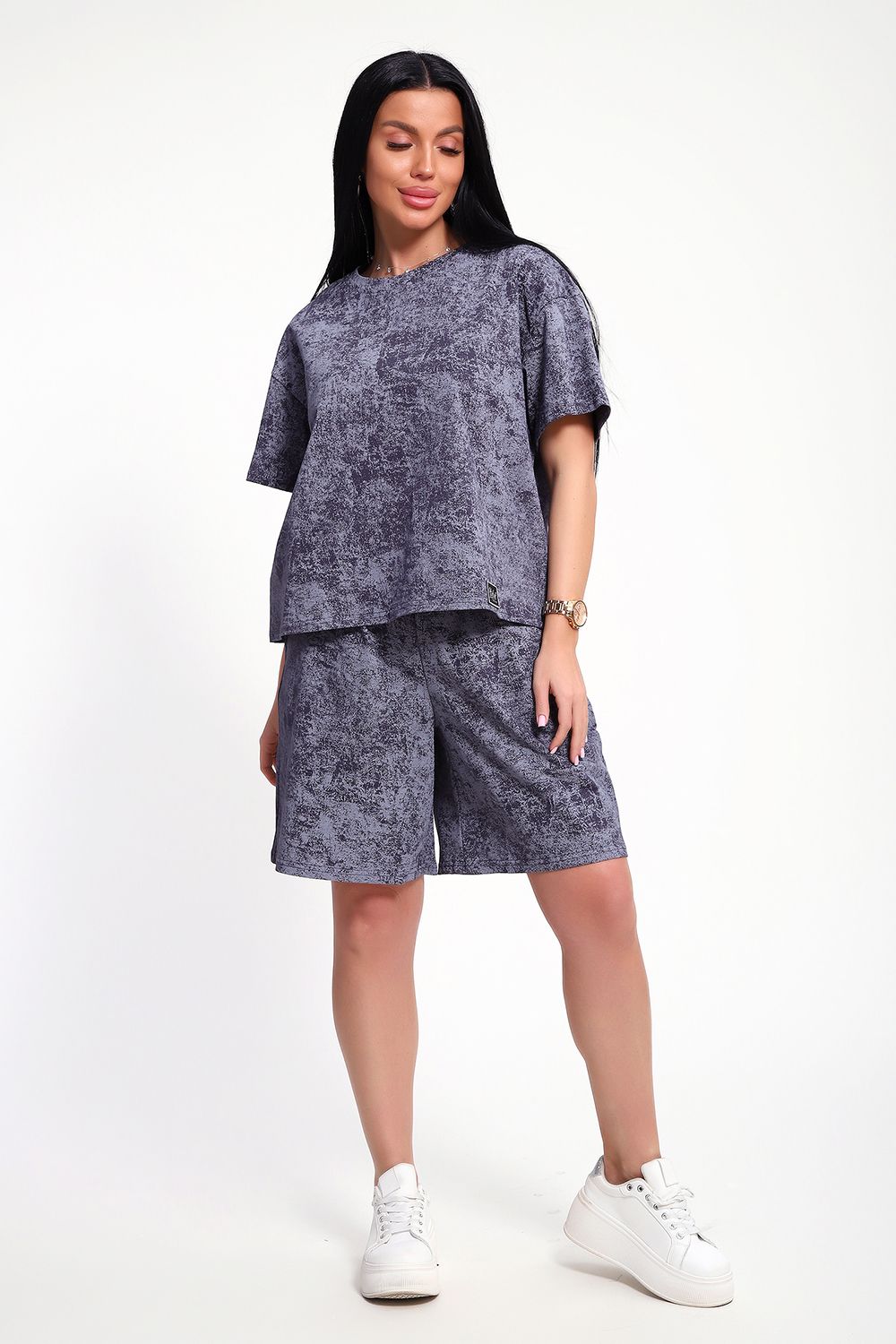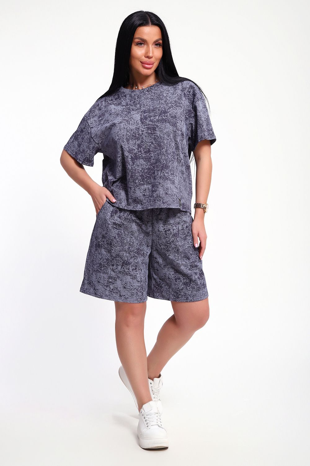 Женский домашний костюм-двойка фасона оверсайз - это стильный и очень уютный вариант, который подойдет всем без исключения. Он отлично сядет на любой тип фигуры и рост, благодаря своему свободному крою. Костюм изготовлен из высококачественного материала - кулирка (100% хлопок), который не только приятен на ощупь, но и обеспечивает комфорт во время носки благодаря своей хорошей воздухопроницаемости. Модный летний костюмчик имеет свободный крой, который не стесняет движений. Он состоит из футболки и шорт. Футболка со спущенной линией плеча и коротким рукавом, горловина круглая. Широкие шорты с эластичным поясом на резинке. Этот костюм-двойка - отличный выбор для домашнего отдыха или для летних прогулок. Он не только стильный, но и очень удобный. Так что, если вы ищете комфортный и модный вариант для своего гардероба, то этот костюм-двойка - именно то, что вам нужно!