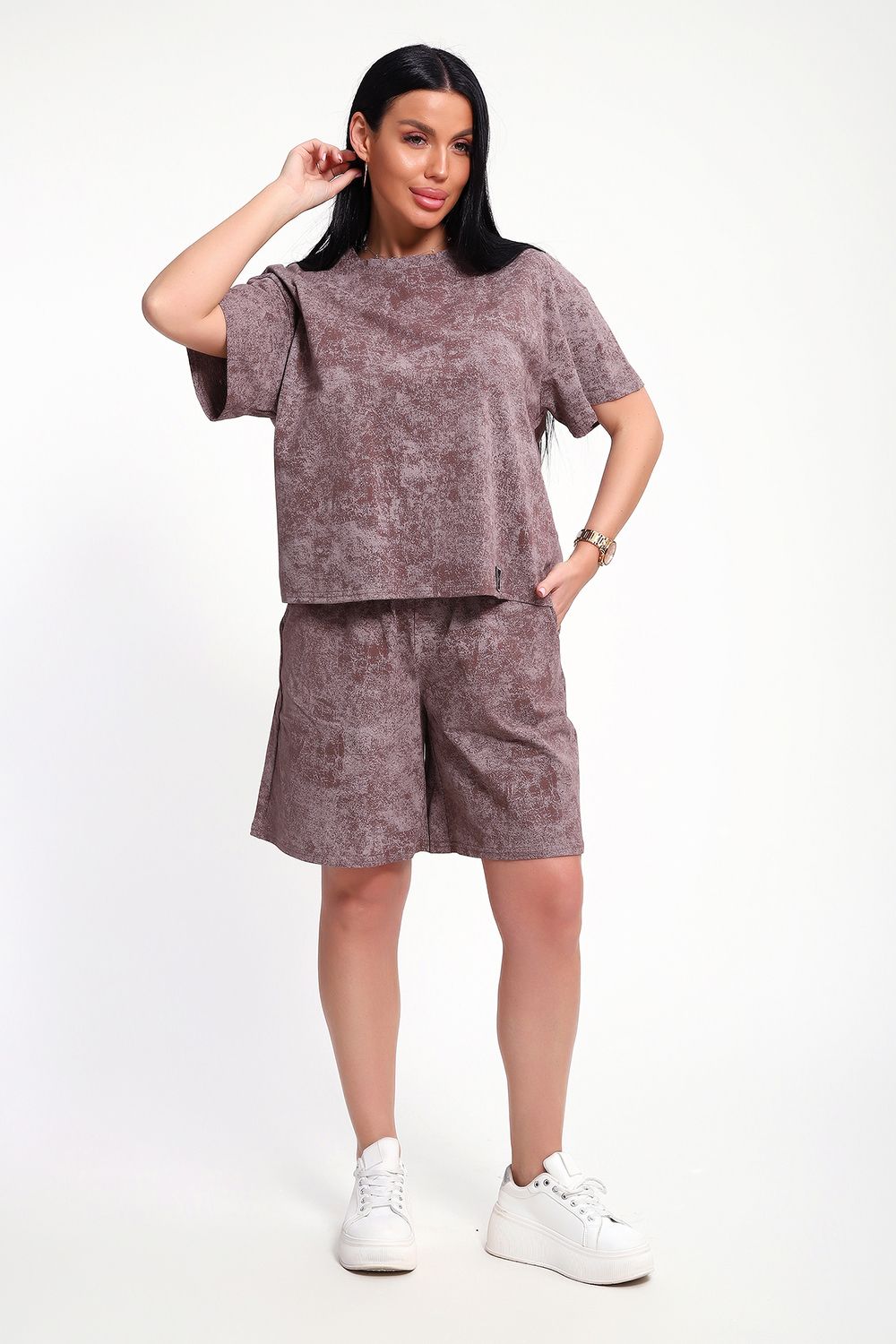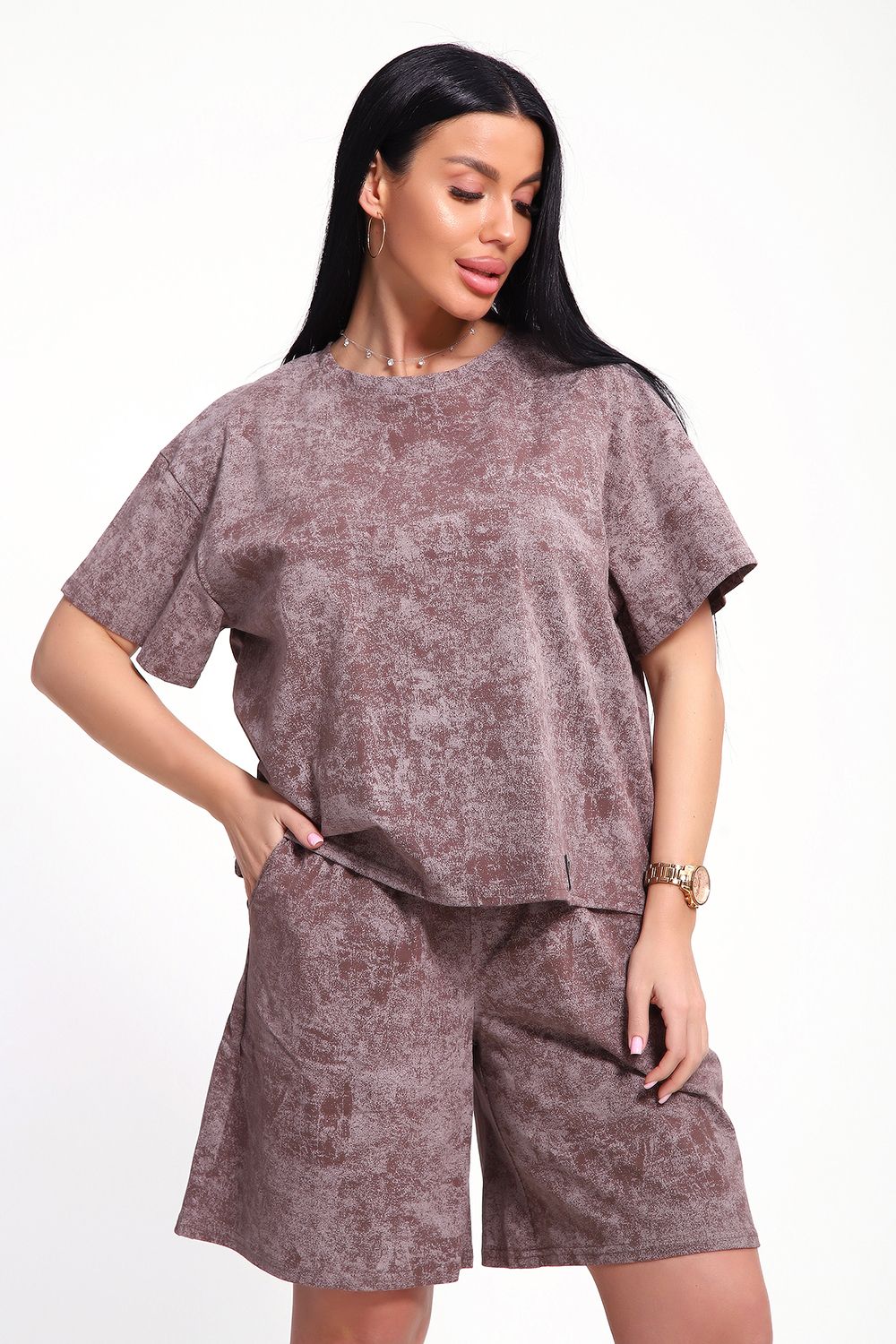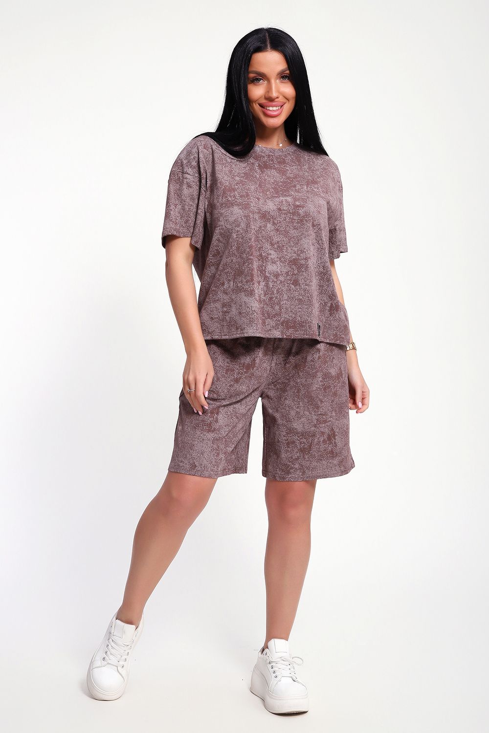 Женский домашний костюм-двойка фасона оверсайз - это стильный и очень уютный вариант, который подойдет всем без исключения. Он отлично сядет на любой тип фигуры и рост, благодаря своему свободному крою. Костюм изготовлен из высококачественного материала - кулирка (100% хлопок), который не только приятен на ощупь, но и обеспечивает комфорт во время носки благодаря своей хорошей воздухопроницаемости. Модный летний костюмчик имеет свободный крой, который не стесняет движений. Он состоит из футболки и шорт. Футболка со спущенной линией плеча и коротким рукавом, горловина круглая. Широкие шорты с эластичным поясом на резинке. Этот костюм-двойка - отличный выбор для домашнего отдыха или для летних прогулок. Он не только стильный, но и очень удобный. Так что, если вы ищете комфортный и модный вариант для своего гардероба, то этот костюм-двойка - именно то, что вам нужно!