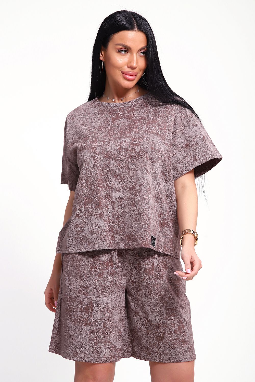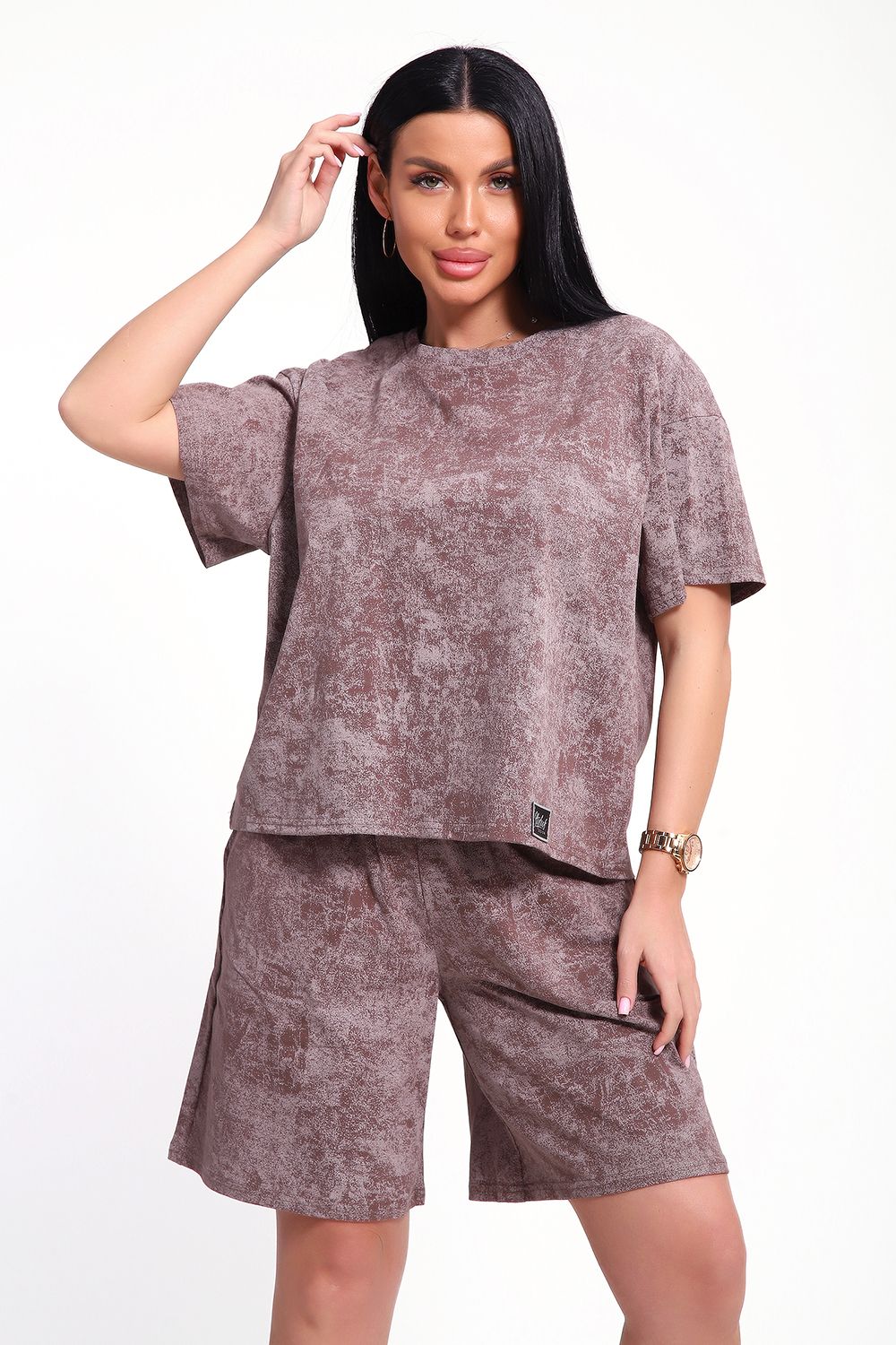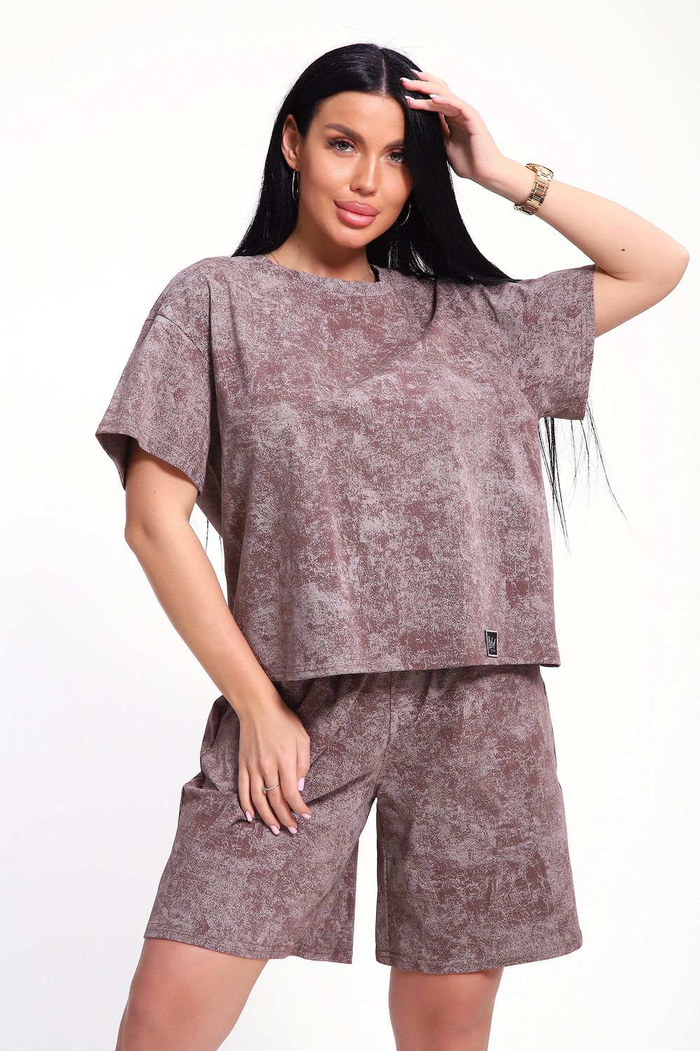 Женский домашний костюм-двойка фасона оверсайз - это стильный и очень уютный вариант, который подойдет всем без исключения. Он отлично сядет на любой тип фигуры и рост, благодаря своему свободному крою. Костюм изготовлен из высококачественного материала - кулирка (100% хлопок), который не только приятен на ощупь, но и обеспечивает комфорт во время носки благодаря своей хорошей воздухопроницаемости. Модный летний костюмчик имеет свободный крой, который не стесняет движений. Он состоит из футболки и шорт. Футболка со спущенной линией плеча и коротким рукавом, горловина круглая. Широкие шорты с эластичным поясом на резинке. Этот костюм-двойка - отличный выбор для домашнего отдыха или для летних прогулок. Он не только стильный, но и очень удобный. Так что, если вы ищете комфортный и модный вариант для своего гардероба, то этот костюм-двойка - именно то, что вам нужно!