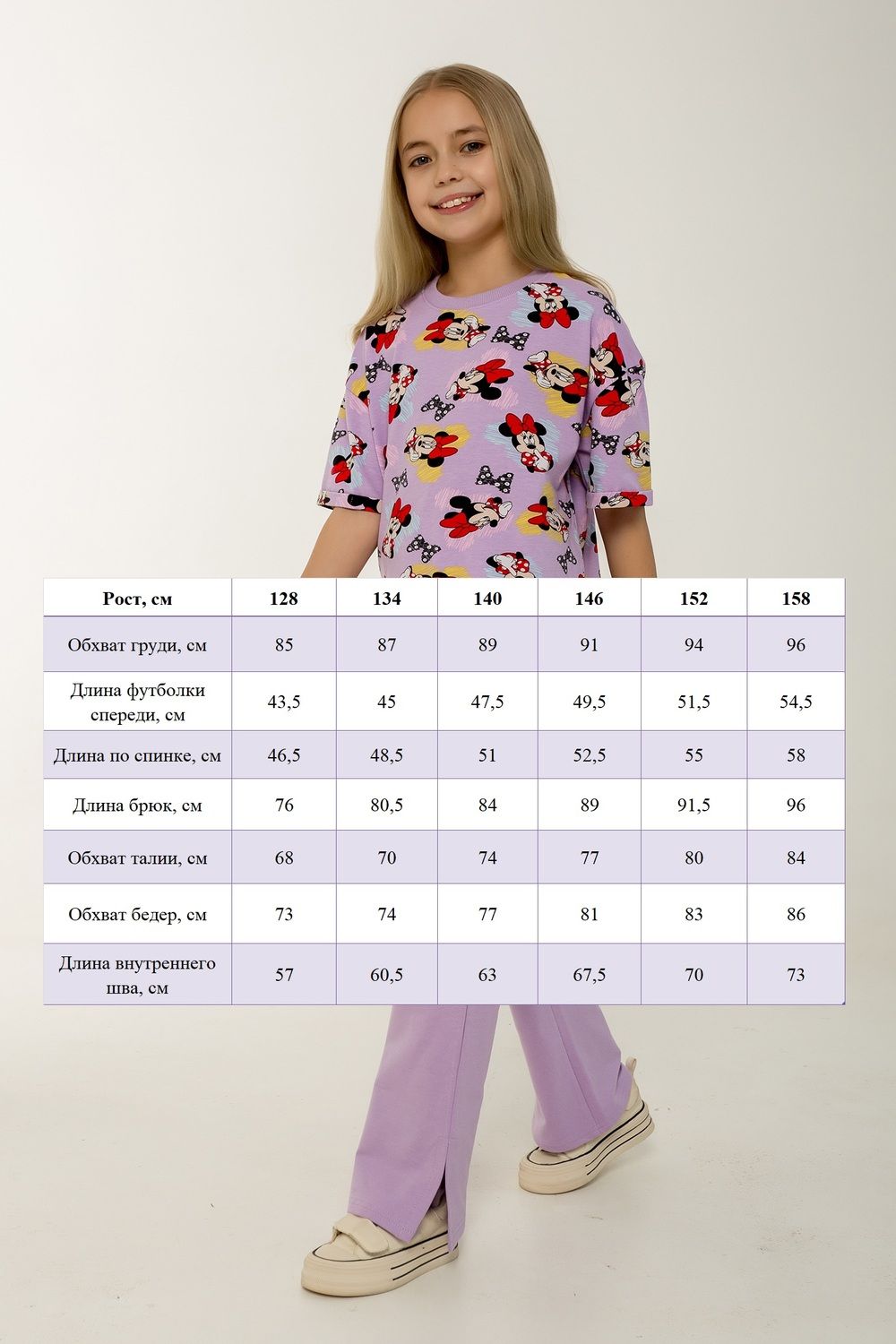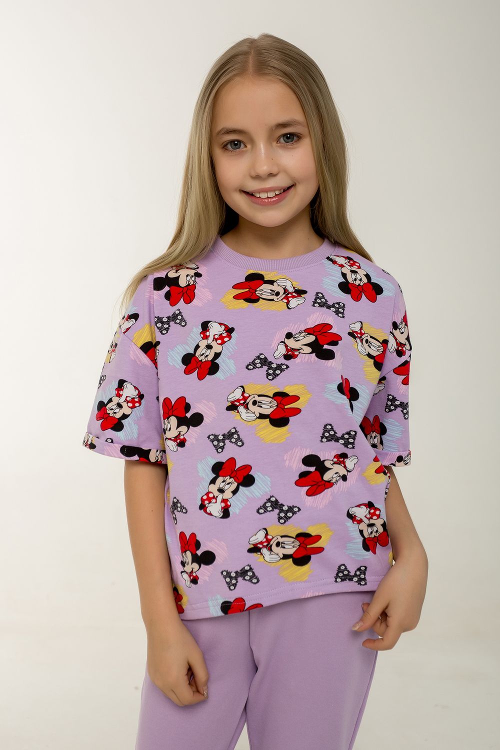 Этот стильный и удобный костюм-двойка станет замечательным выбором для активной малышки! В комплекте идет футболка с коротким рукавом и брюки, оба изделия выполнены из петельчатого футера, который обеспечивает комфорт и свободу движений. Футболка украшена модным рисунком с изображением Минни Маус, имеет короткие рукава и боковые разрезы, что добавляет оригинальности и удобства. Брюки выполнены в однотонном исполнении, без карманов, с боковыми разрезами внизу, что делает их идеальными для активных игр. Костюм прекрасно подходит для повседневного ношения, посещения детского сада или использования в качестве домашнего комплекта. Продукция сертифицирована и произведена на фабрике "Мариша", что гарантирует высокое качество и безопасность материалов.