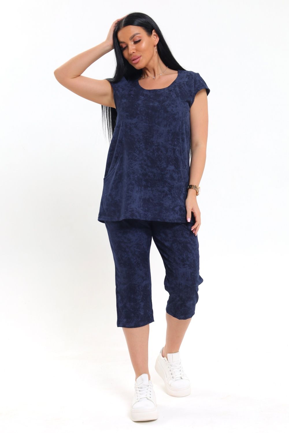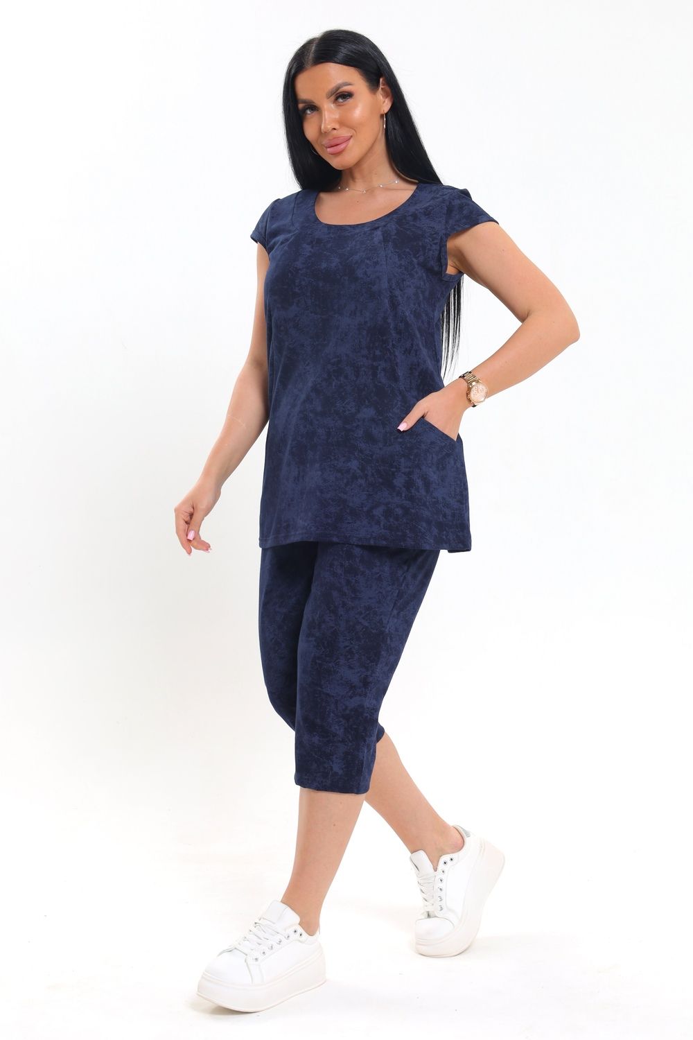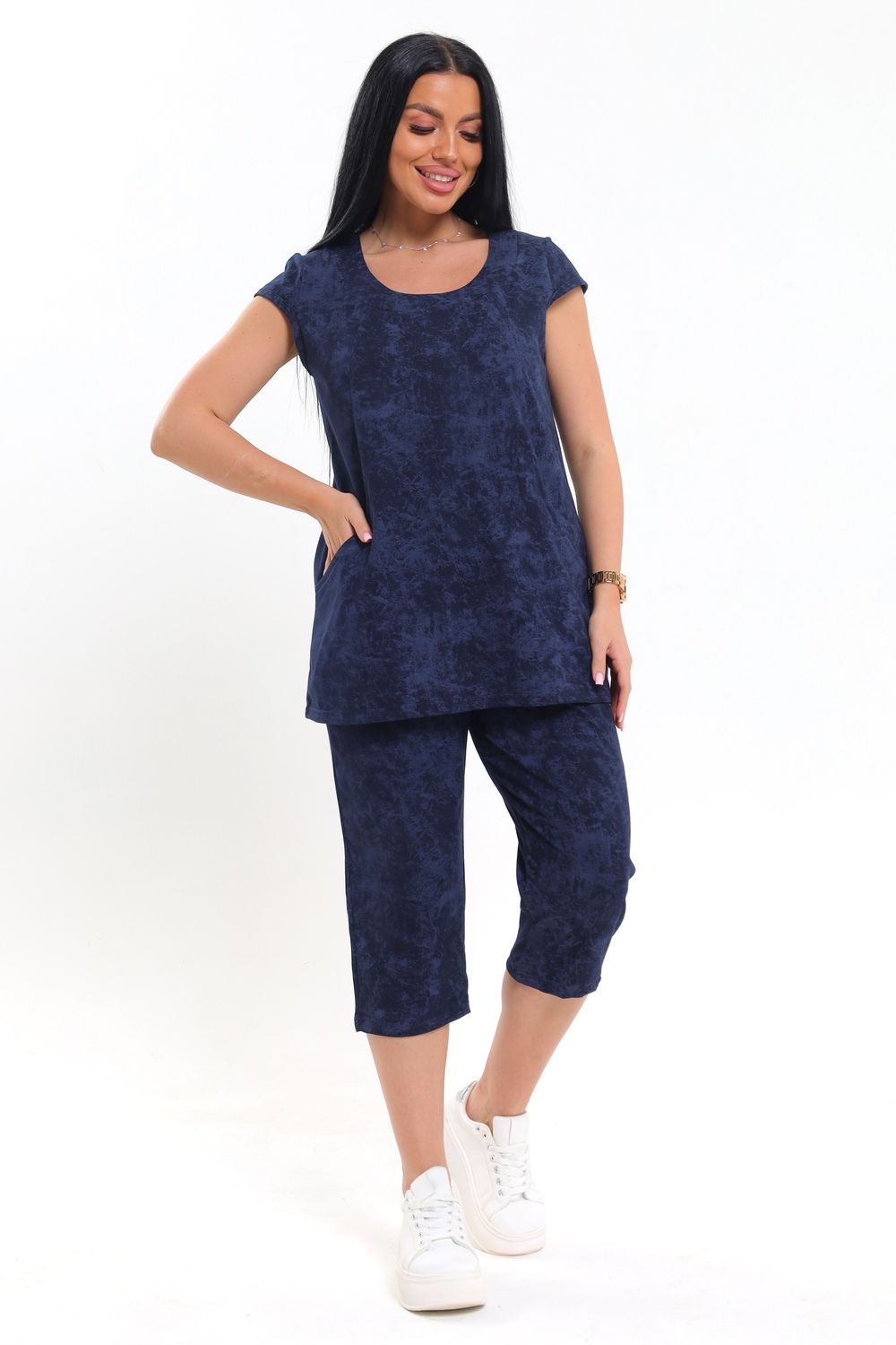 Яркий и практичный вариант для уютных вечеров и летнего отдыха — женский костюм с бриджами, который отлично подойдет для дома и дачи. Крой свободный, что обеспечивает комфортную посадку и не сковывает движений — отличный выбор для лета. Короткие рукава и округлый вырез подчеркивают легкость дизайна, а вшитые боковые вставки визуально стройнят силуэт. Удобные карманы на верхней части делают изделие еще более функциональным для дома или дачи. Бриджи средней длины выполнены из однотонной ткани, повторяющей основной цвет верха, что создает цельный и гармоничный комплект. Материал приятный к телу, хорошо пропускает воздух, что особенно важно в теплый сезон.