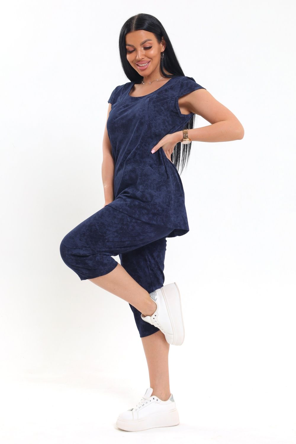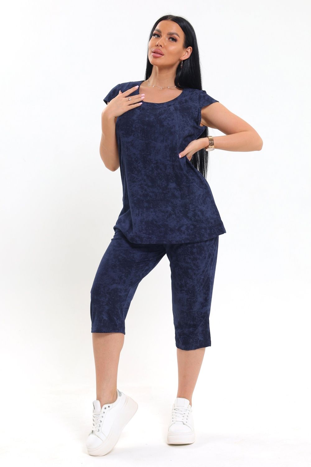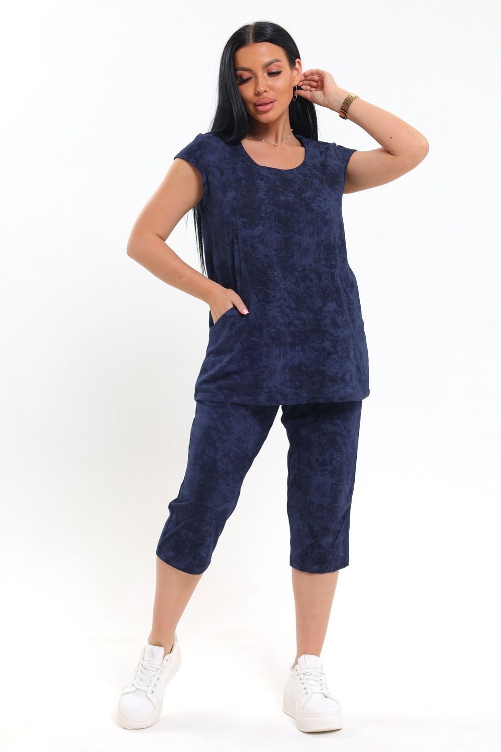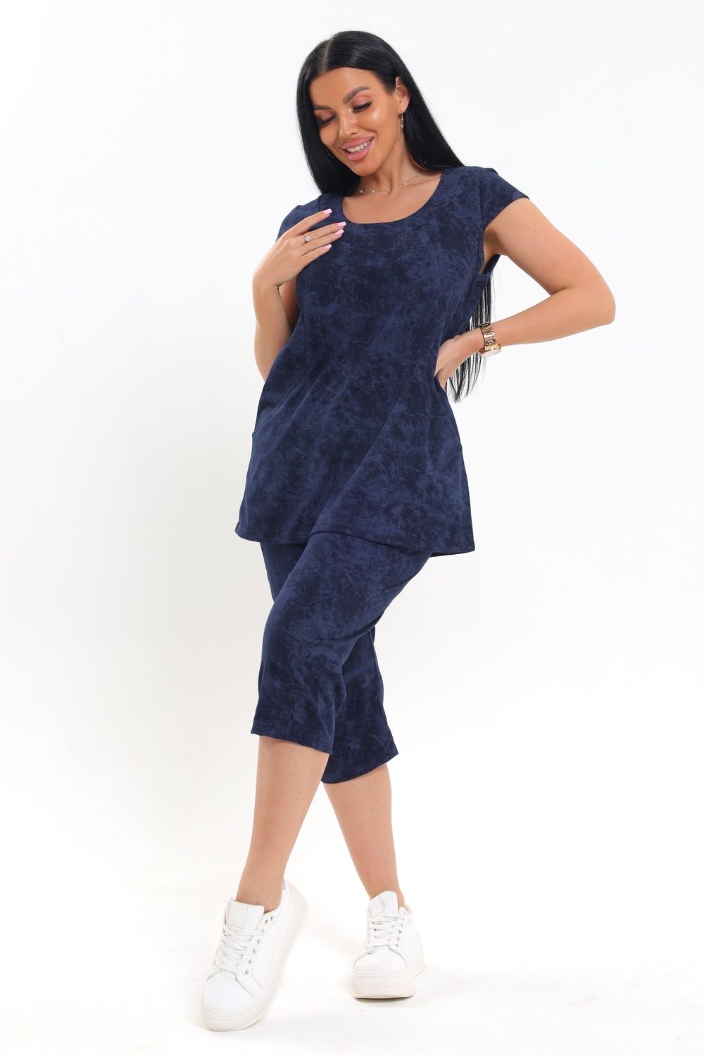Яркий и практичный вариант для уютных вечеров и летнего отдыха — женский костюм с бриджами, который отлично подойдет для дома и дачи. Крой свободный, что обеспечивает комфортную посадку и не сковывает движений — отличный выбор для лета. Короткие рукава и округлый вырез подчеркивают легкость дизайна, а вшитые боковые вставки визуально стройнят силуэт. Удобные карманы на верхней части делают изделие еще более функциональным для дома или дачи. Бриджи средней длины выполнены из однотонной ткани, повторяющей основной цвет верха, что создает цельный и гармоничный комплект. Материал приятный к телу, хорошо пропускает воздух, что особенно важно в теплый сезон.