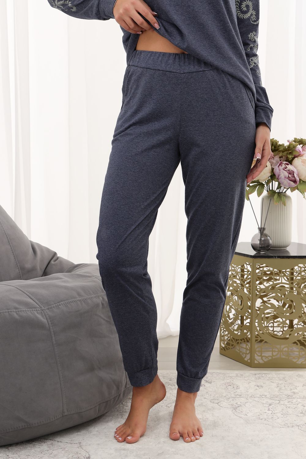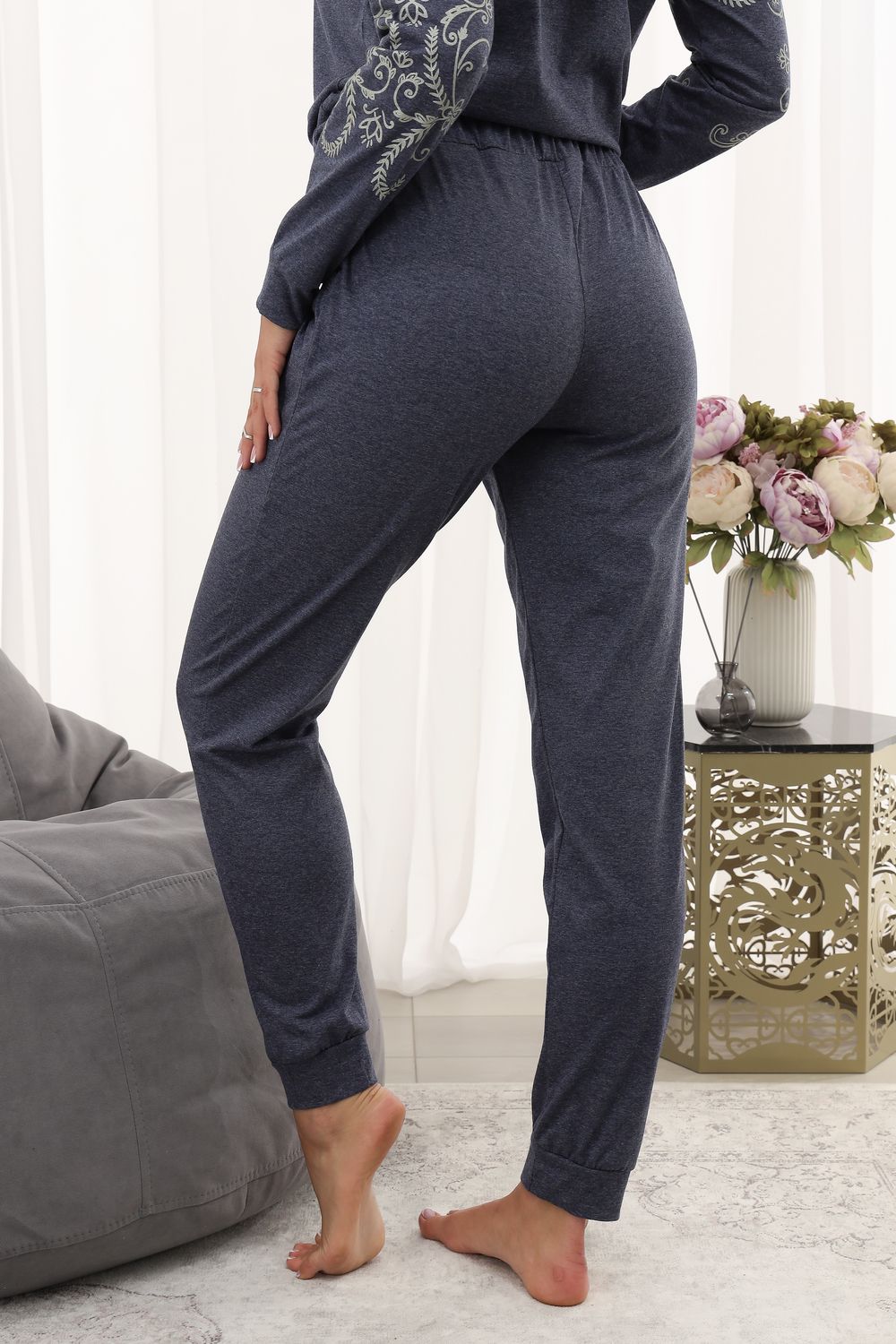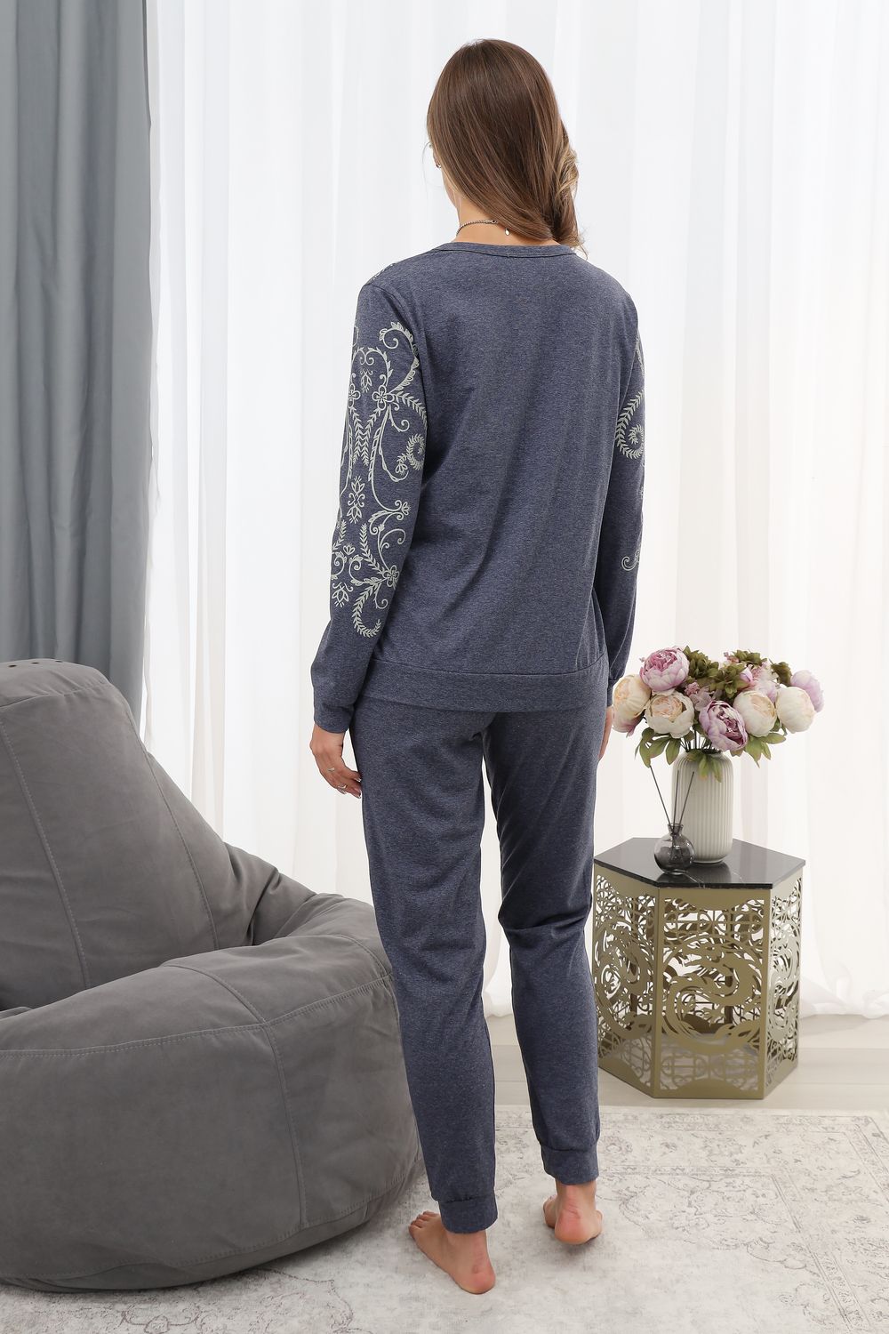 Кофта украшена декоративным узором на плечах и рукавах, который гармонично сочетается с базовым цветом, добавляет оригинальности и делает образ более выразительным. Прямой крой верха и брюк не сковывает движения, а эластичная резинка на поясе обеспечивает удобную посадку и легкость при надевании. Ткань обладает мягкой текстурой, приятной на ощупь и устойчивой к деформации. Благодаря универсальному дизайну, этот домашний вариант отлично подходит для отдыха, работы из дома или легких прогулок.