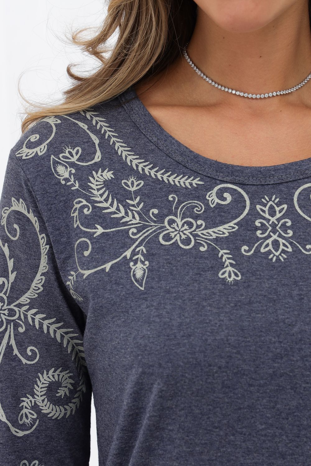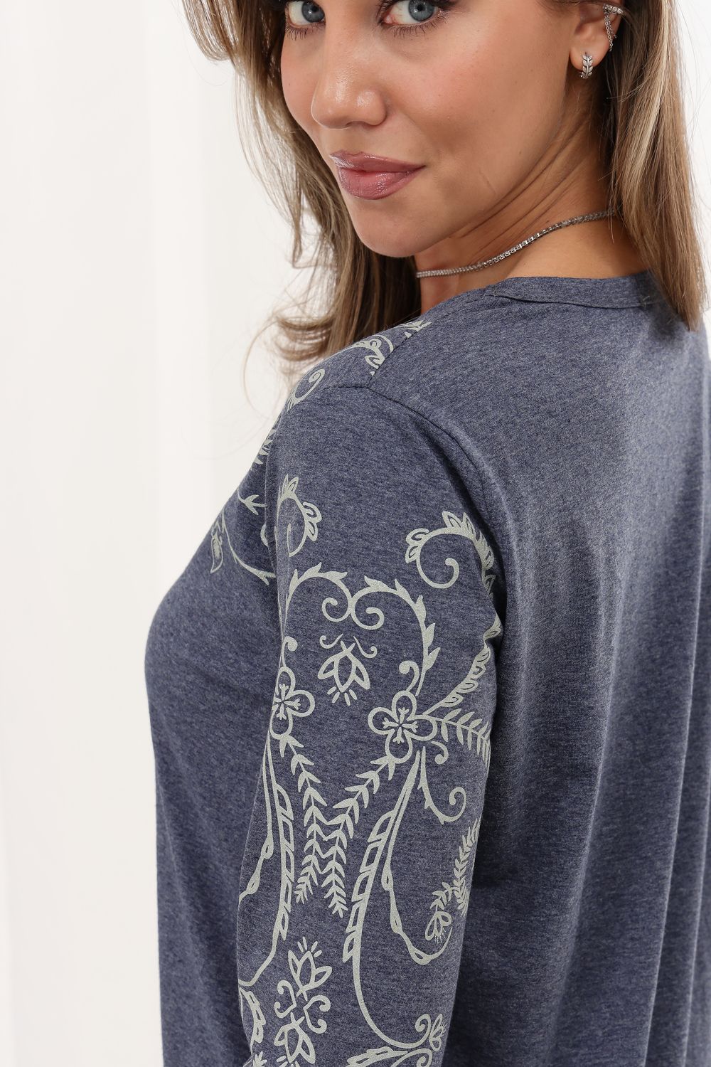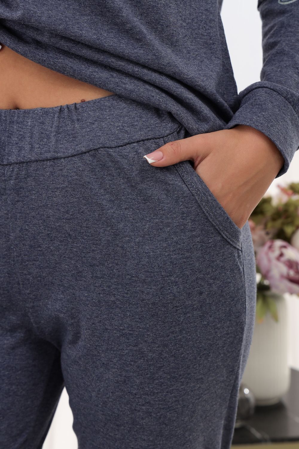 Кофта украшена декоративным узором на плечах и рукавах, который гармонично сочетается с базовым цветом, добавляет оригинальности и делает образ более выразительным. Прямой крой верха и брюк не сковывает движения, а эластичная резинка на поясе обеспечивает удобную посадку и легкость при надевании. Ткань обладает мягкой текстурой, приятной на ощупь и устойчивой к деформации. Благодаря универсальному дизайну, этот домашний вариант отлично подходит для отдыха, работы из дома или легких прогулок.