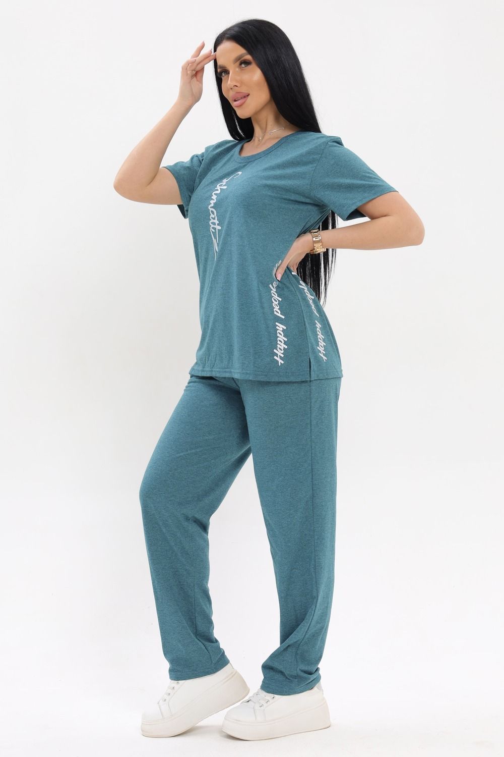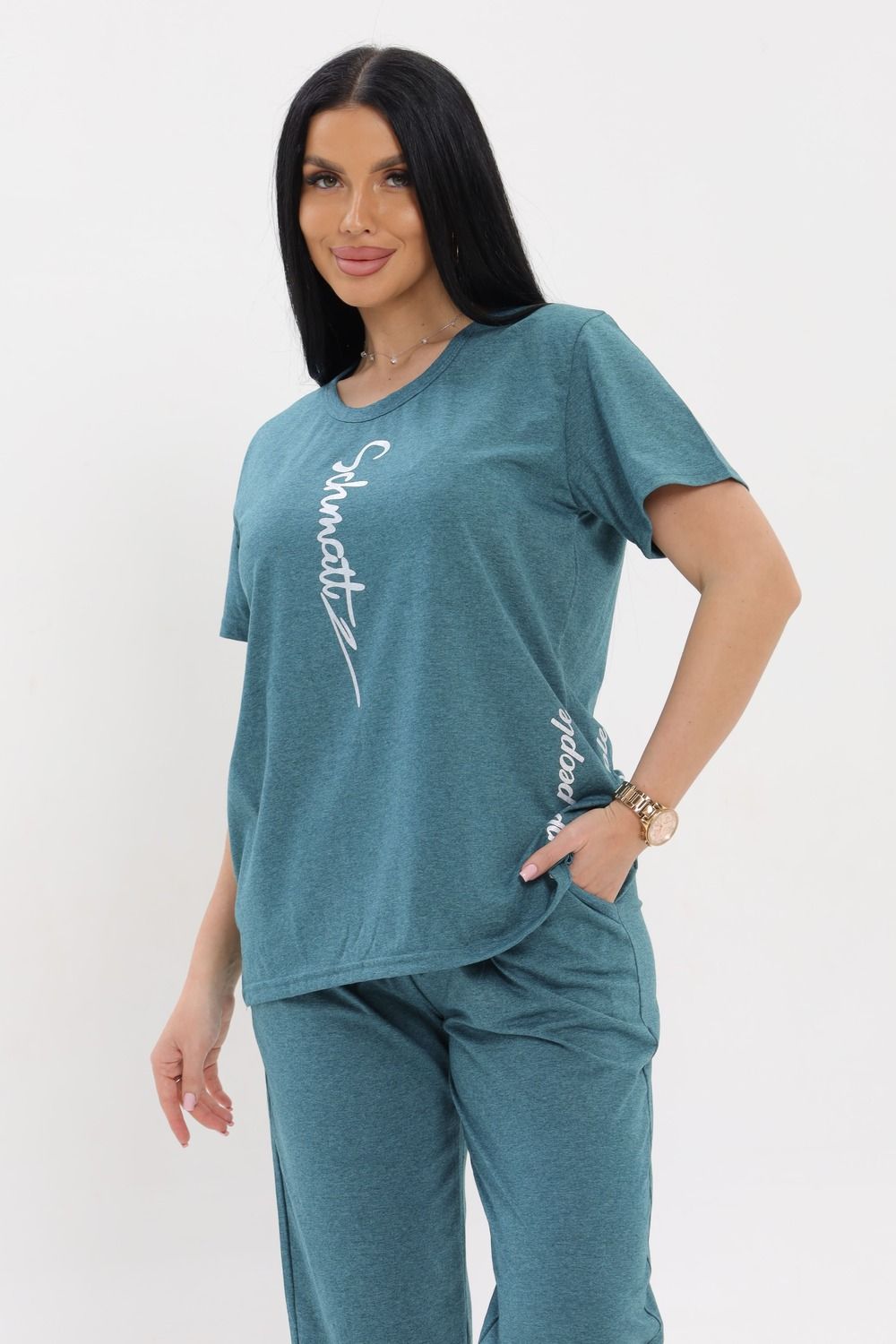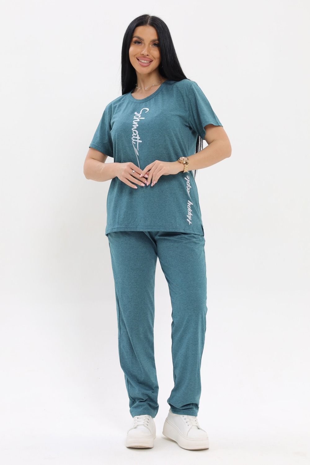 Костюм выполнен из приятной на ощупь трикотажной ткани, которая обеспечивает комфорт в течение всего дня. Легкая текстура материала позволяет коже дышать, что особенно важно для домашнего отдыха. Комплект состоит из свободной футболки и удобных брюк, что делает его идеальным выбором для ежедневного ношения дома. Лаконичный дизайн с надписью на футболке добавляет образу современности. Брюки имеют прямой крой и мягкий пояс, что обеспечивает свободу движений и дополнительный комфорт. Ткань не сковывает движения, легко стирается и быстро сохнет, сохраняя форму даже после многочисленных стирок. Такой домашний костюм отлично подходит для отдыха, сна или выполнения повседневных дел. Современный внешний вид гармонично сочетается с функциональностью, а качество трикотажной ткани гарантирует долговечность изделия. Костюм прекрасно сидит по фигуре и подходит для любого типа телосложения.