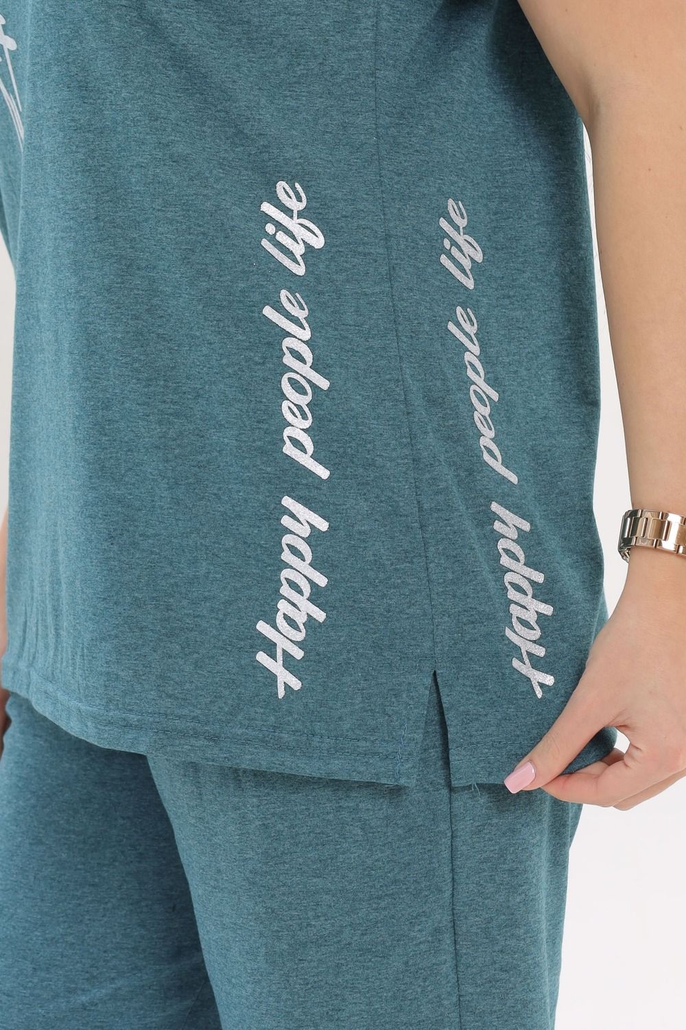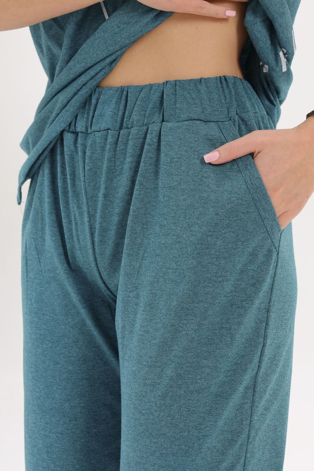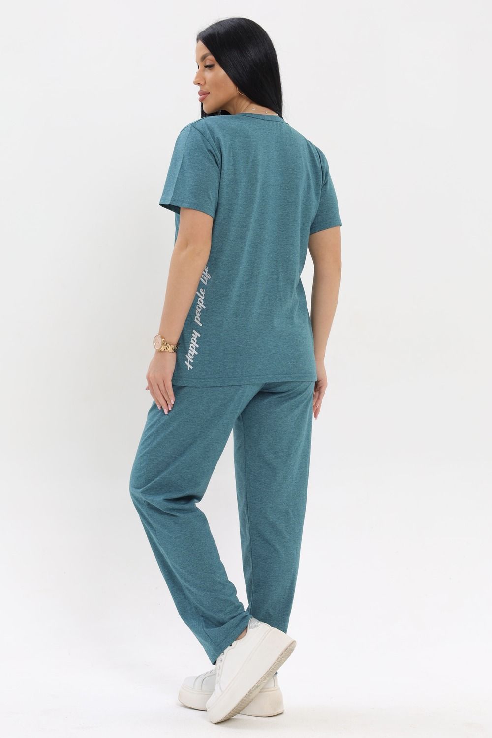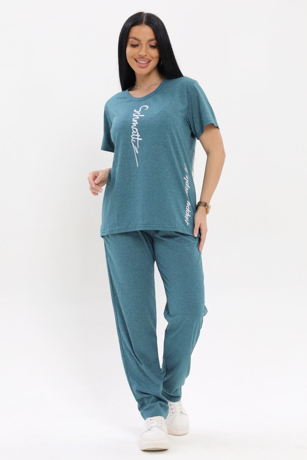 Костюм выполнен из приятной на ощупь трикотажной ткани, которая обеспечивает комфорт в течение всего дня. Легкая текстура материала позволяет коже дышать, что особенно важно для домашнего отдыха. Комплект состоит из свободной футболки и удобных брюк, что делает его идеальным выбором для ежедневного ношения дома. Лаконичный дизайн с надписью на футболке добавляет образу современности. Брюки имеют прямой крой и мягкий пояс, что обеспечивает свободу движений и дополнительный комфорт. Ткань не сковывает движения, легко стирается и быстро сохнет, сохраняя форму даже после многочисленных стирок. Такой домашний костюм отлично подходит для отдыха, сна или выполнения повседневных дел. Современный внешний вид гармонично сочетается с функциональностью, а качество трикотажной ткани гарантирует долговечность изделия. Костюм прекрасно сидит по фигуре и подходит для любого типа телосложения.
