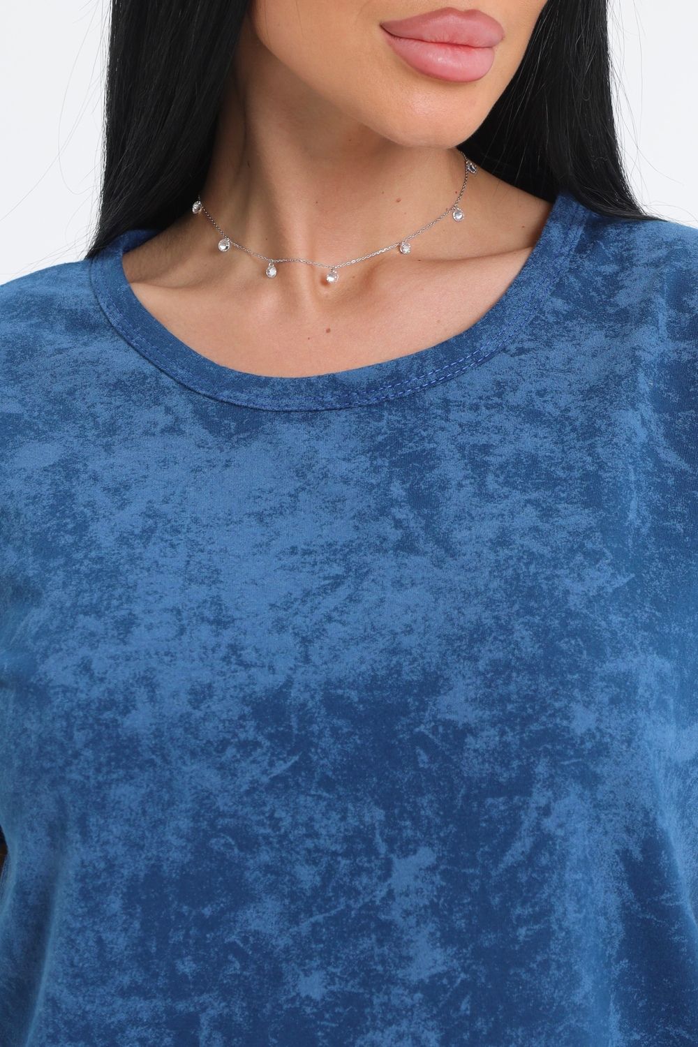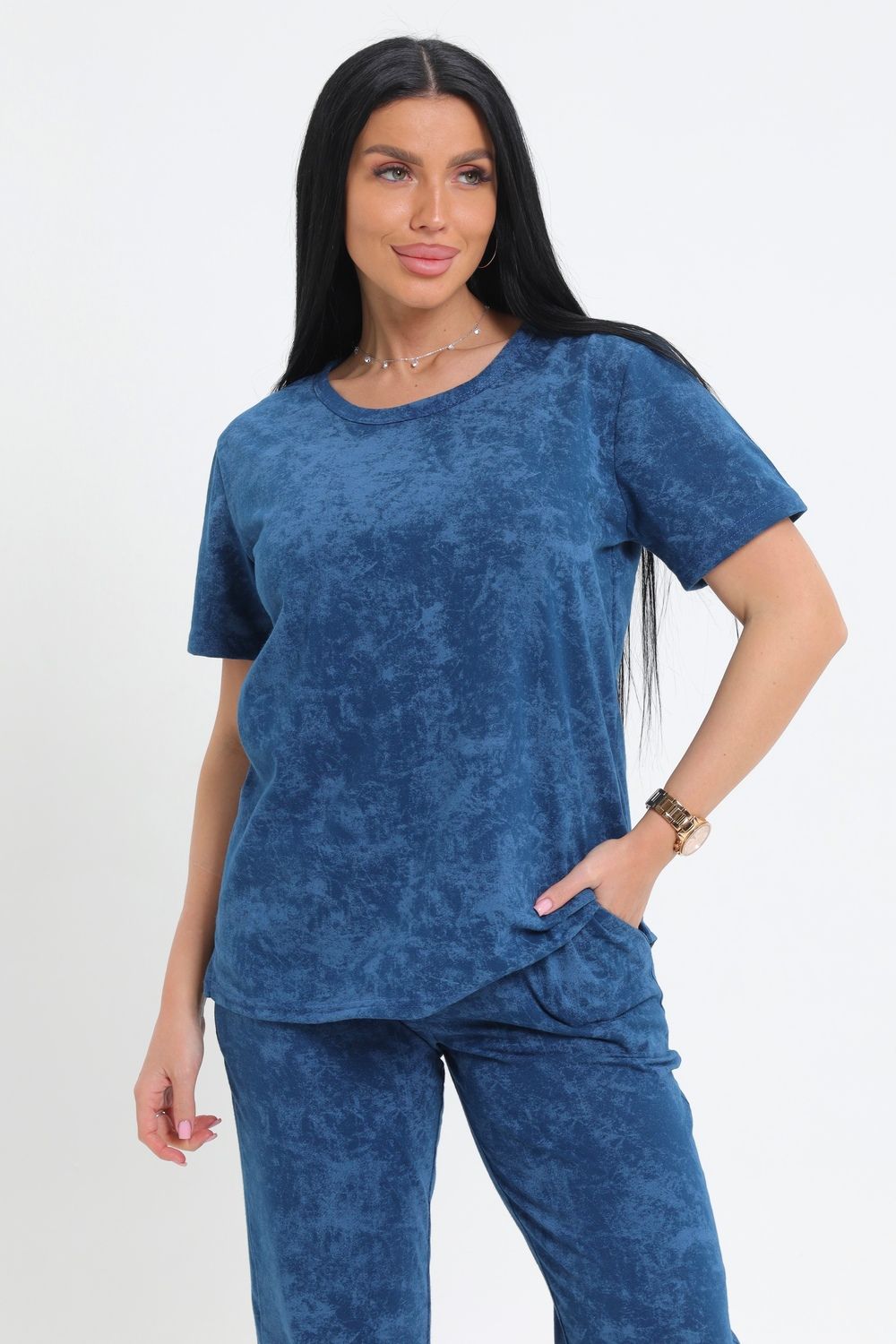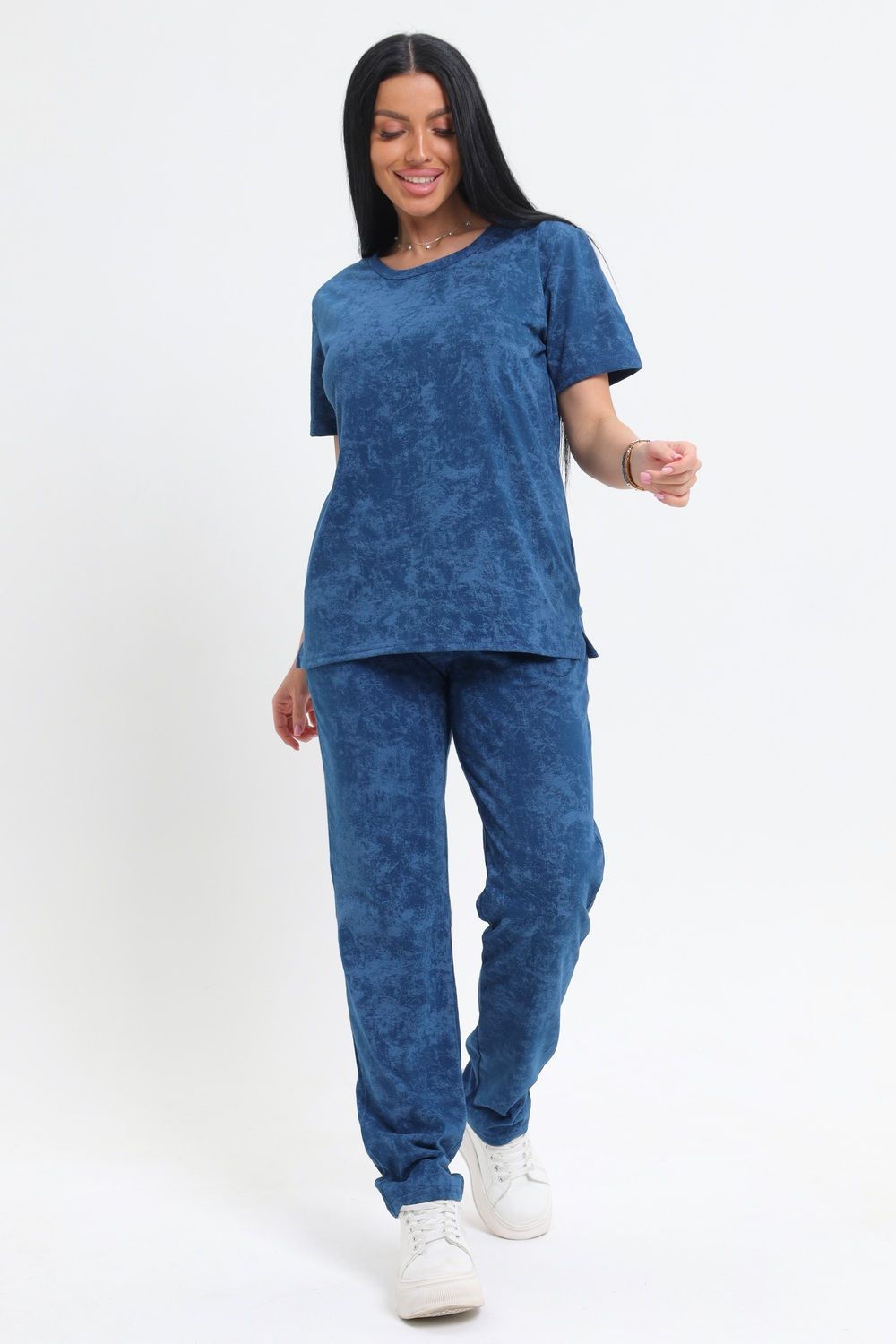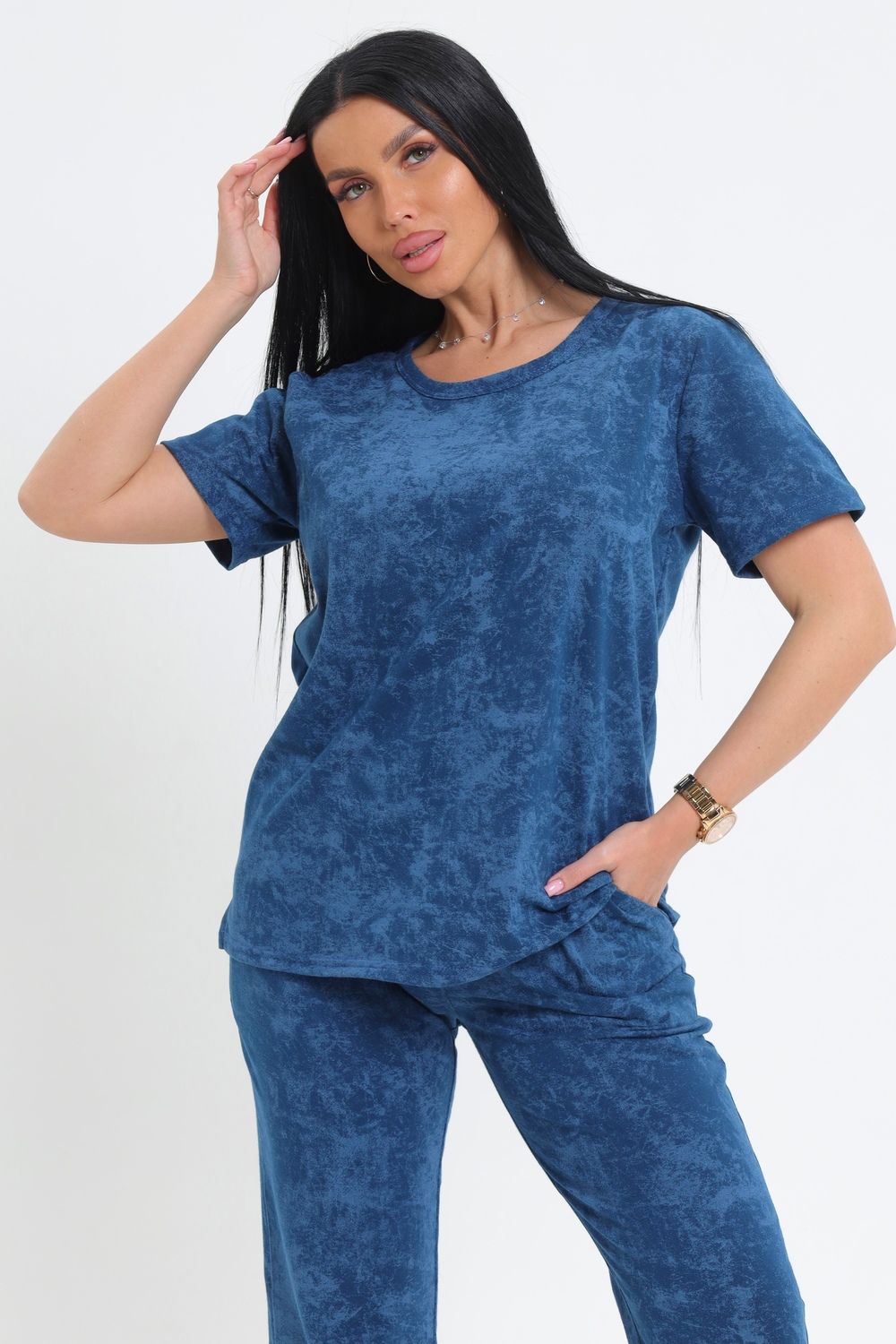 Домашний комплект выполнен из мягкой ткани с имитацией эффекта вареной текстуры, что придает изделию стильный и современный вид. Гладкая поверхность ткани приятна на ощупь, а свободный крой обеспечивает полную свободу движений. Верхняя часть представлена в виде классической футболки с коротким рукавом и круглым вырезом, что делает ее универсальной для ежедневной носки. Брюки имеют прямой силуэт, что позволяет легко сочетать их с разными элементами гардероба.
