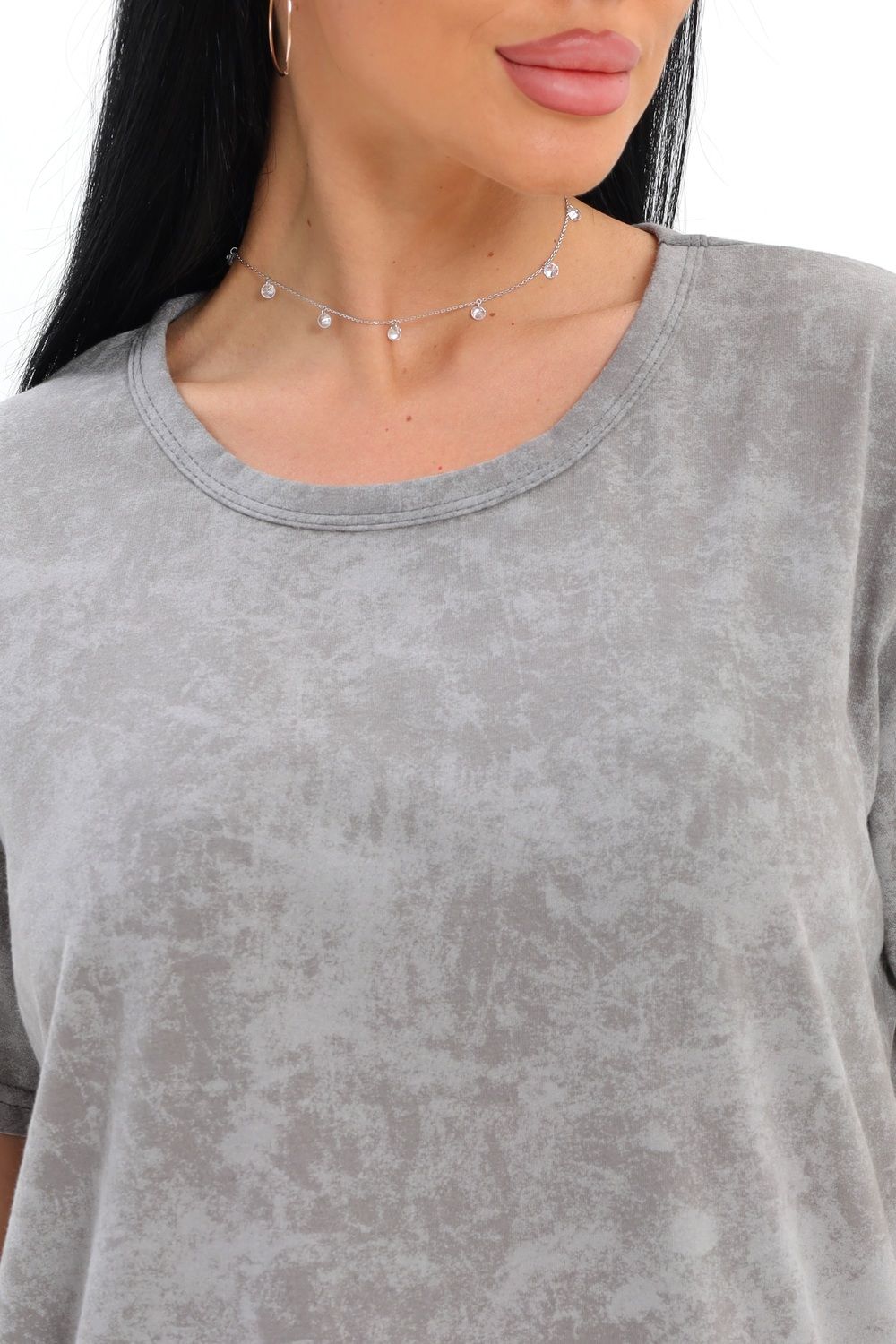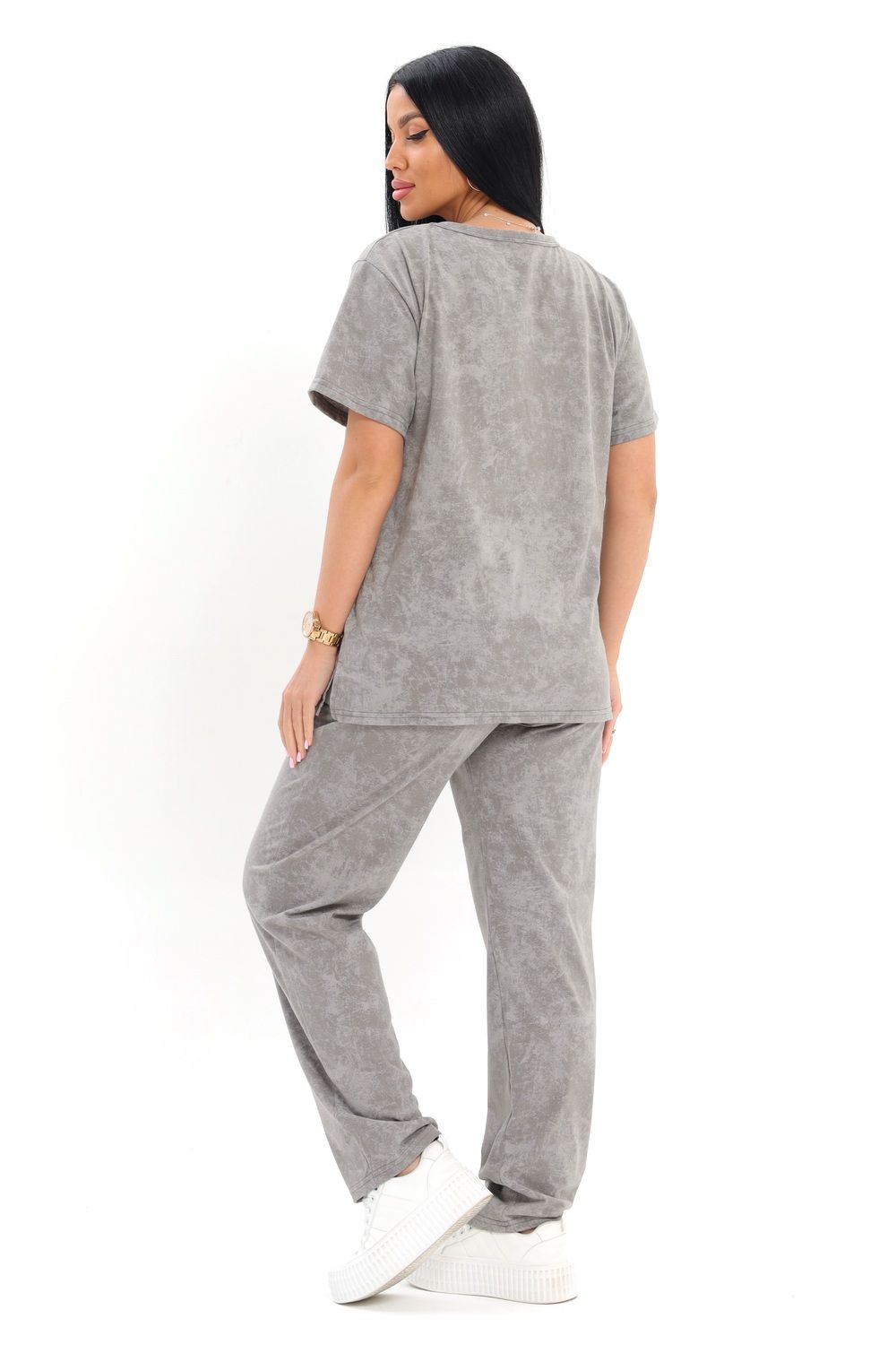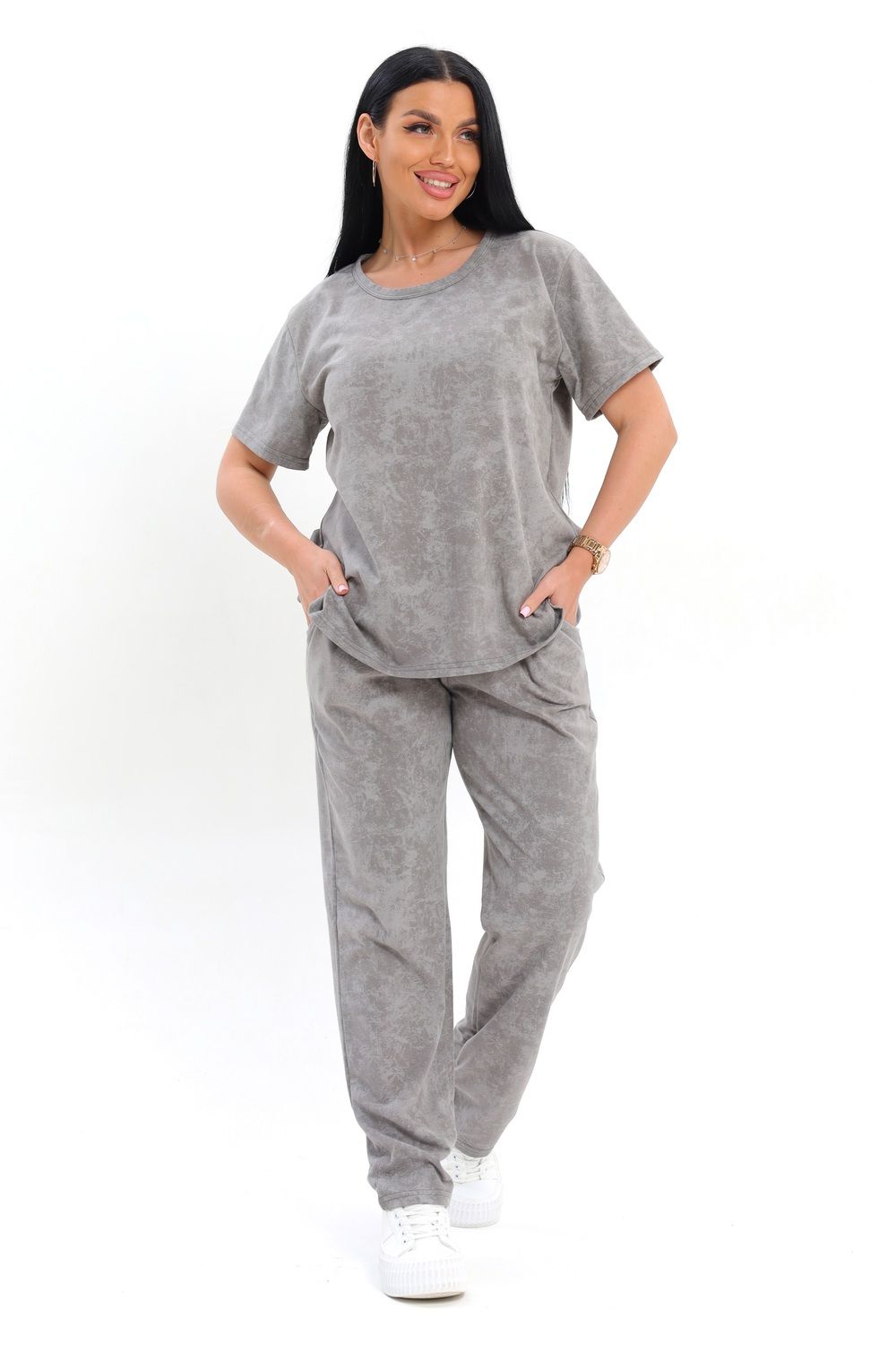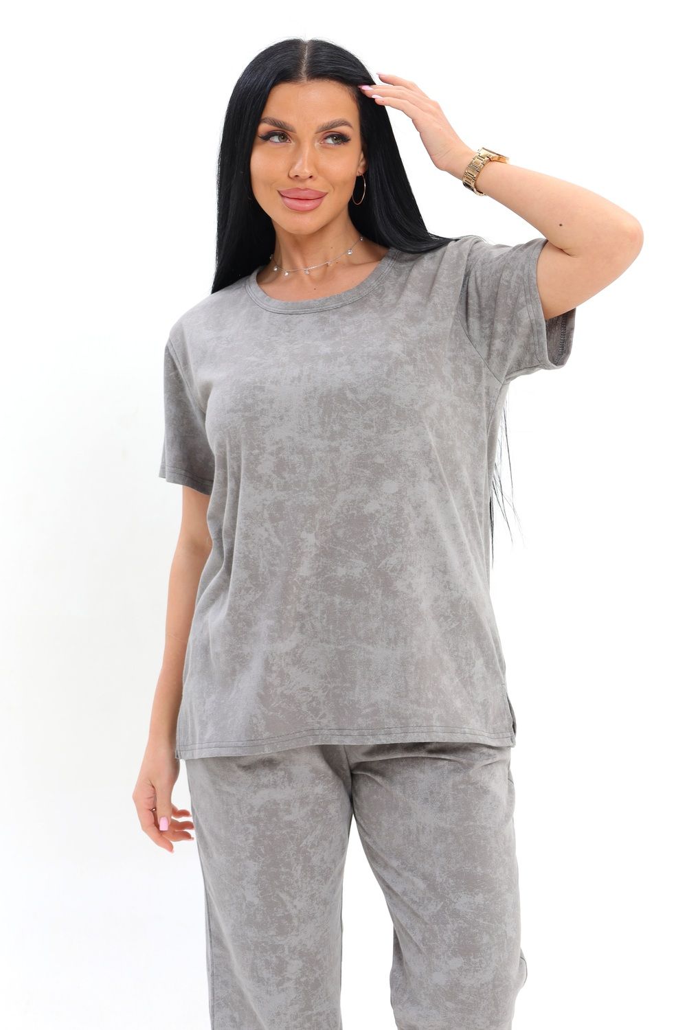 Домашний комплект выполнен из мягкой ткани с имитацией эффекта вареной текстуры, что придает изделию стильный и современный вид. Гладкая поверхность ткани приятна на ощупь, а свободный крой обеспечивает полную свободу движений. Верхняя часть представлена в виде классической футболки с коротким рукавом и круглым вырезом, что делает ее универсальной для ежедневной носки. Брюки имеют прямой силуэт, что позволяет легко сочетать их с разными элементами гардероба.