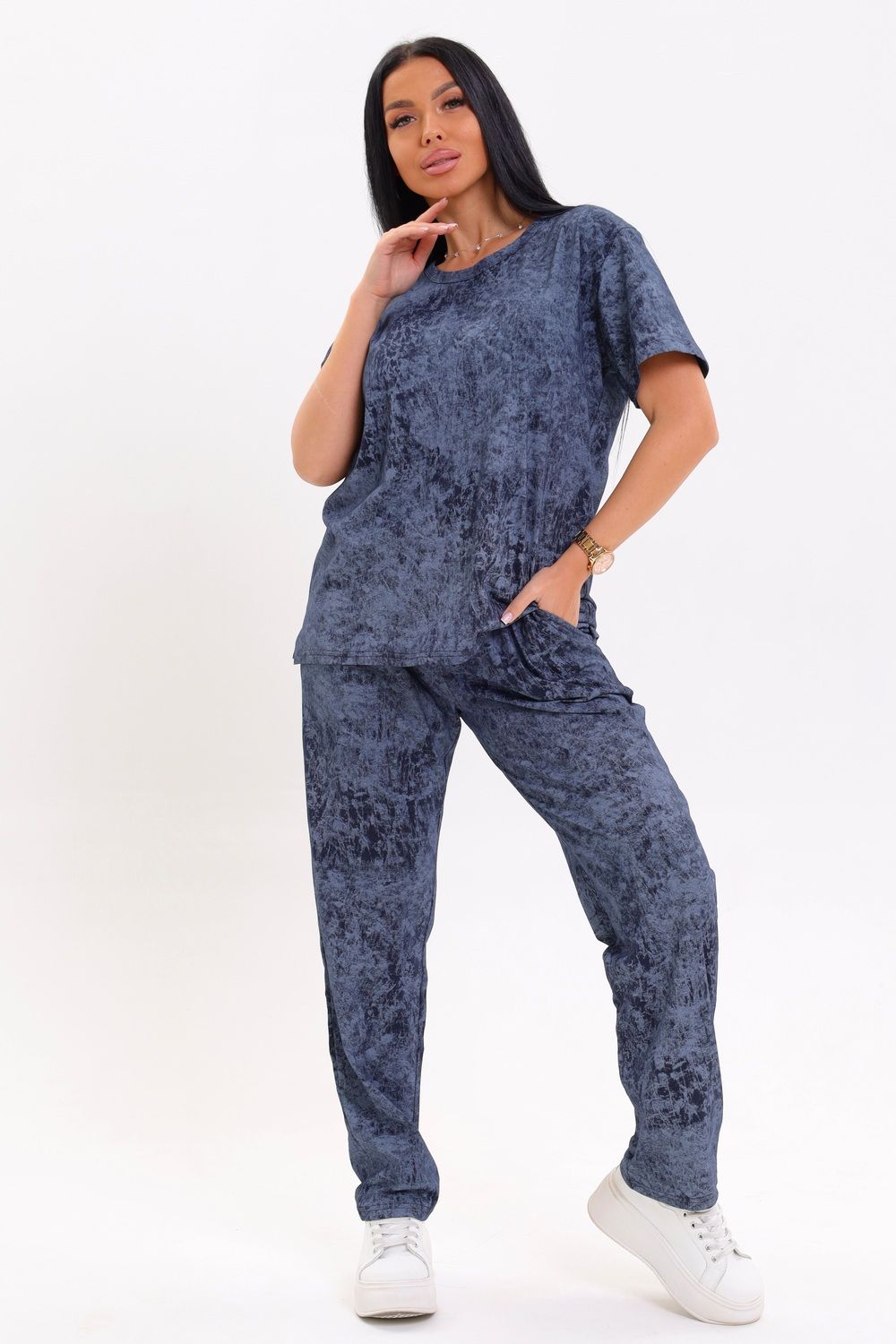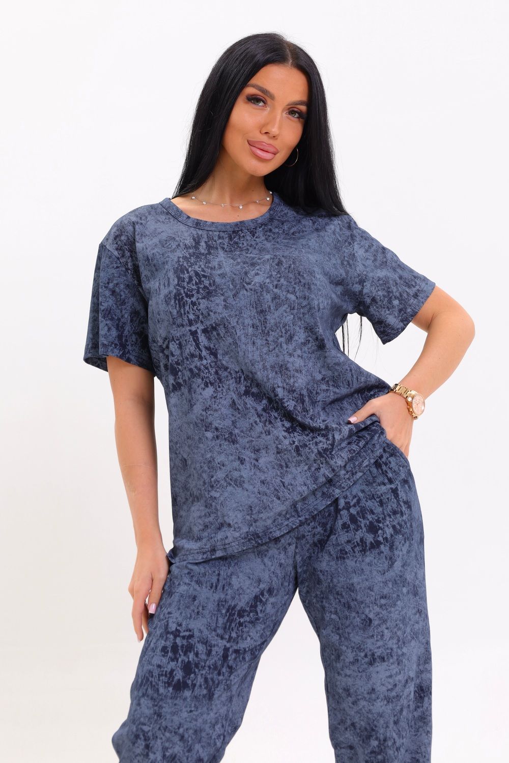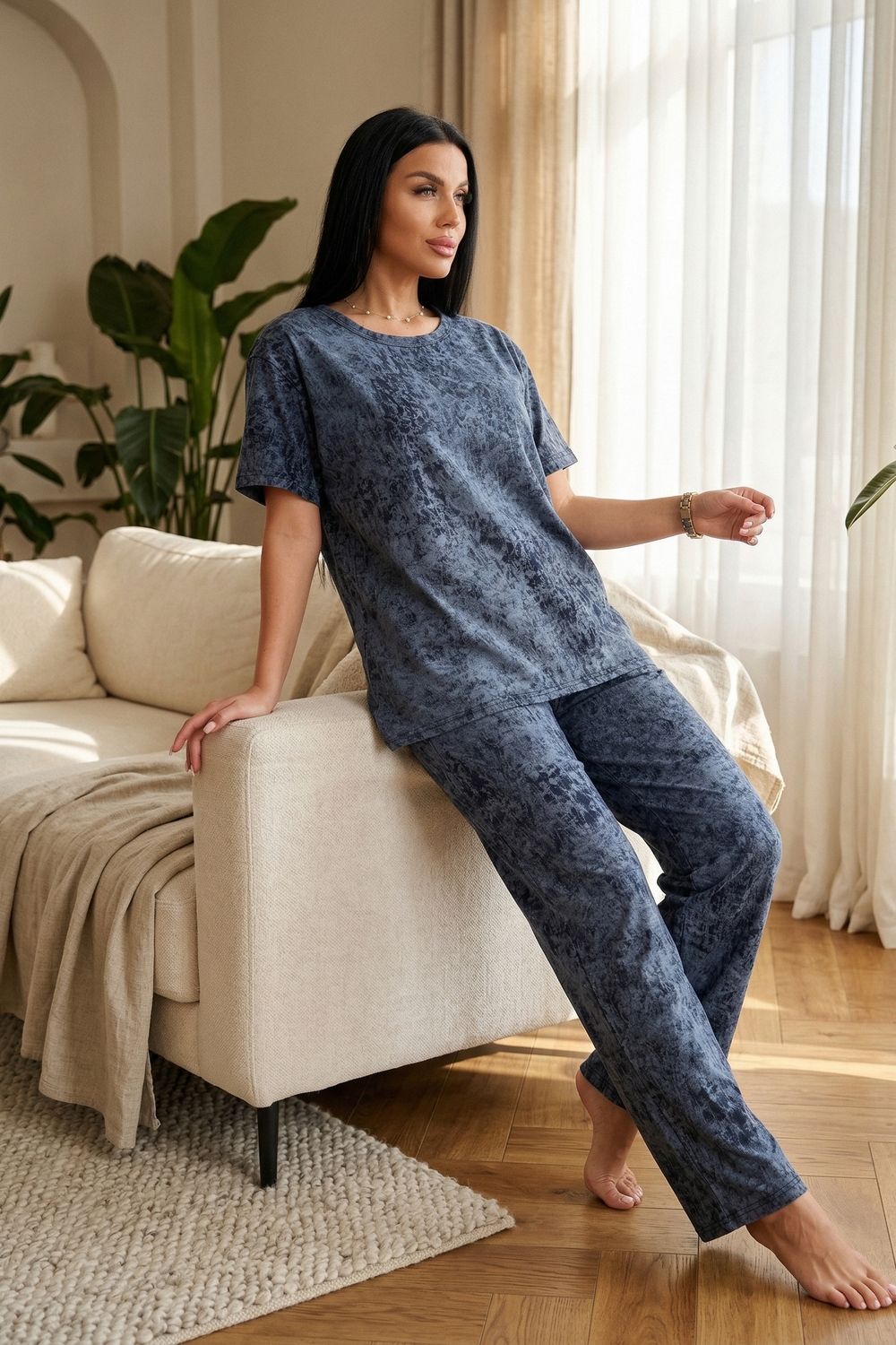 Домашний комплект выполнен из мягкой ткани с имитацией эффекта вареной текстуры, что придает изделию стильный и современный вид. Гладкая поверхность ткани приятна на ощупь, а свободный крой обеспечивает полную свободу движений. Верхняя часть представлена в виде классической футболки с коротким рукавом и круглым вырезом, что делает ее универсальной для ежедневной носки. Брюки имеют прямой силуэт, что позволяет легко сочетать их с разными элементами гардероба.