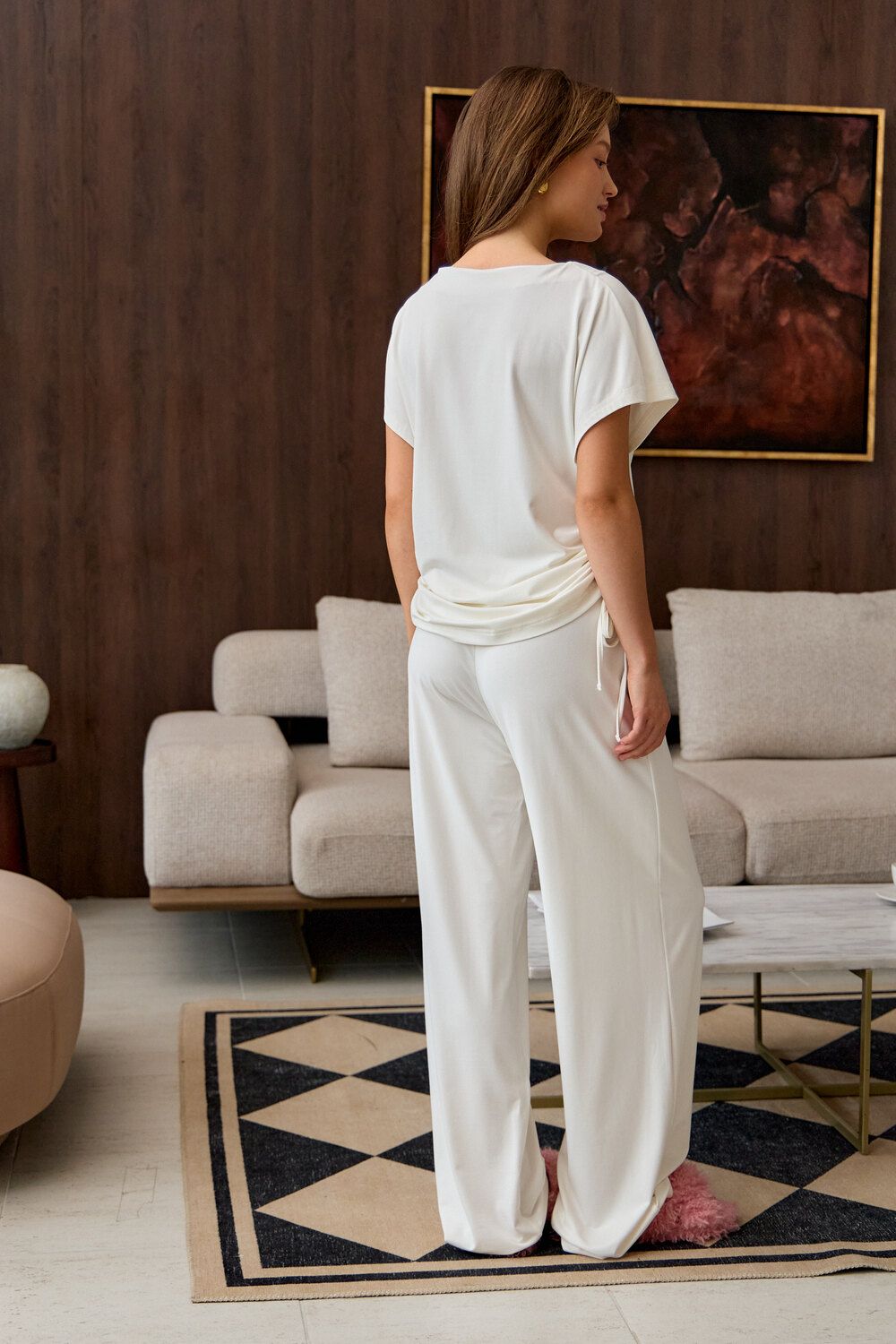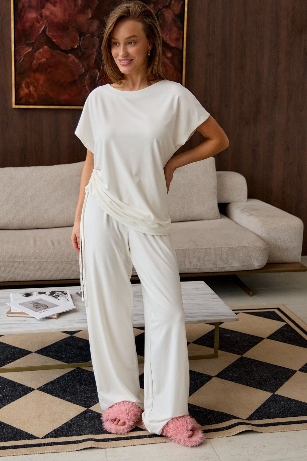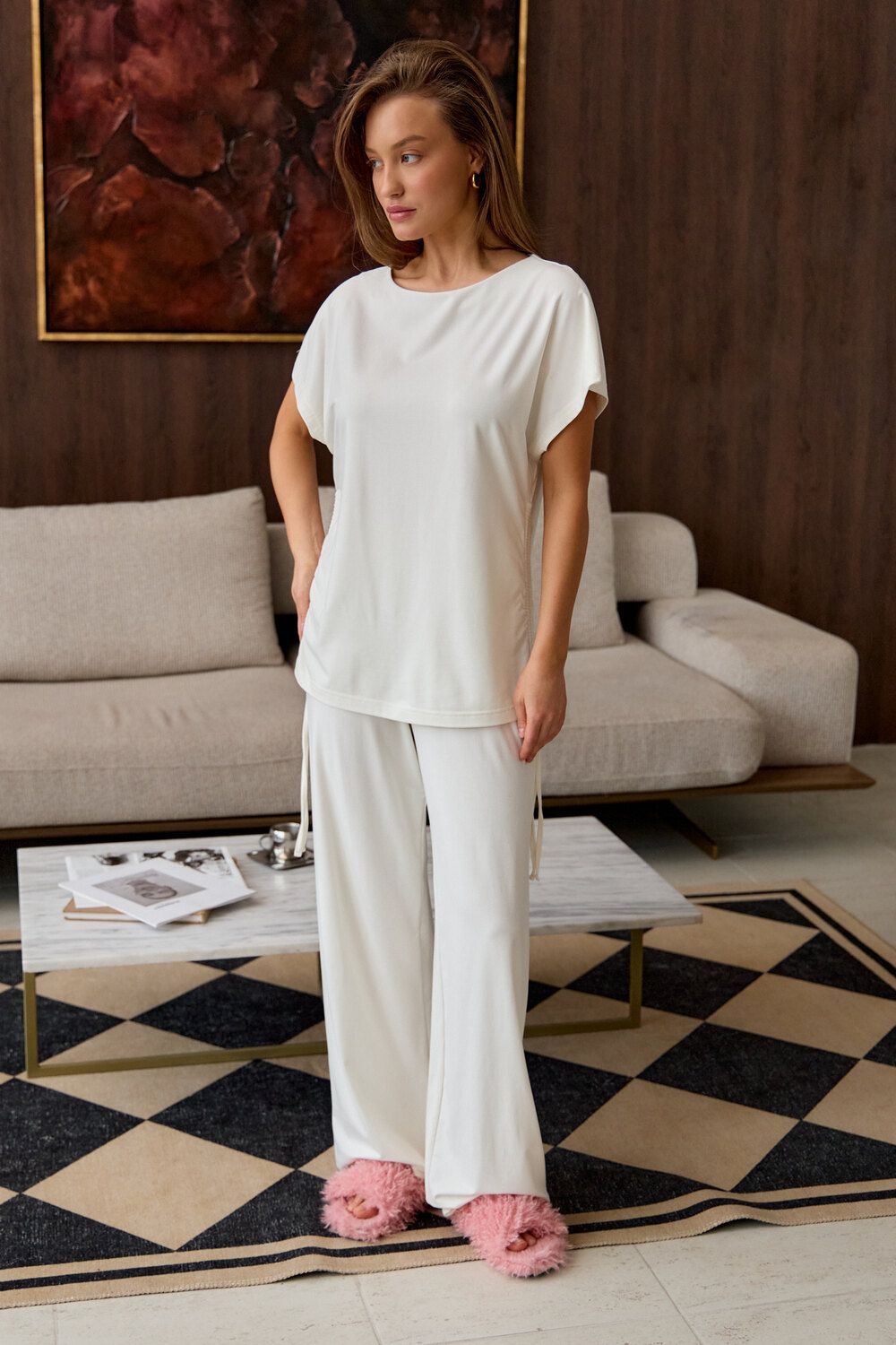 Представляем вам стильный комплект домашней пижамы женской, который станет незаменимым в вашем гардеробе. Этот костюм включает в себя футболку с завязками и с брюками палаццо, выполненный из премиальной вискозы, что обеспечивает невероятный комфорт и приятные ощущения на коже.
