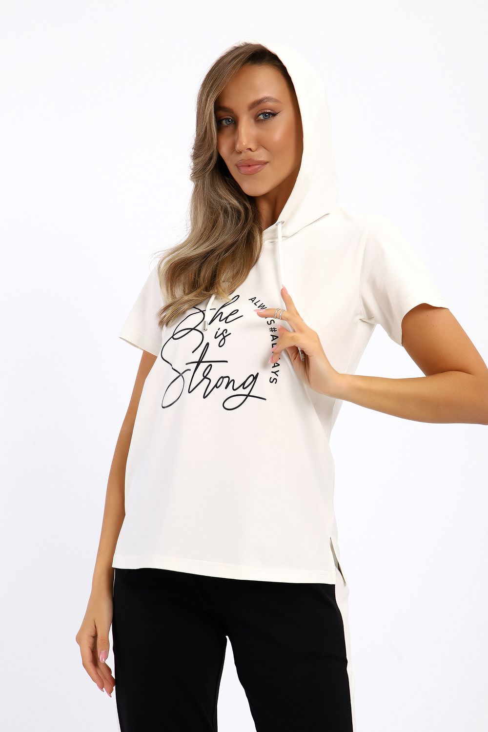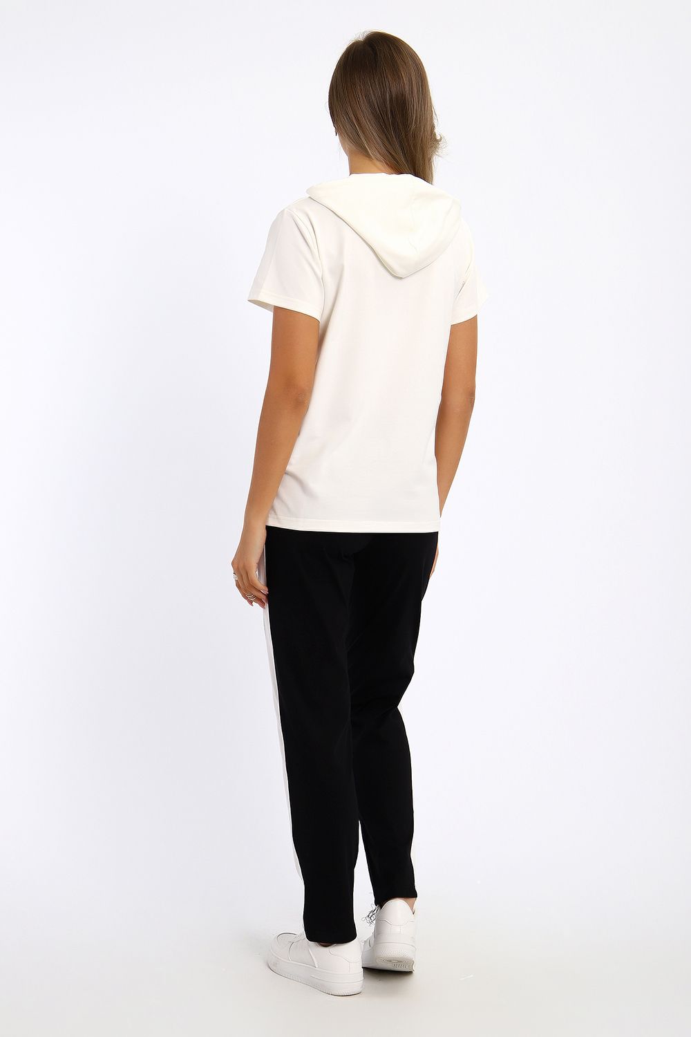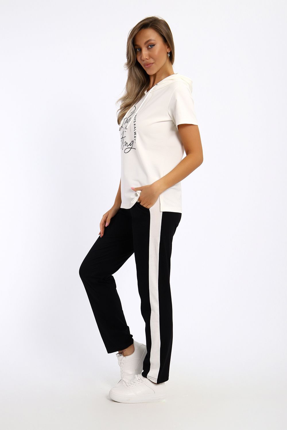 Удобный, женственный трикотажный костюм со спортивной ноткой подарит вам чувство комфорта и позволит выглядеть сногсшибательно в любой ситуации! Костюм прекрасно подойдет для занятий спортом, пробежек или прогулок! Кофта белого цвета, с надписью латинскими буквами в цвет брюк, имеет капюшон, способный защитить волосы от солнечных лучей, ветра или дождя. Объем капюшона регулирует изящный шнурок. На брюках имеются лампасы белого цвета, гармонирующие с цветом кофты.
