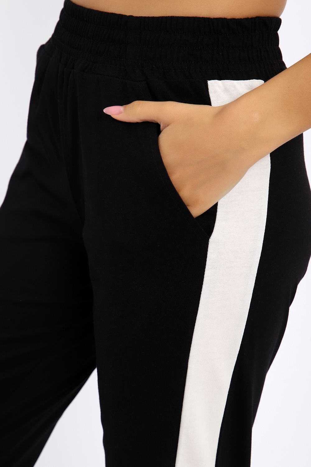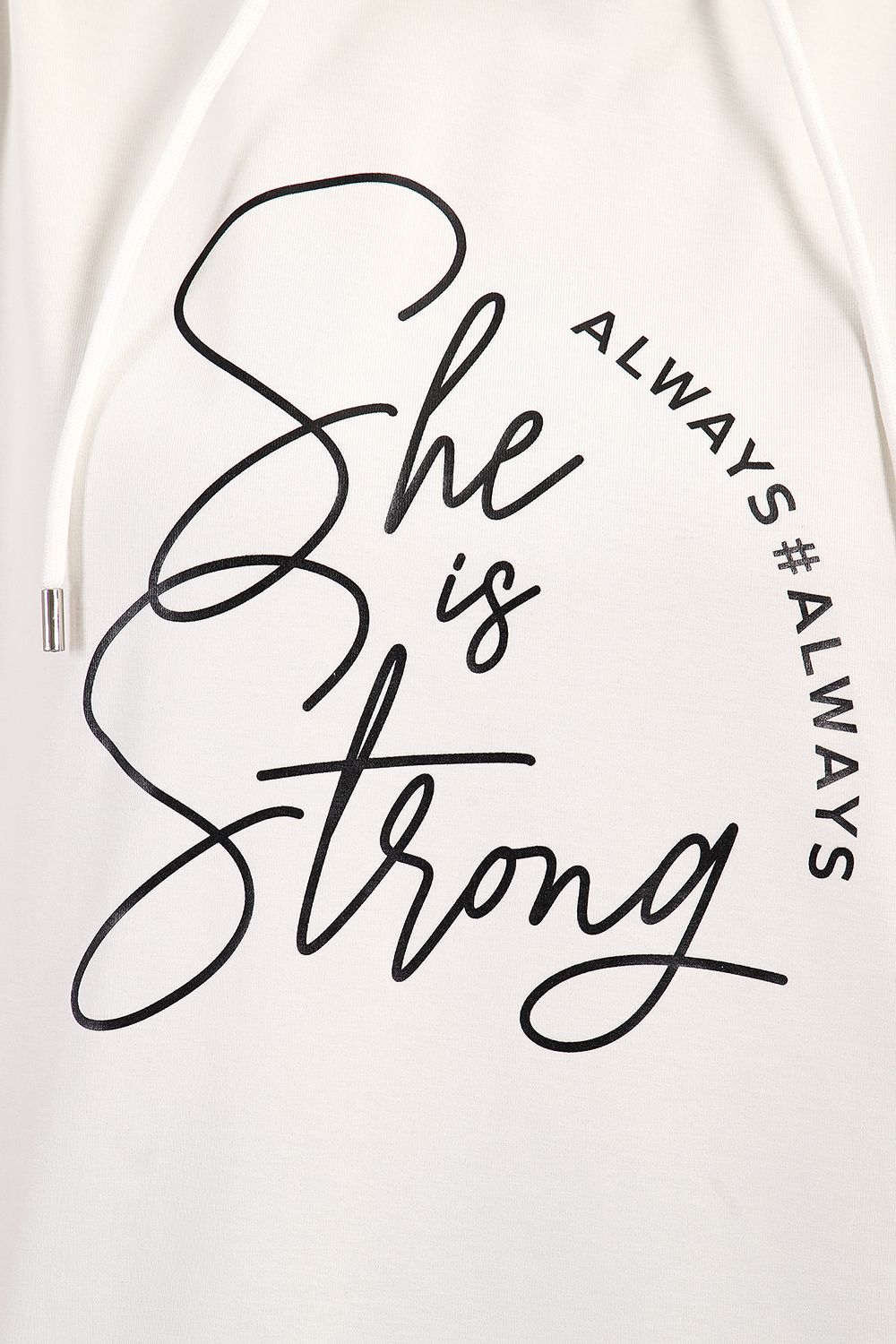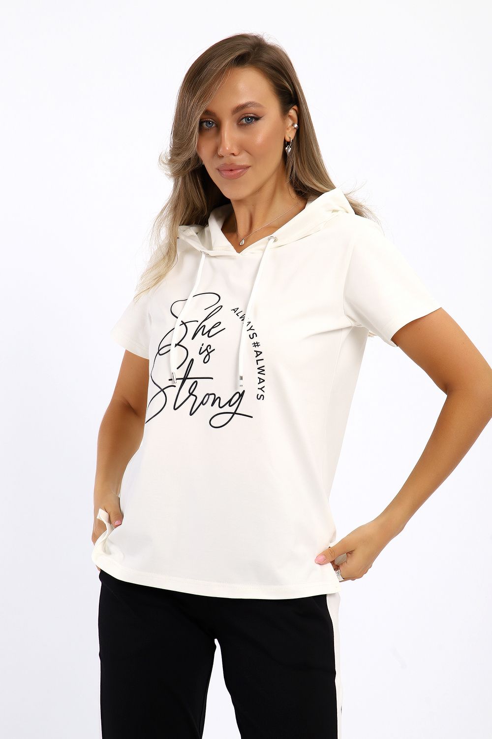 Удобный, женственный трикотажный костюм со спортивной ноткой подарит вам чувство комфорта и позволит выглядеть сногсшибательно в любой ситуации! Костюм прекрасно подойдет для занятий спортом, пробежек или прогулок! Кофта белого цвета, с надписью латинскими буквами в цвет брюк, имеет капюшон, способный защитить волосы от солнечных лучей, ветра или дождя. Объем капюшона регулирует изящный шнурок. На брюках имеются лампасы белого цвета, гармонирующие с цветом кофты.