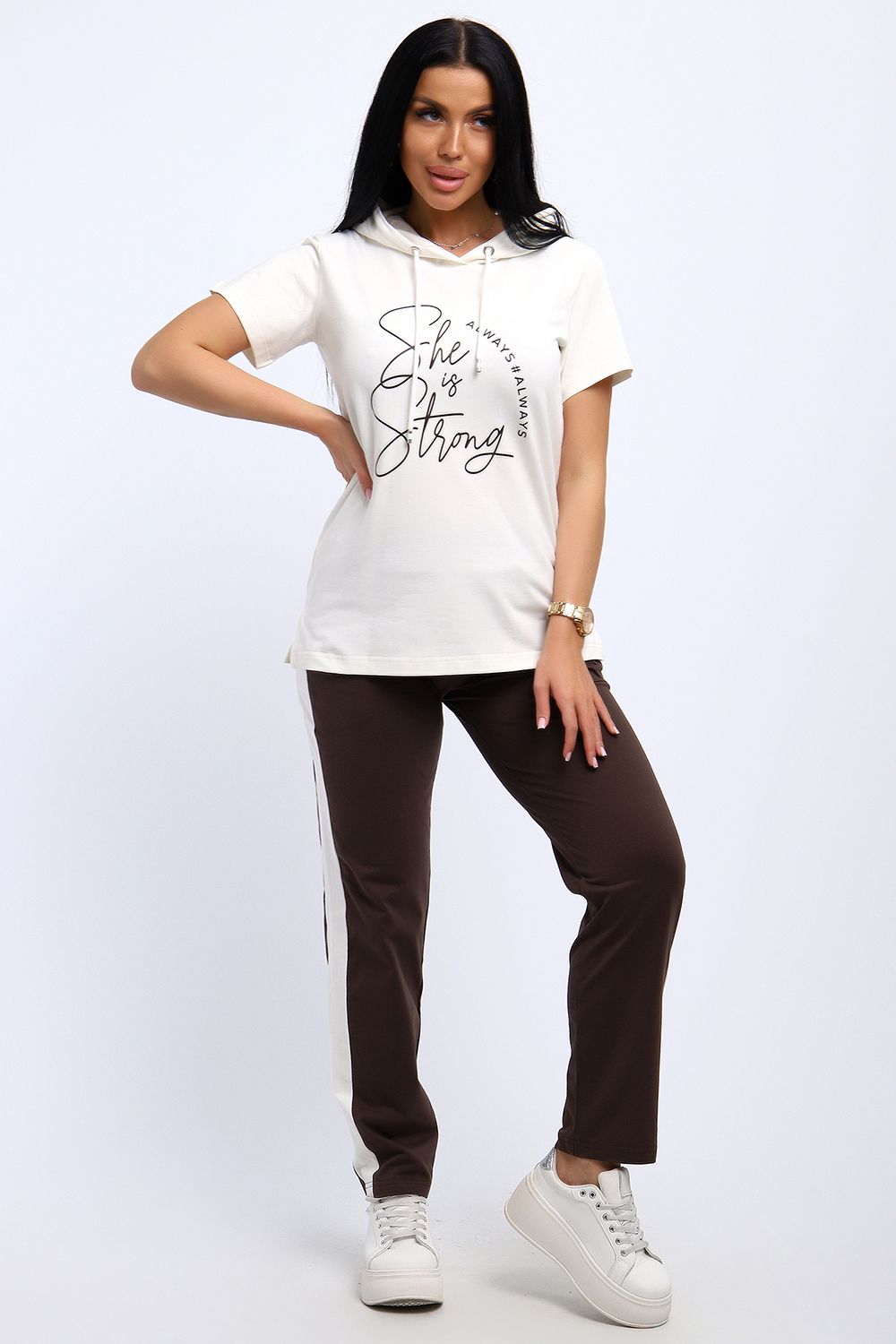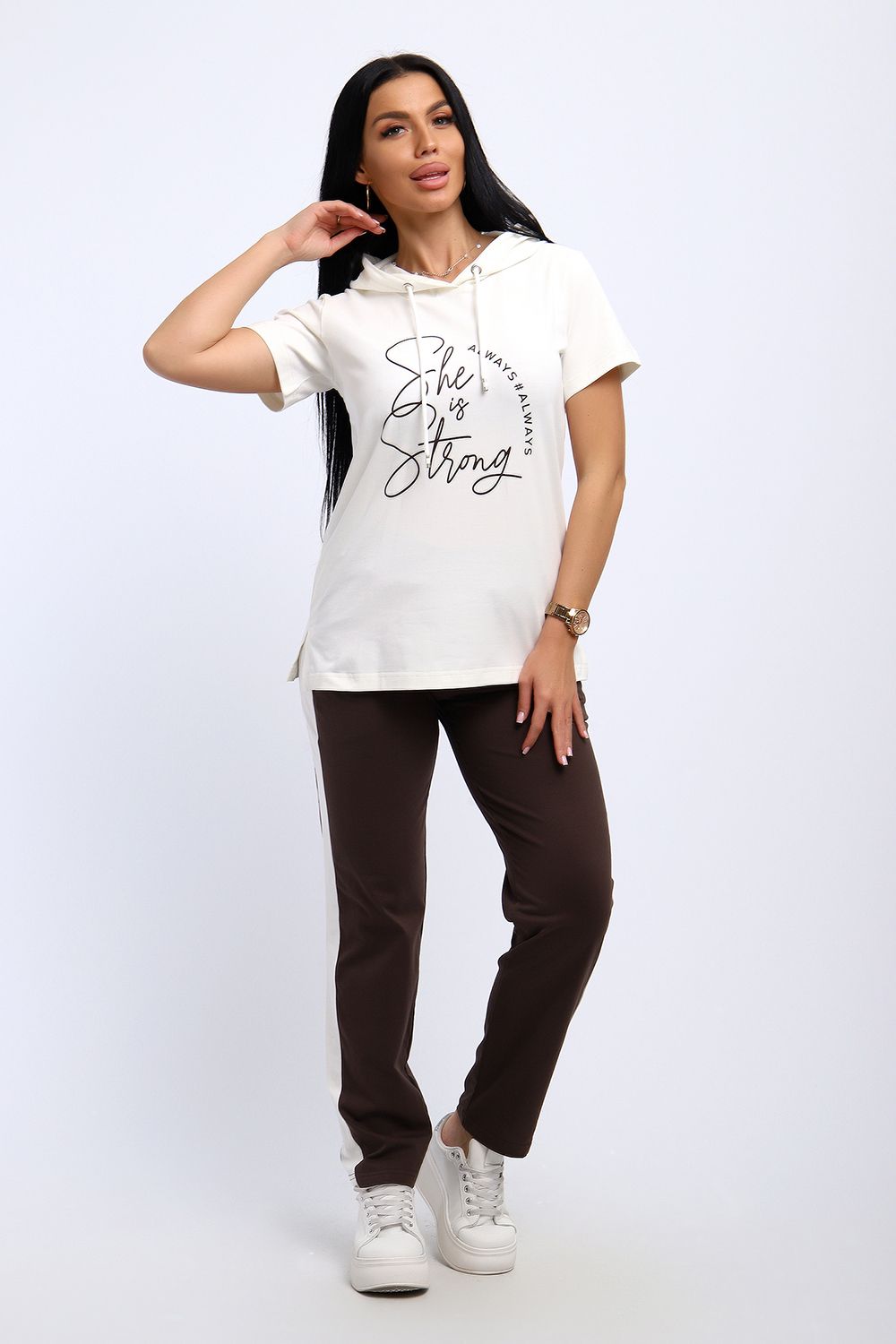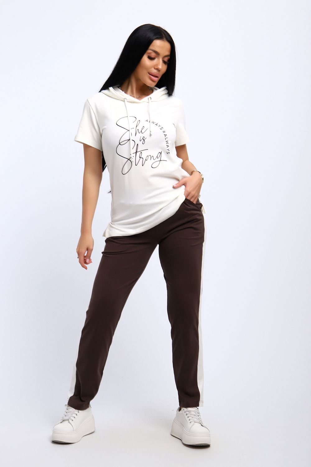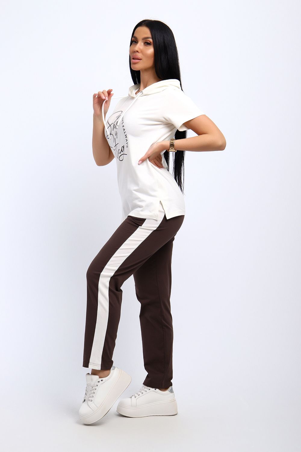 Удобный, женственный трикотажный костюм со спортивной ноткой подарит вам чувство комфорта и позволит выглядеть сногсшибательно в любой ситуации! Костюм прекрасно подойдет для занятий спортом, пробежек или прогулок! Кофта белого цвета, с надписью латинскими буквами в цвет брюк, имеет капюшон, способный защитить волосы от солнечных лучей, ветра или дождя. Объем капюшона регулирует изящный шнурок. На брюках имеются лампасы белого цвета, гармонирующие с цветом кофты.