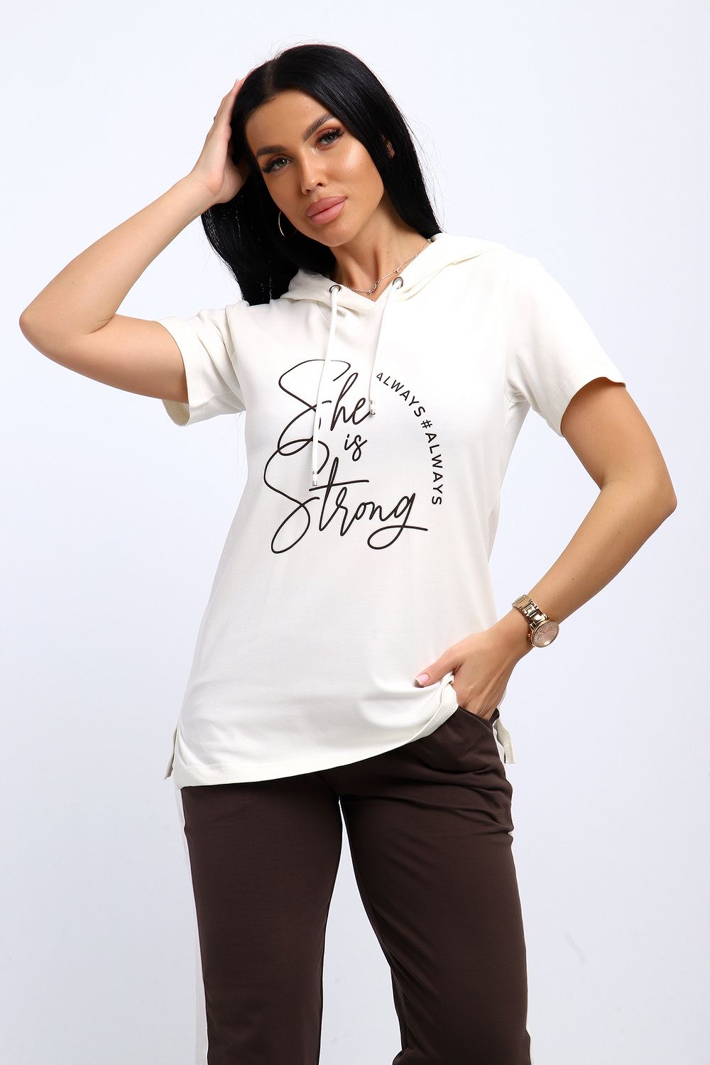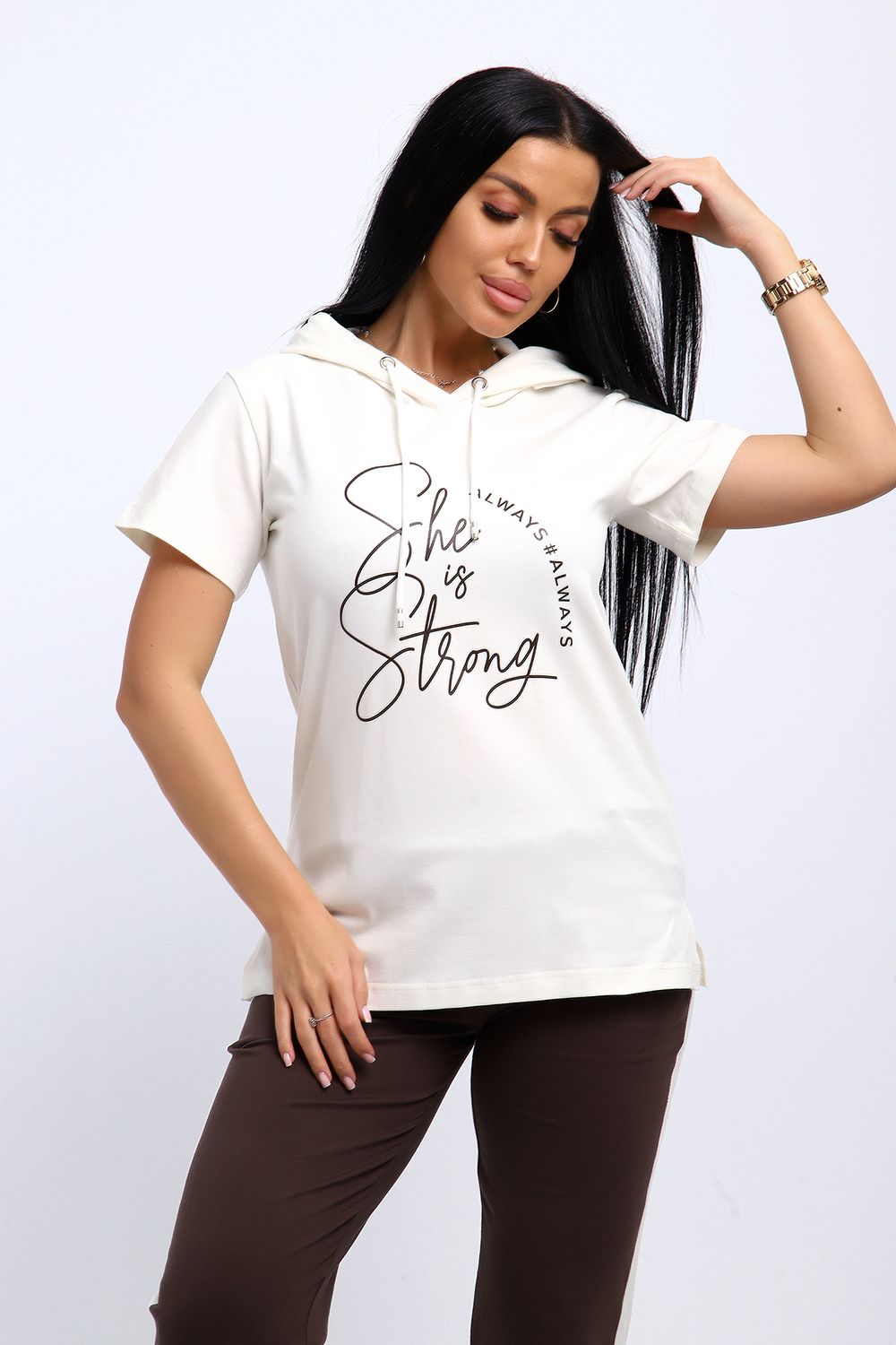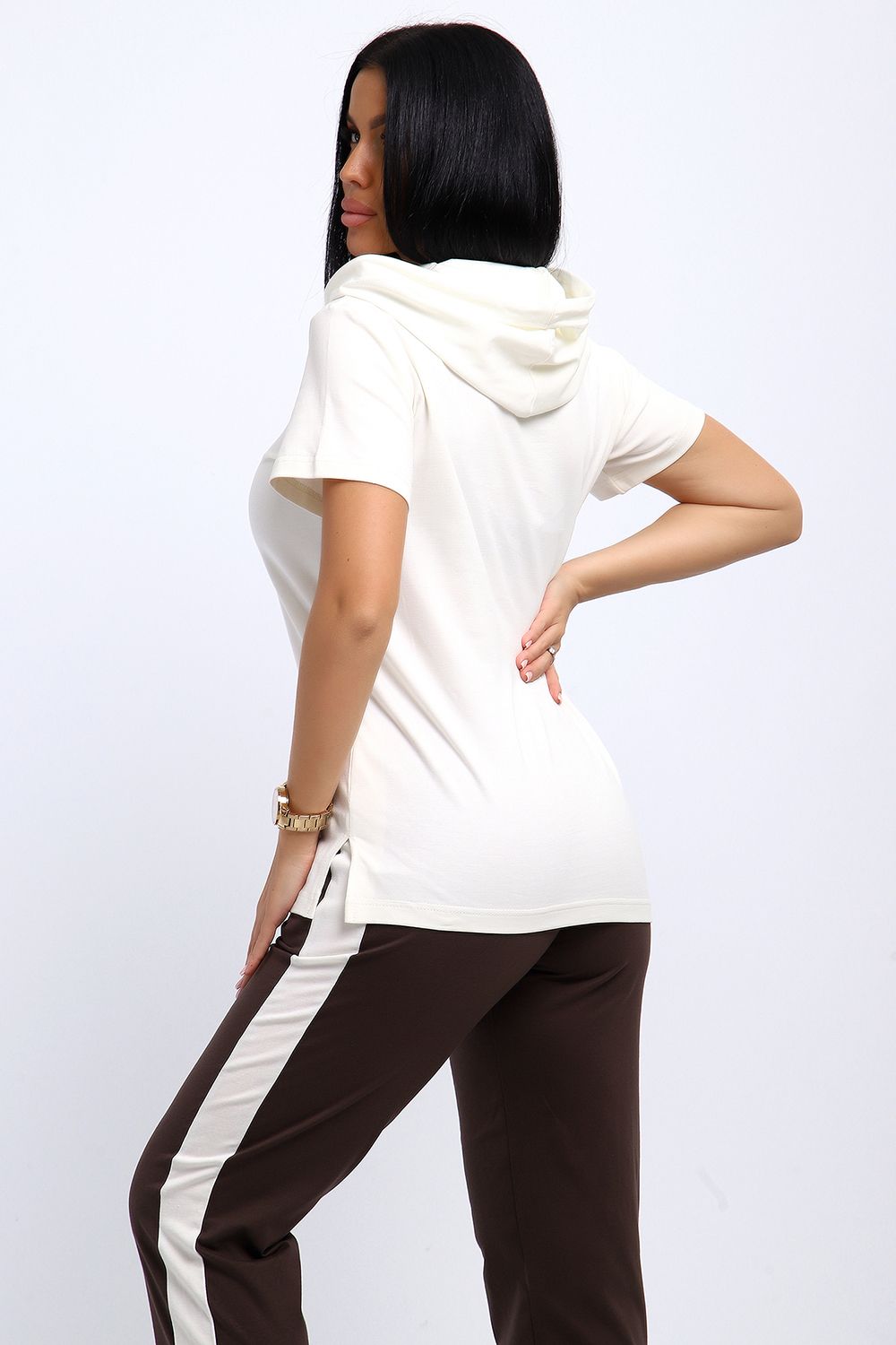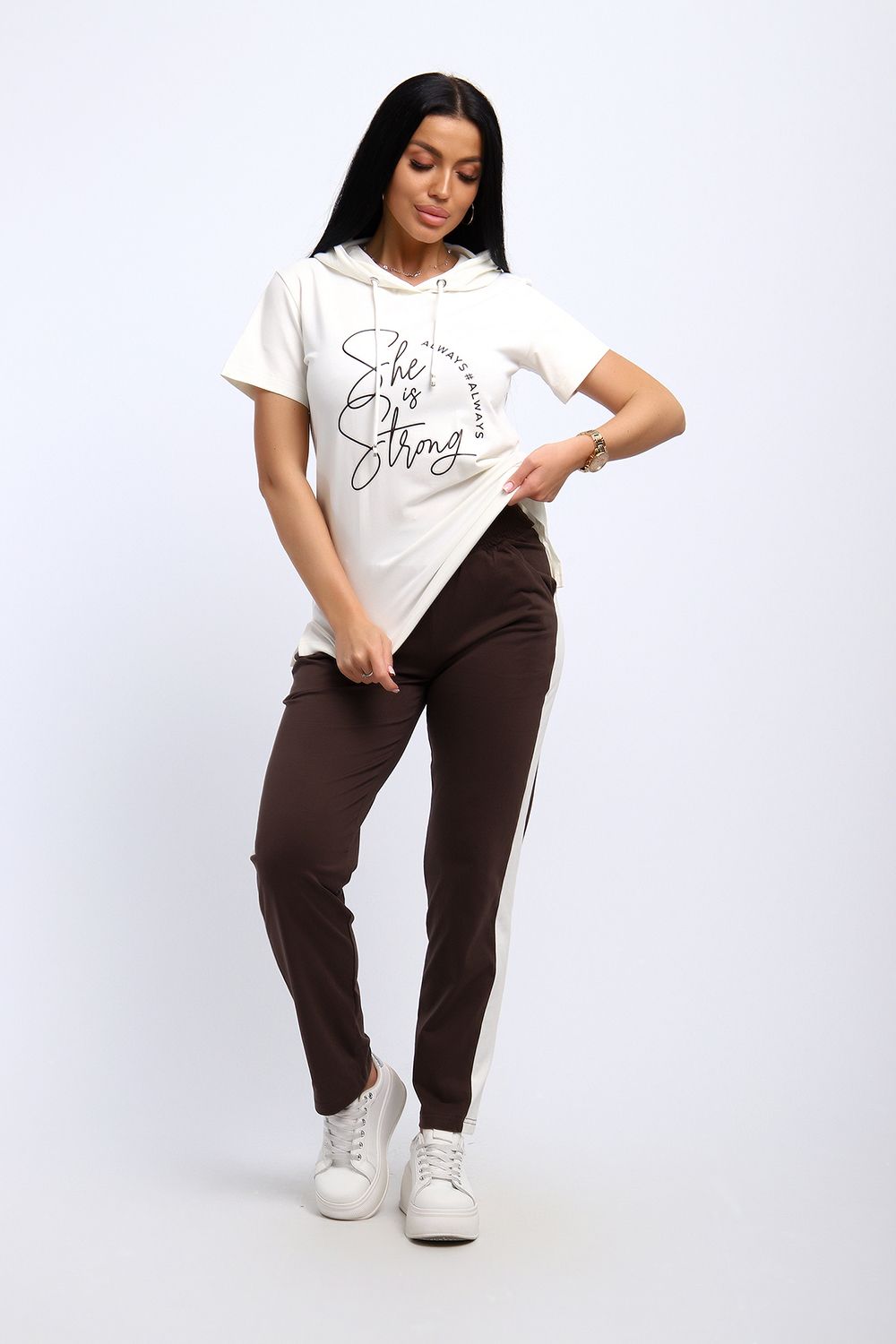 Удобный, женственный трикотажный костюм со спортивной ноткой подарит вам чувство комфорта и позволит выглядеть сногсшибательно в любой ситуации! Костюм прекрасно подойдет для занятий спортом, пробежек или прогулок! Кофта белого цвета, с надписью латинскими буквами в цвет брюк, имеет капюшон, способный защитить волосы от солнечных лучей, ветра или дождя. Объем капюшона регулирует изящный шнурок. На брюках имеются лампасы белого цвета, гармонирующие с цветом кофты.