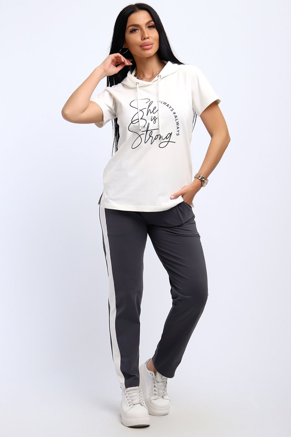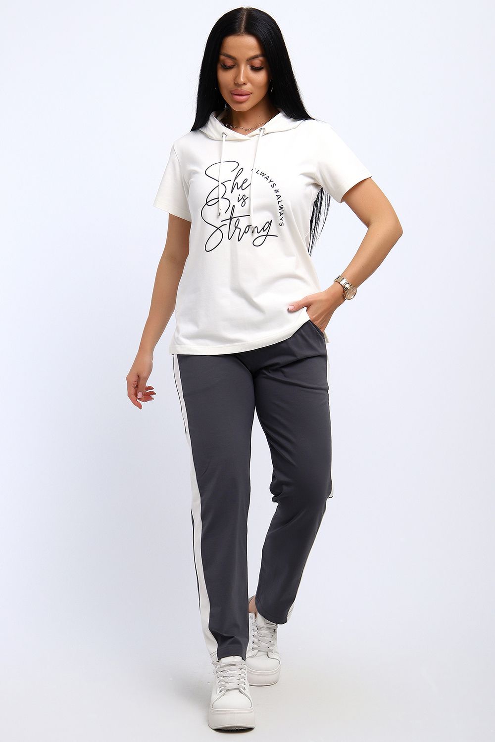 Удобный, женственный трикотажный костюм со спортивной ноткой подарит вам чувство комфорта и позволит выглядеть сногсшибательно в любой ситуации! Костюм прекрасно подойдет для занятий спортом, пробежек или прогулок! Кофта белого цвета, с надписью латинскими буквами в цвет брюк, имеет капюшон, способный защитить волосы от солнечных лучей, ветра или дождя. Объем капюшона регулирует изящный шнурок. На брюках имеются лампасы белого цвета, гармонирующие с цветом кофты.
