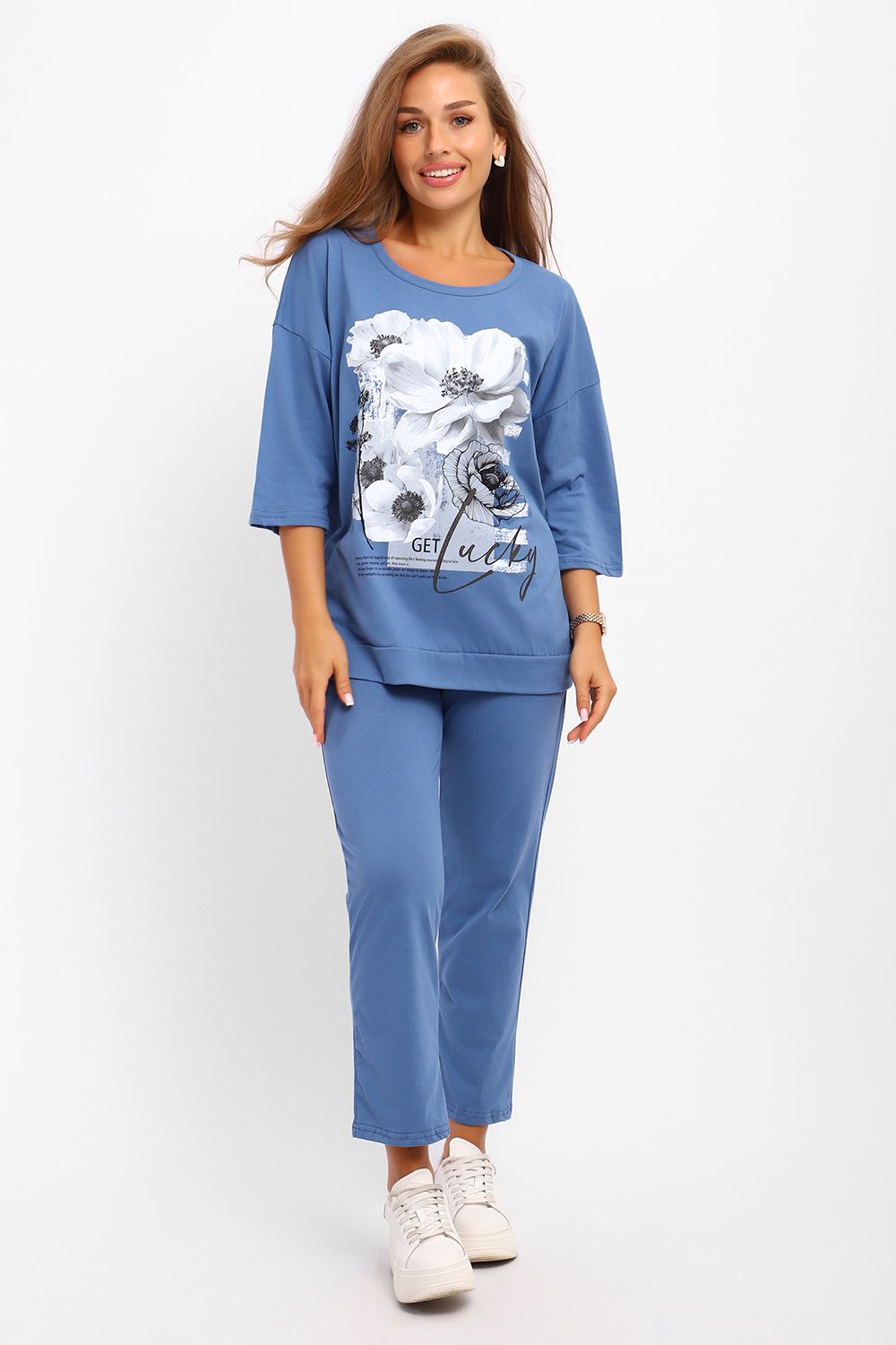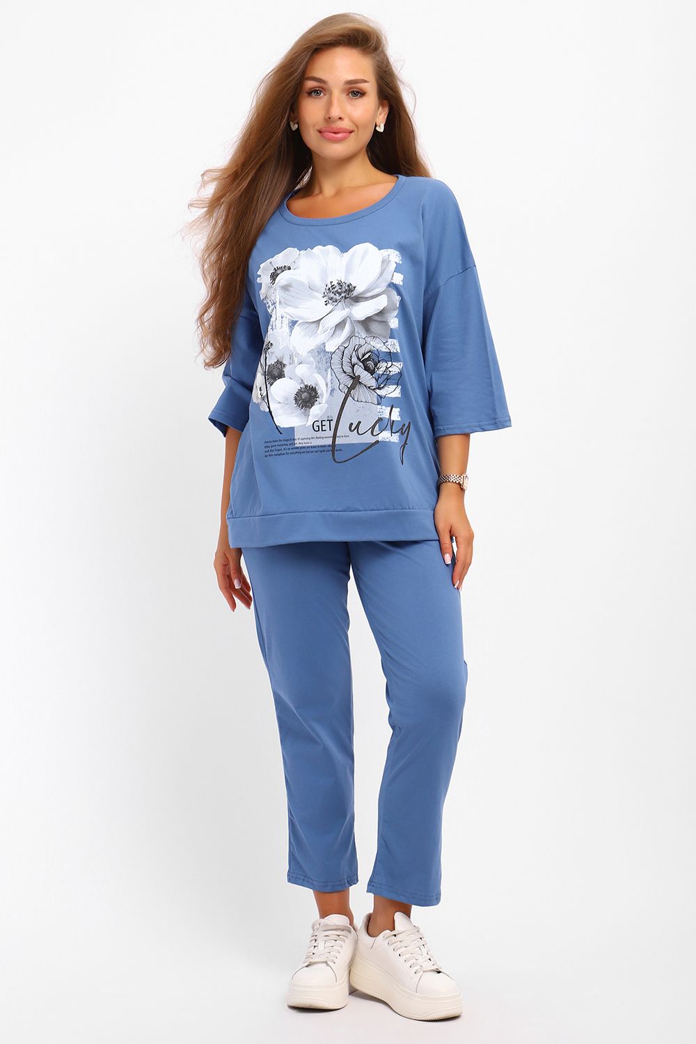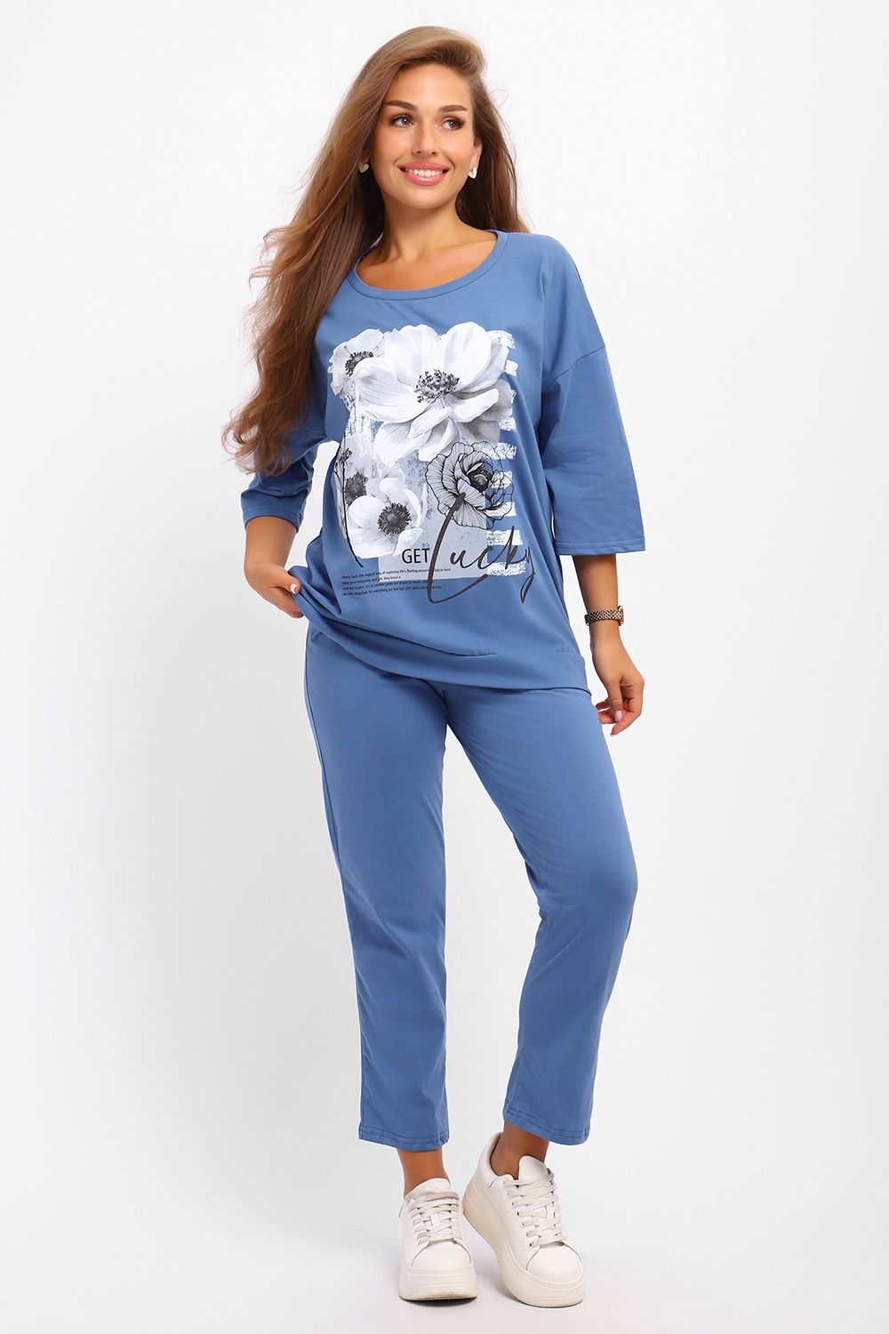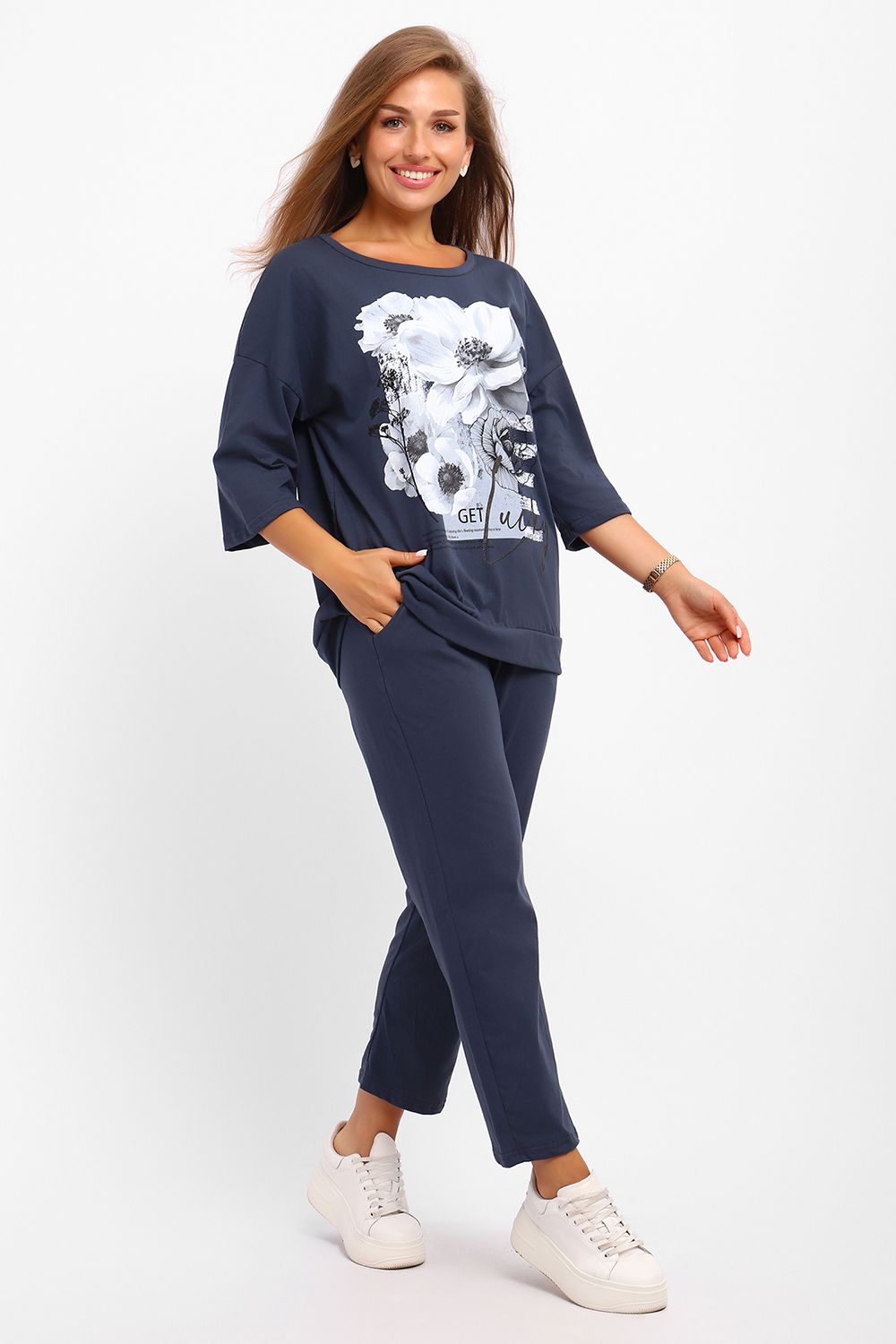 Костюм футболка + брюки 7/8. На полочке красивый крупный принт в виде цветов шиповника.