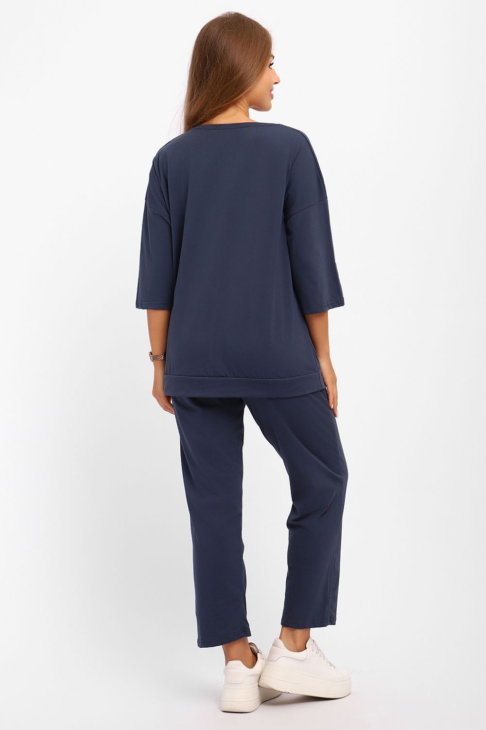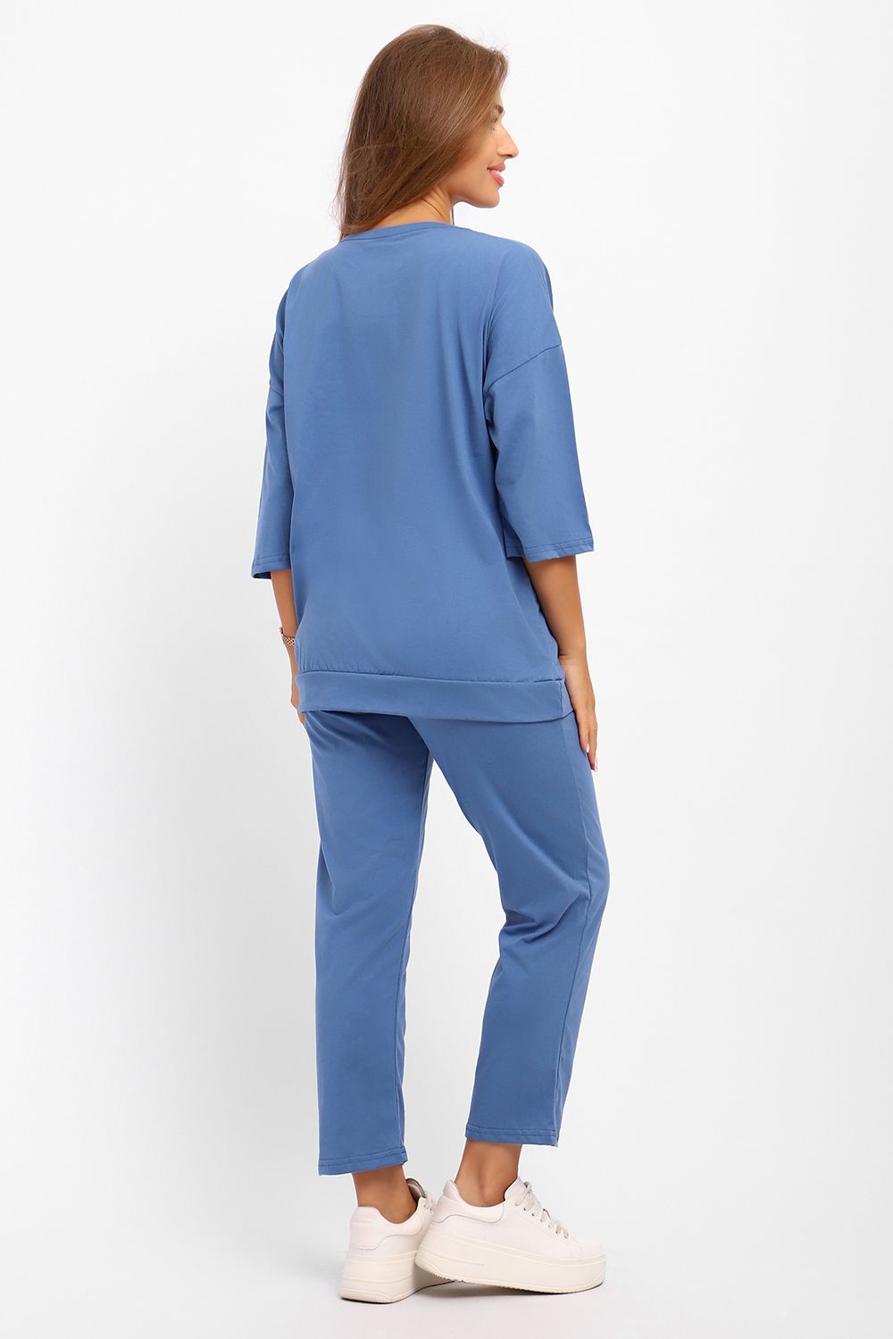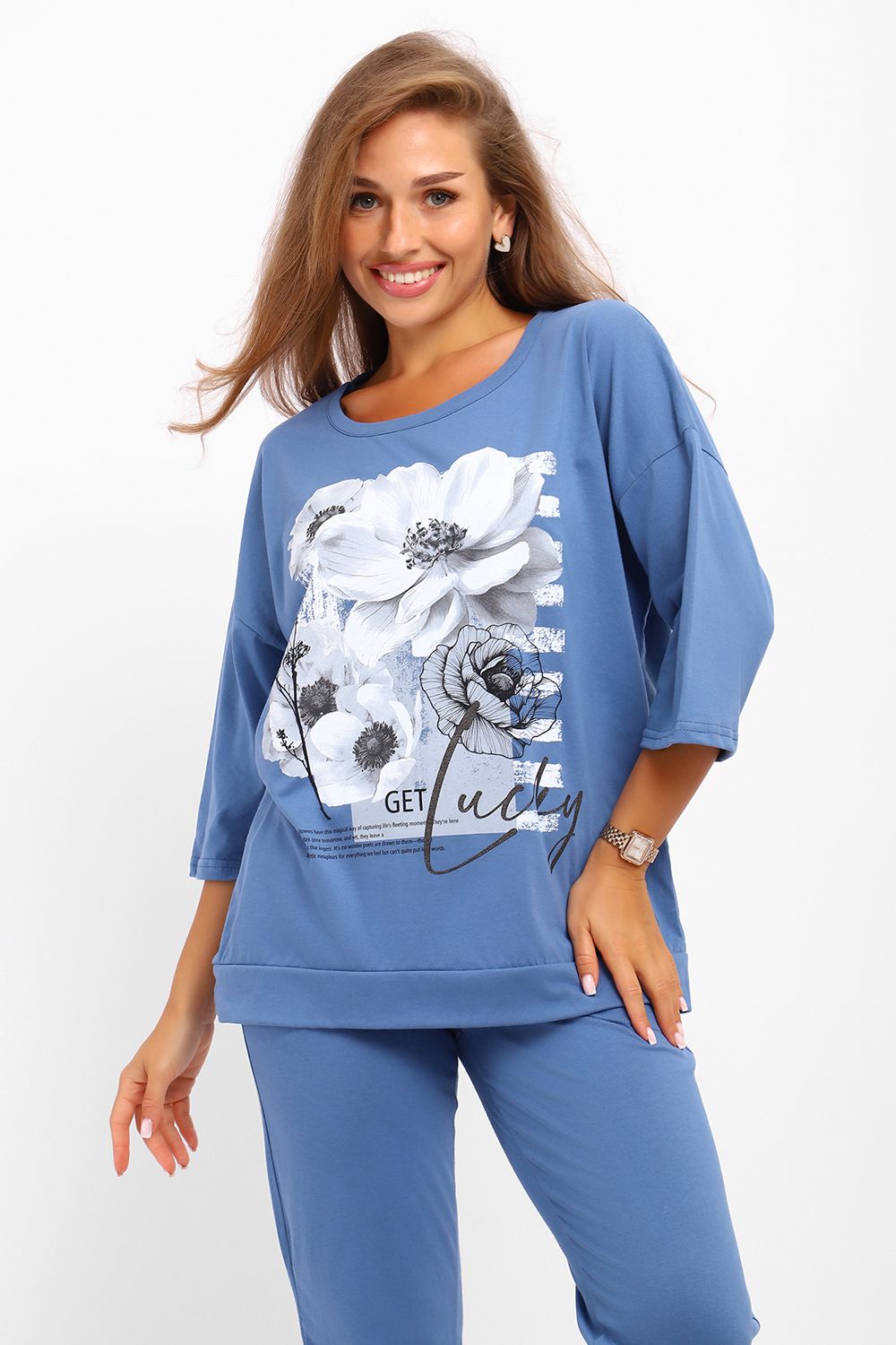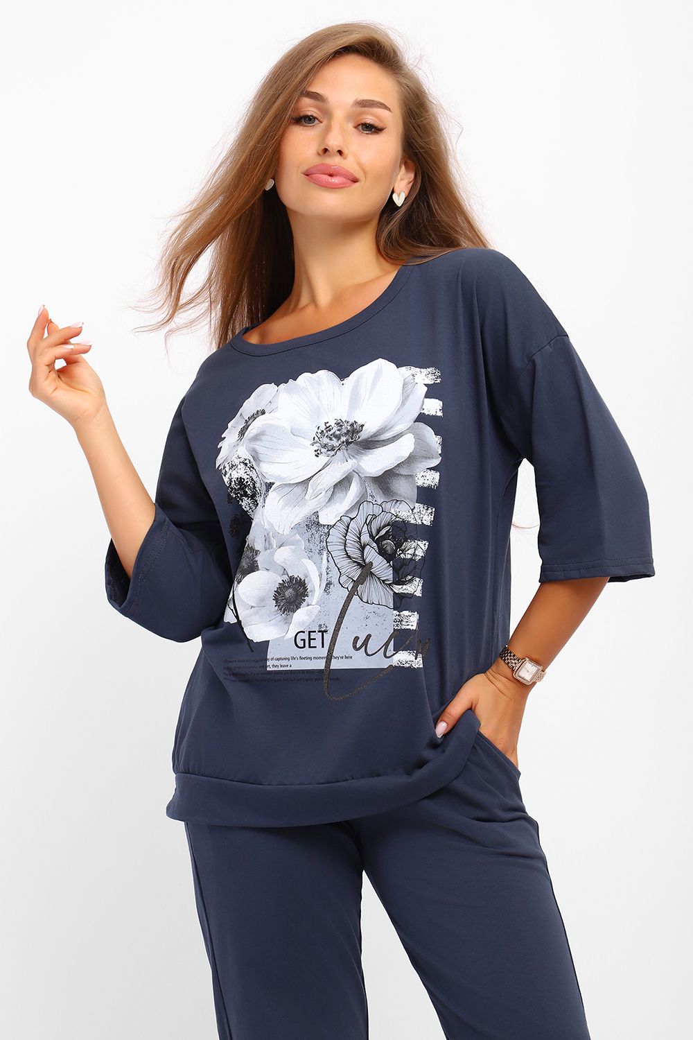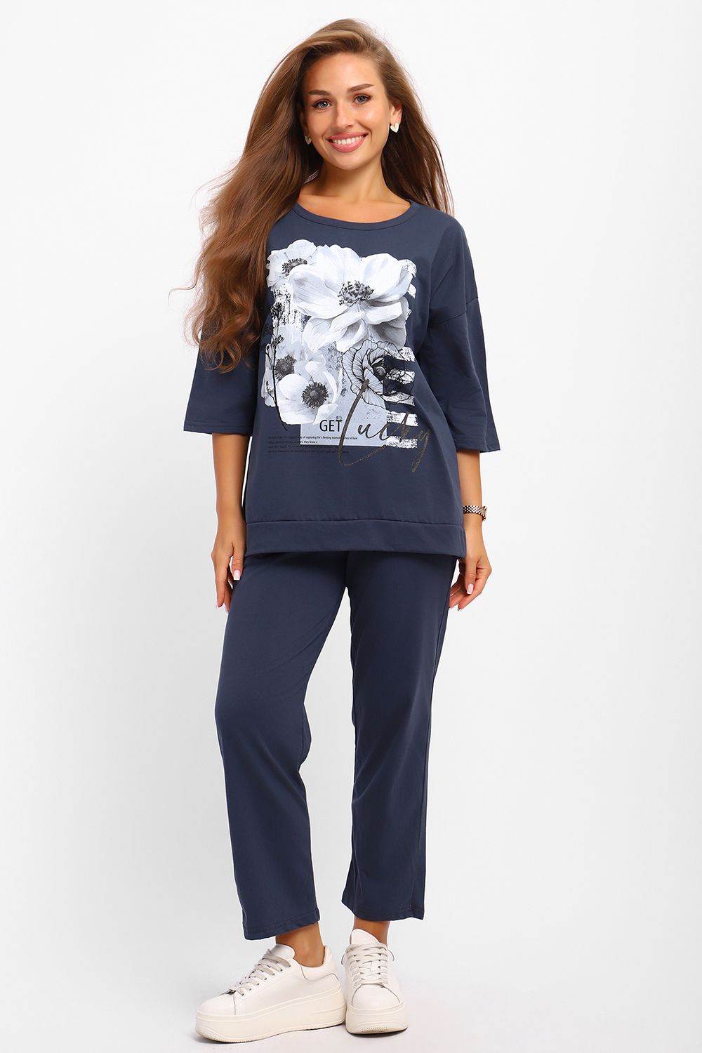 Костюм футболка + брюки 7/8. На полочке красивый крупный принт в виде цветов шиповника.