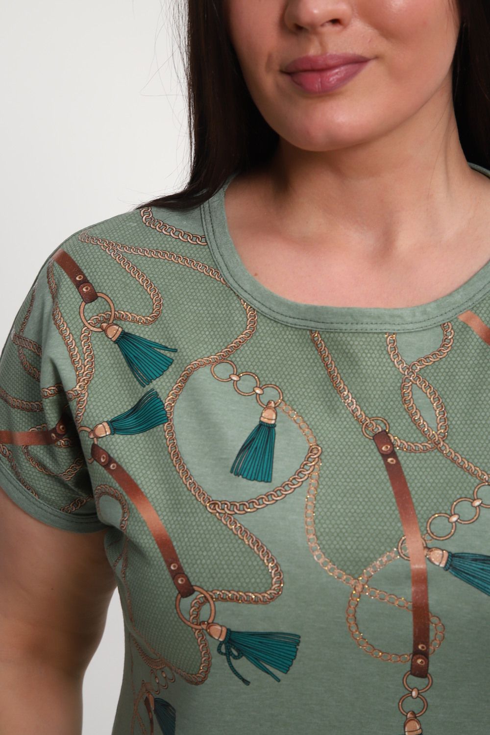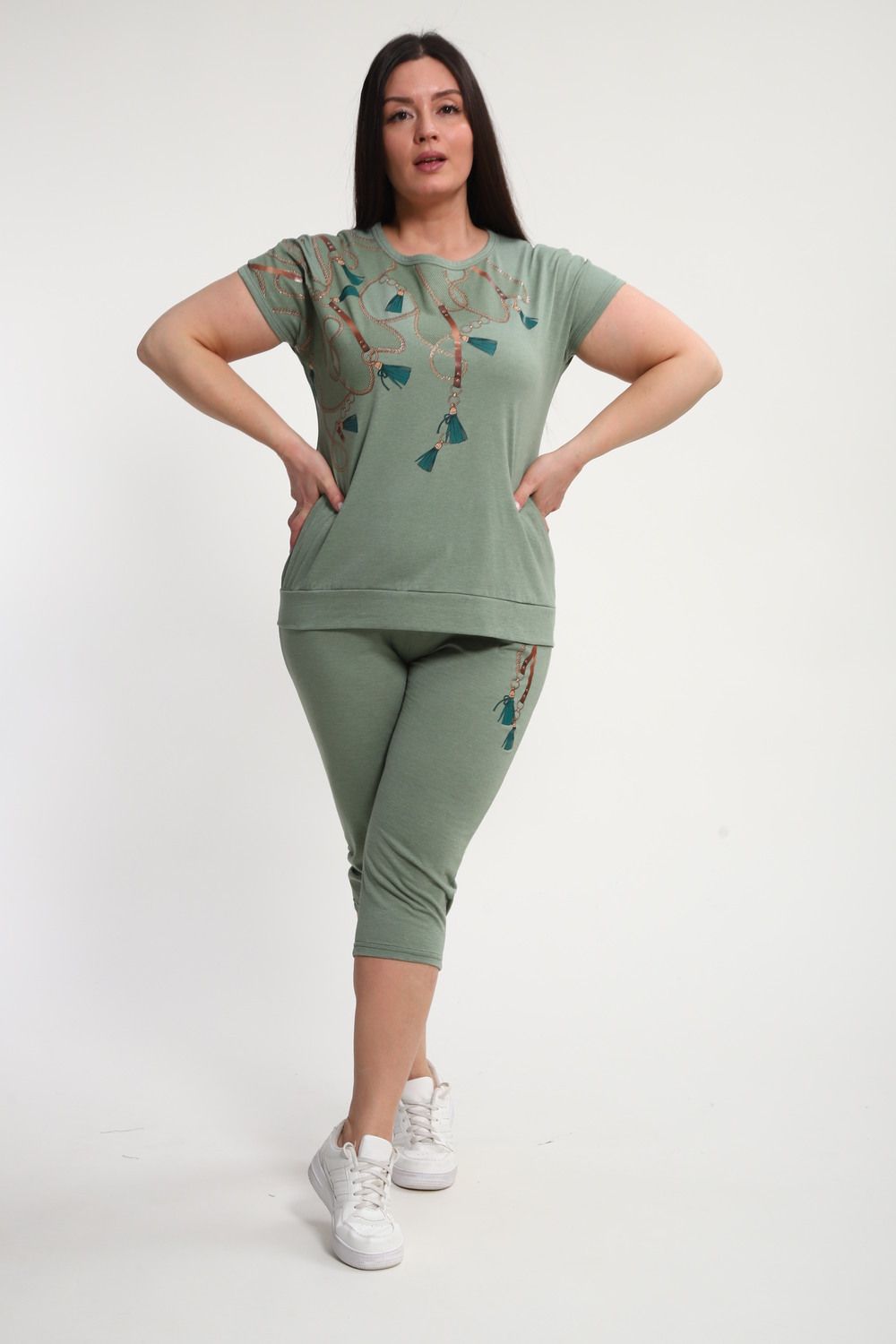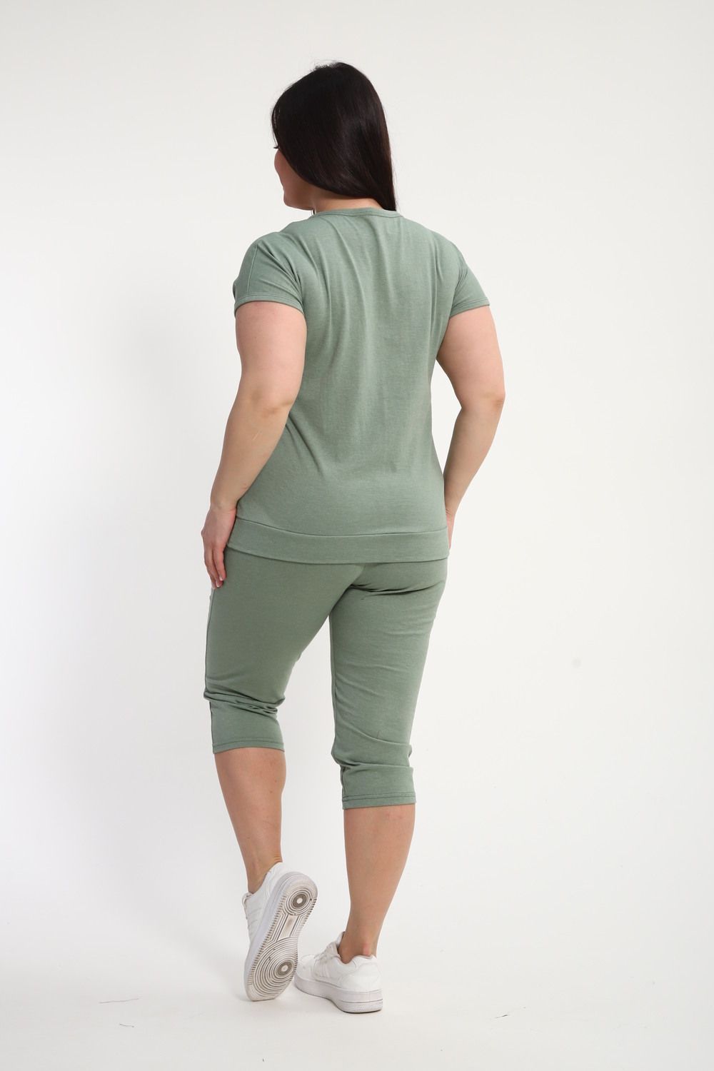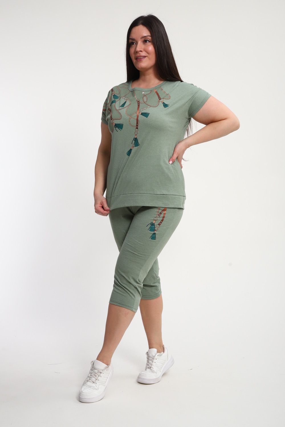 Женский домашний костюм с бриджами выполнен из комфортного материала, в составе которого 50% хлопок и 50% ПЭ, что обеспечивает приятные тактильные ощущения и простоту ухода. Модель представлена в графитовом цвете, изумрудном цвете и фисташковом цвете которые подчеркивают стиль и современность образа. Футболка имеет свободный крой, короткий рукав и круглый вырез, обеспечивая удобство и свободу движений в повседневной носке. На передней части футболки выполнена печать методом шелкографии, что гарантирует долговечность рисунка и устойчивость к стиркам. Бриджи средней длины, с эластичным поясом, хорошо сидят на фигуре и подходят для женщин больших размеров. Благодаря продуманной конструкции, костюм подходит для домашнего отдыха, прогулок и легких занятий спортом. Собственное производство гарантирует контроль качества на всех этапах изготовления. Материал дышащий и приятный к телу, не вызывает раздражения. Костюм с бриджами хорошо сохраняет форму после многочисленных стирок, не теряет насыщенность цвета и не деформируется.