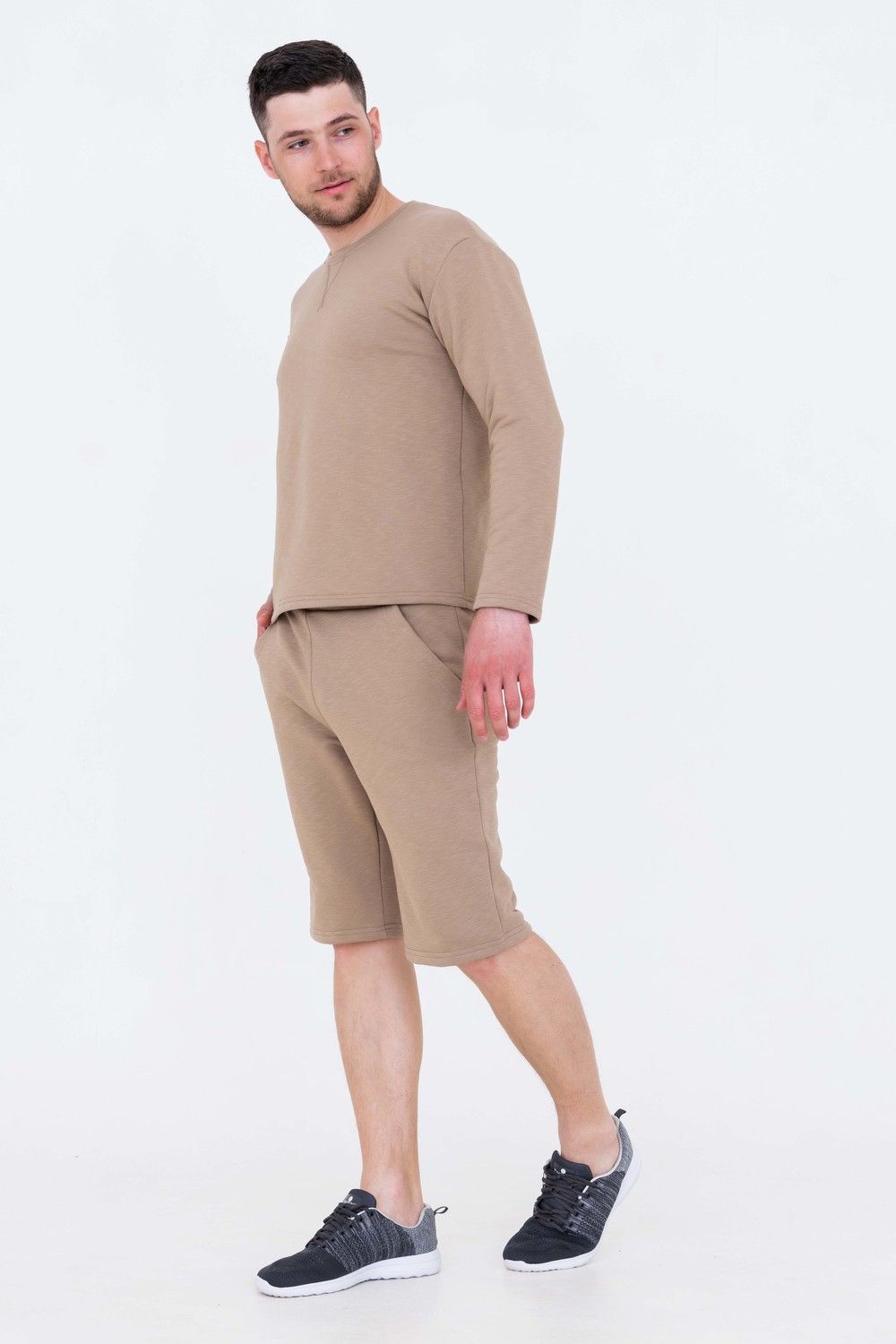 Удобный свитшот классического кроя подойдет на любую фигуру. Будет отлично сочетаться как с удлиненными шортами в комплекте, так и с джинсами или спортивными брюками. Шорты прямого кроя идеально комбинируются с футболкой. Данный комплект отлично подойдет для прогулок и активного отдыха. В нем будет удобно и комфортно как теплой весной и осенью, так и прохладным летом.