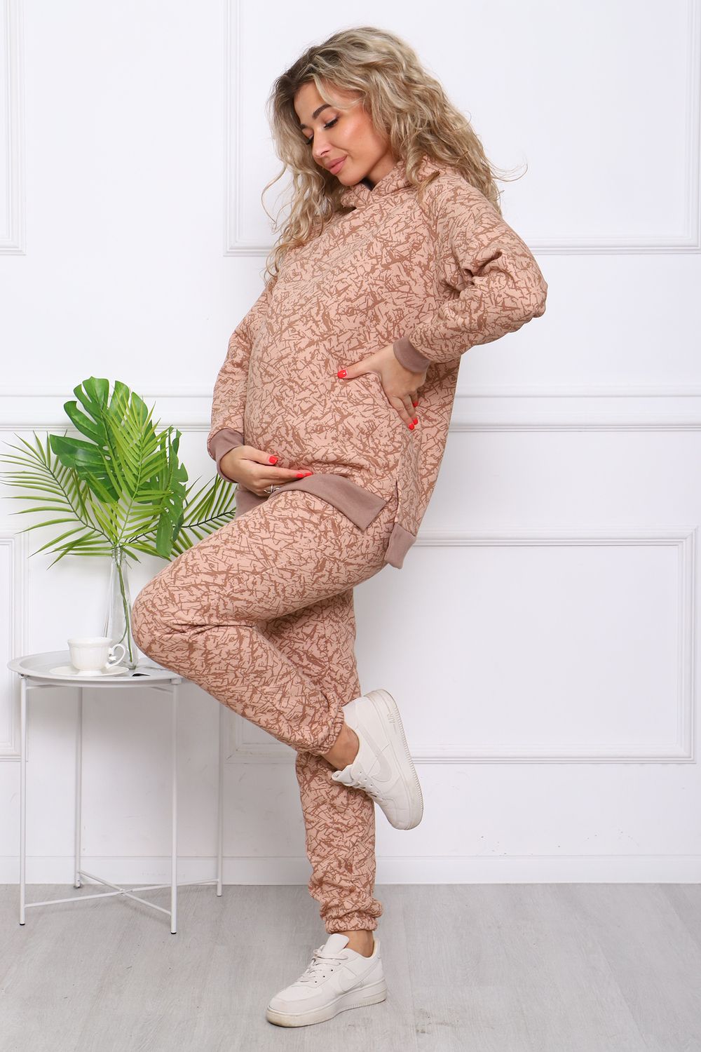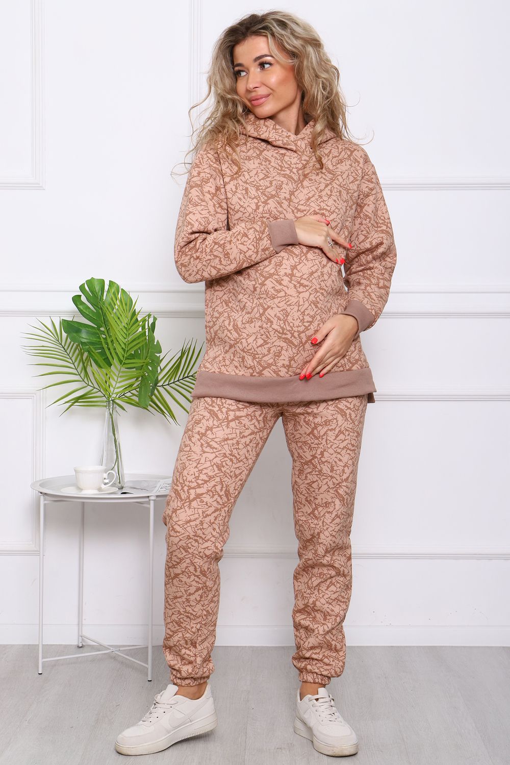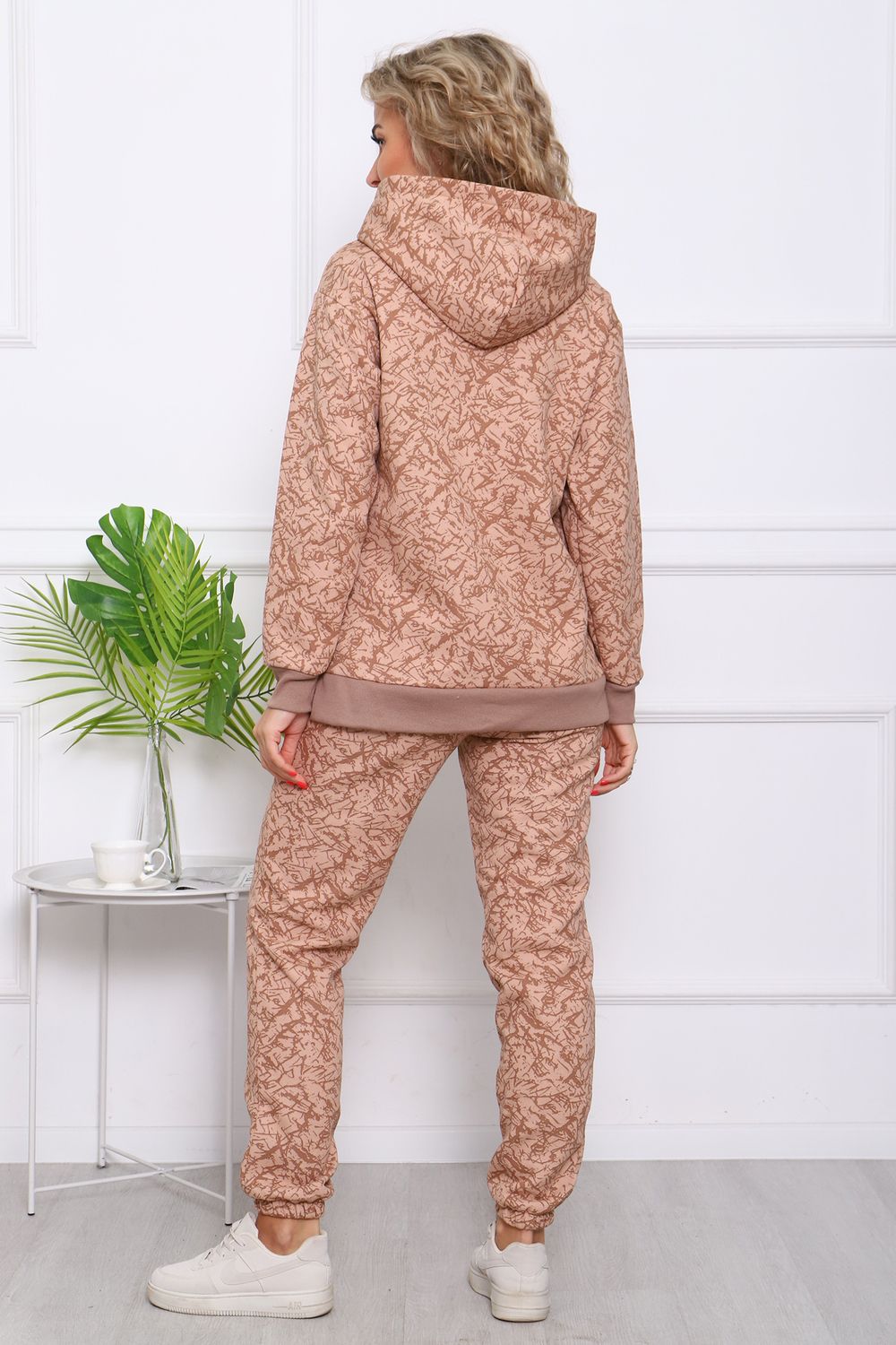 Костюм женский. Куртка со спущенным рукавом на манжете, двойным капюшоном, в боковых швах разрезы. Брюки на притачном поясе с резинкой, по низу изделия резинка.