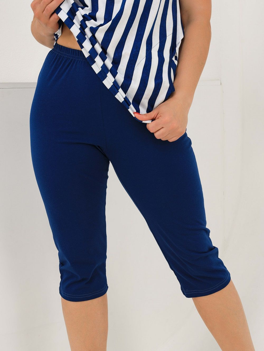 Женский костюм с бриджами полуприталенного силуэта. Длина бридж ниже колена. Кокеткка на футболке в тон с бриджами. Футболка с коротким рукавом и карманами.