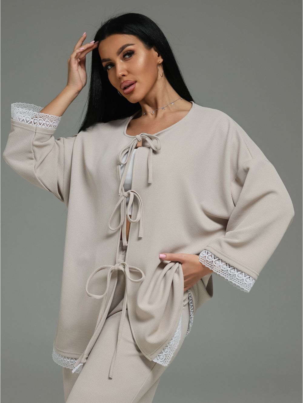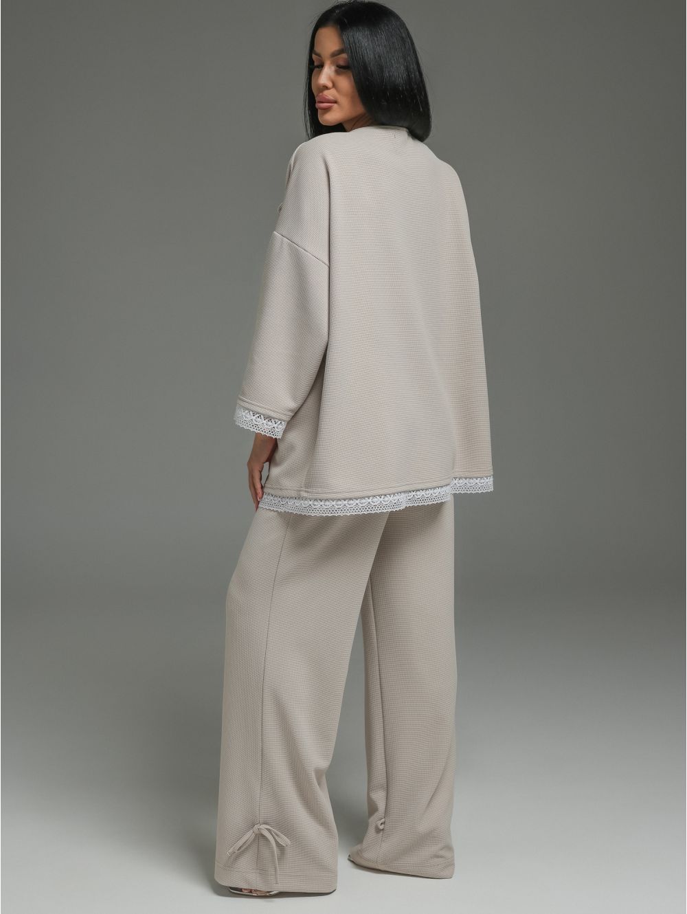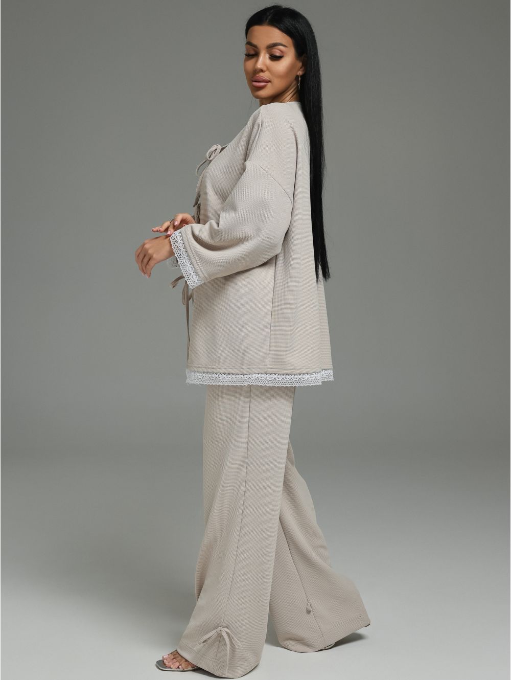Модель: Женский костюм-двойка из блузы и брюк. Романтичный образ с кружевом и регулируемыми деталями.