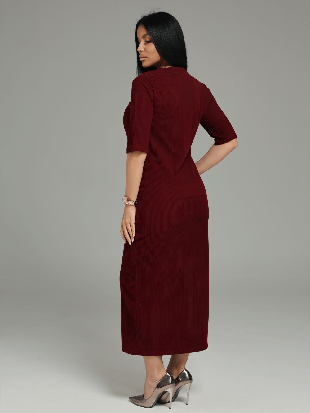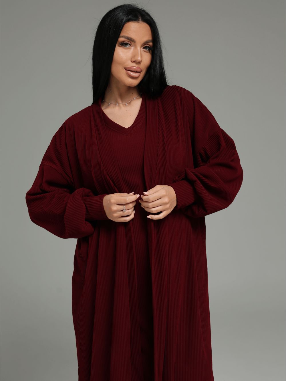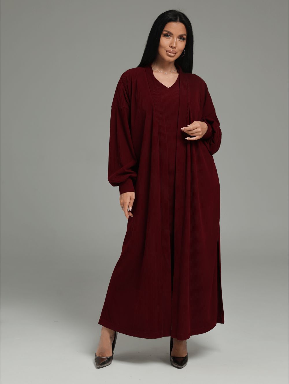 Безупречная посадка: Платье прилегающего кроя повторяет изгибы тела, а свободный кардиган с боковыми разрезами позволяет легко двигаться и создает летящий силуэт.