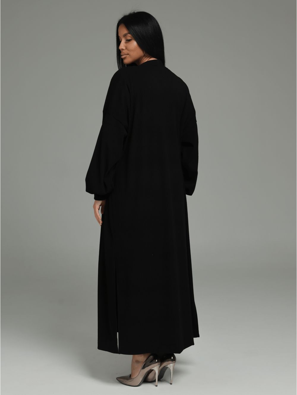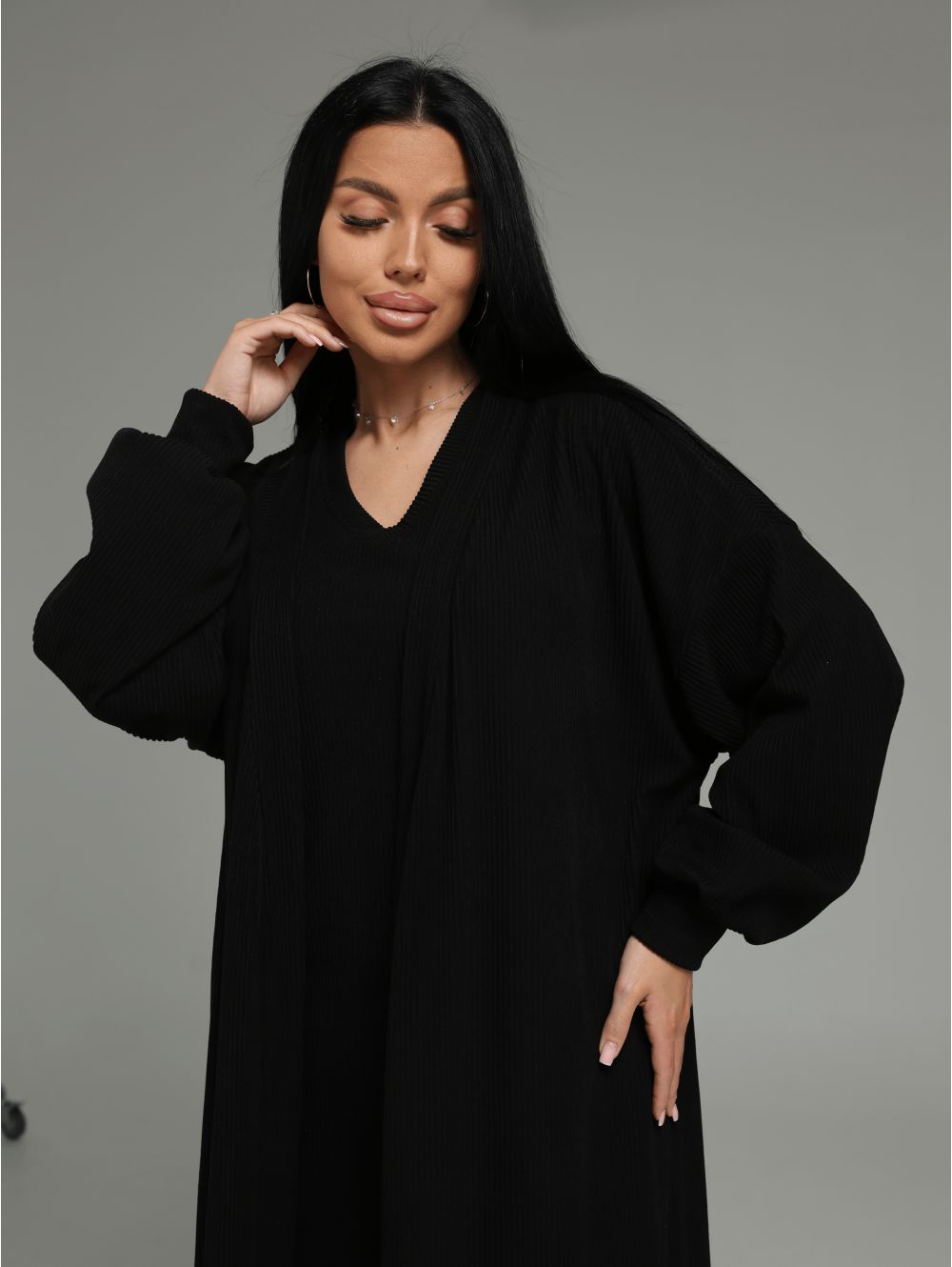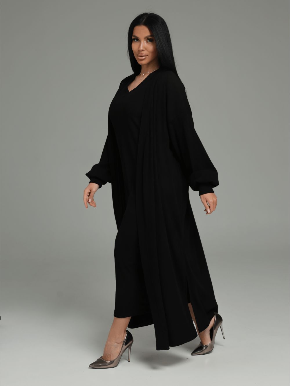Безупречная посадка: Платье прилегающего кроя повторяет изгибы тела, а свободный кардиган с боковыми разрезами позволяет легко двигаться и создает летящий силуэт.