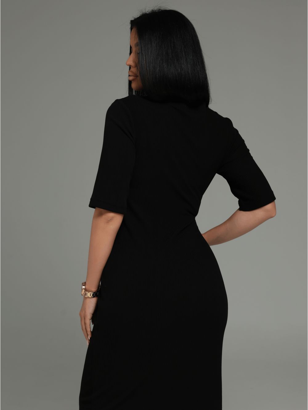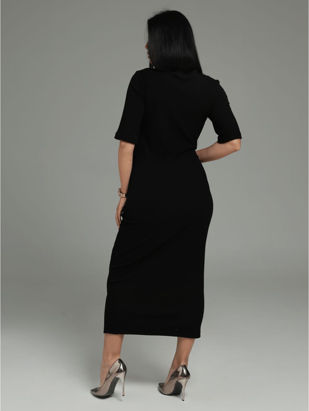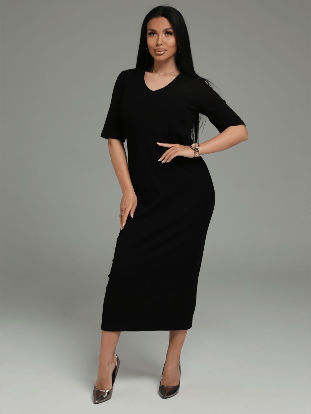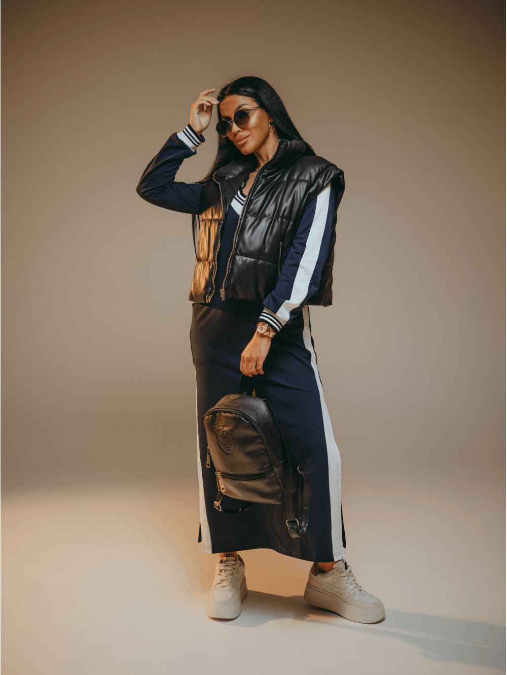 Безупречная посадка: Платье прилегающего кроя повторяет изгибы тела, а свободный кардиган с боковыми разрезами позволяет легко двигаться и создает летящий силуэт.
