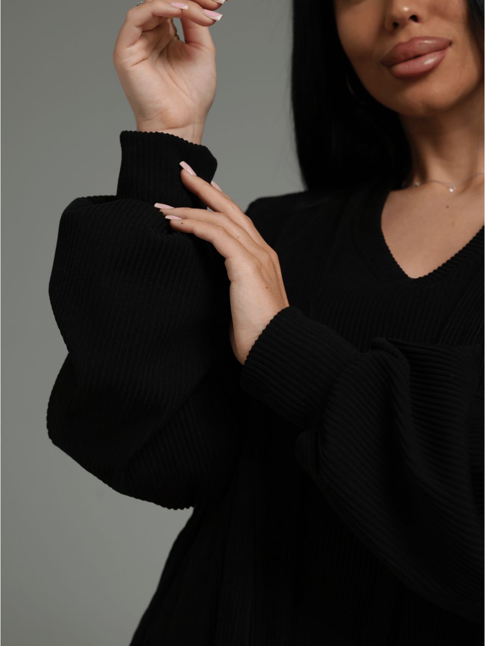 Женственный силуэт: Приталенное платье длины "миди" с V-образным вырезом элегантно подчеркивает фигуру. Кардиган со спущенным плечом и сборчатыми манжетами добавляет образу утонченной небрежности.