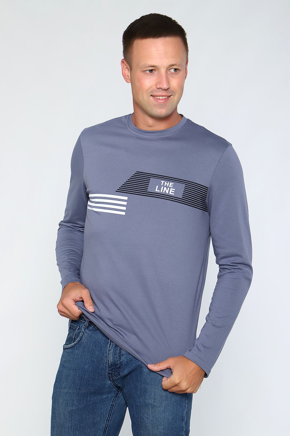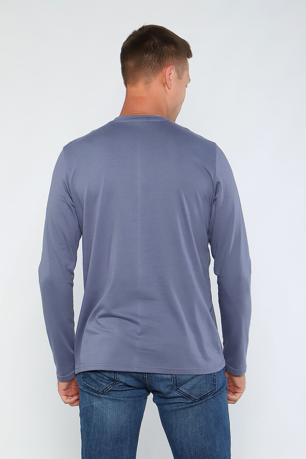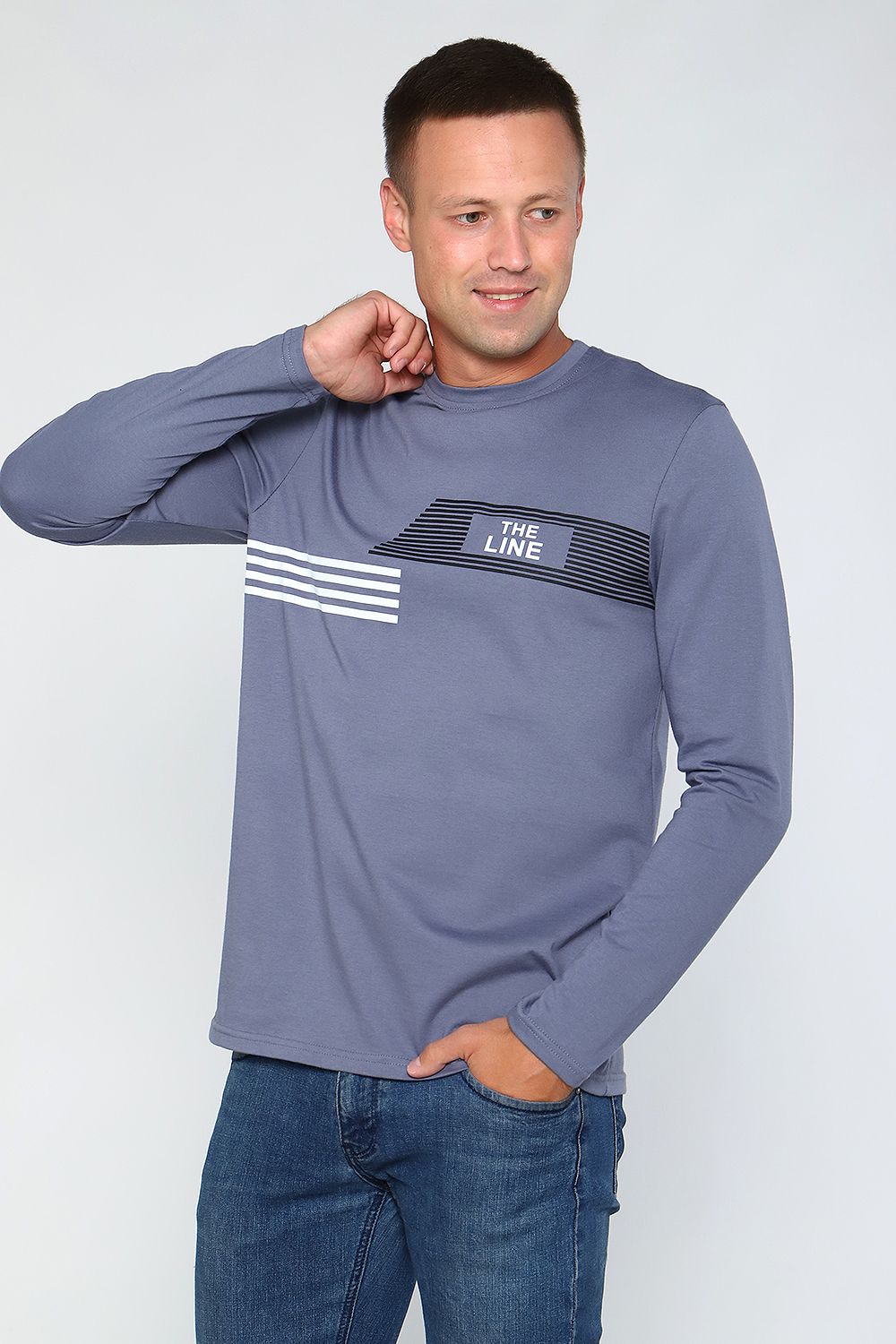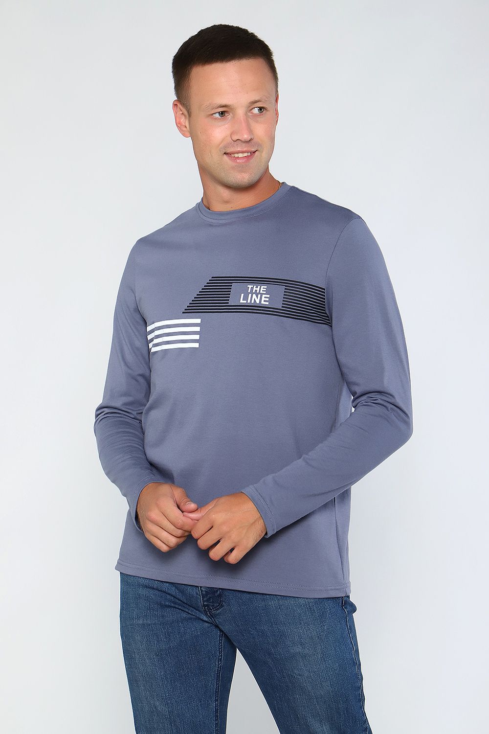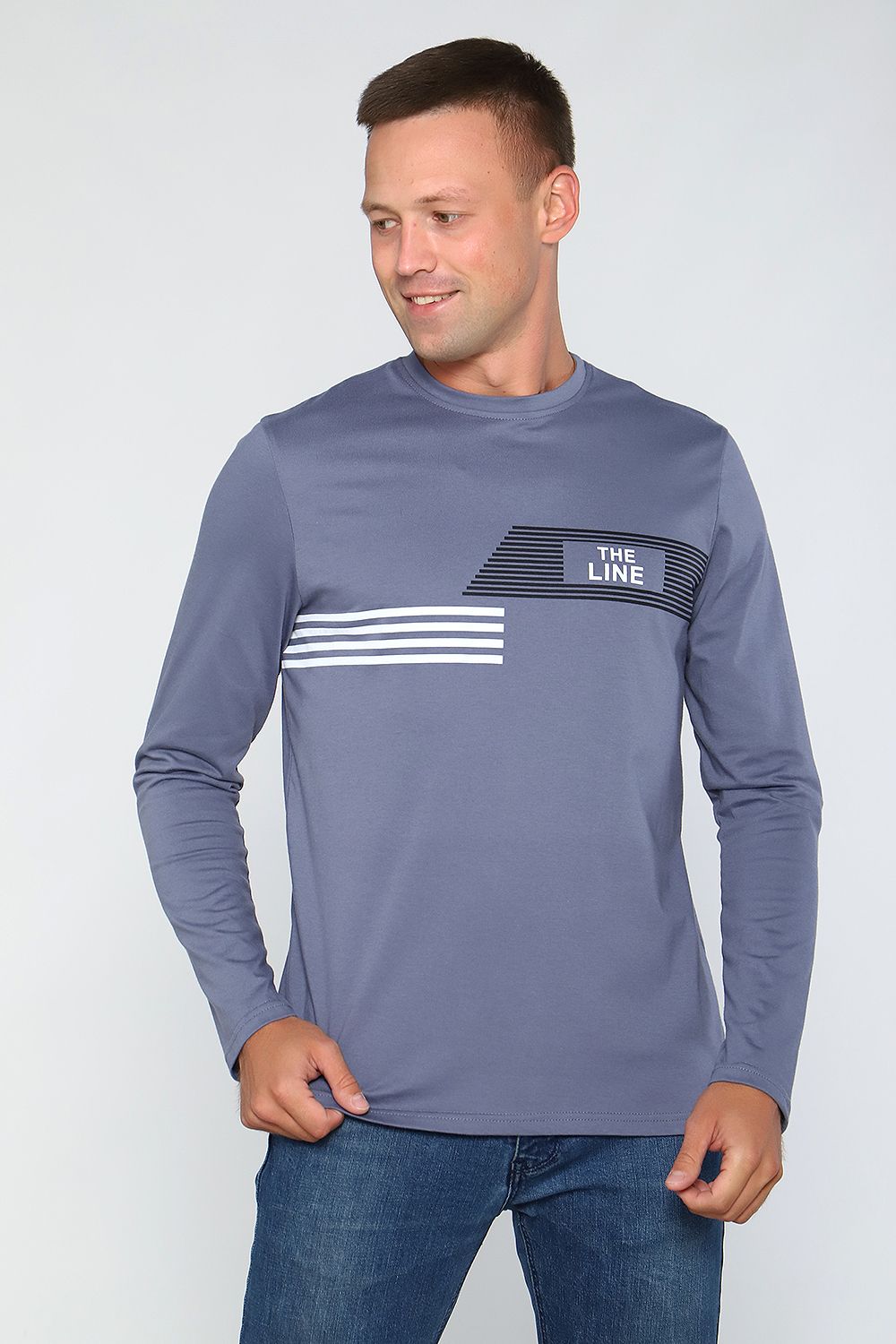 Лонгслив мужской с округлой горловиной, обработанной усилителем. Широкая футболка с длинными рукавами имеет свободный крой и классическую, не спущенную линию плеча.