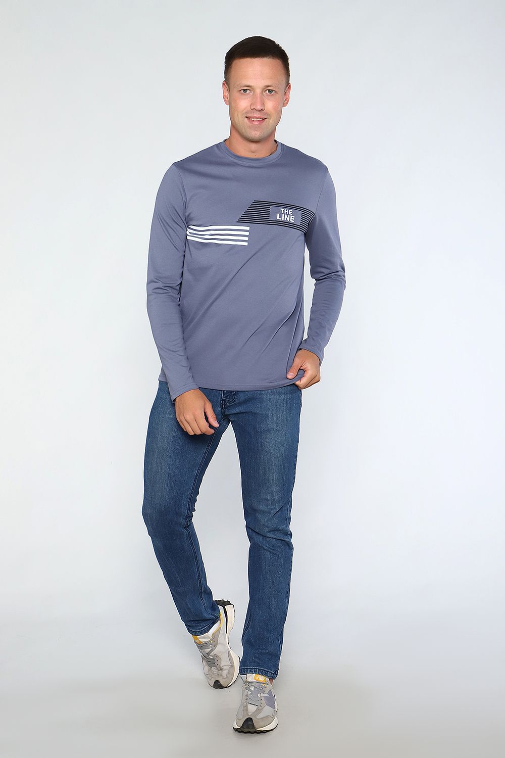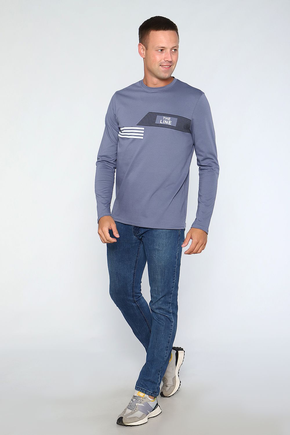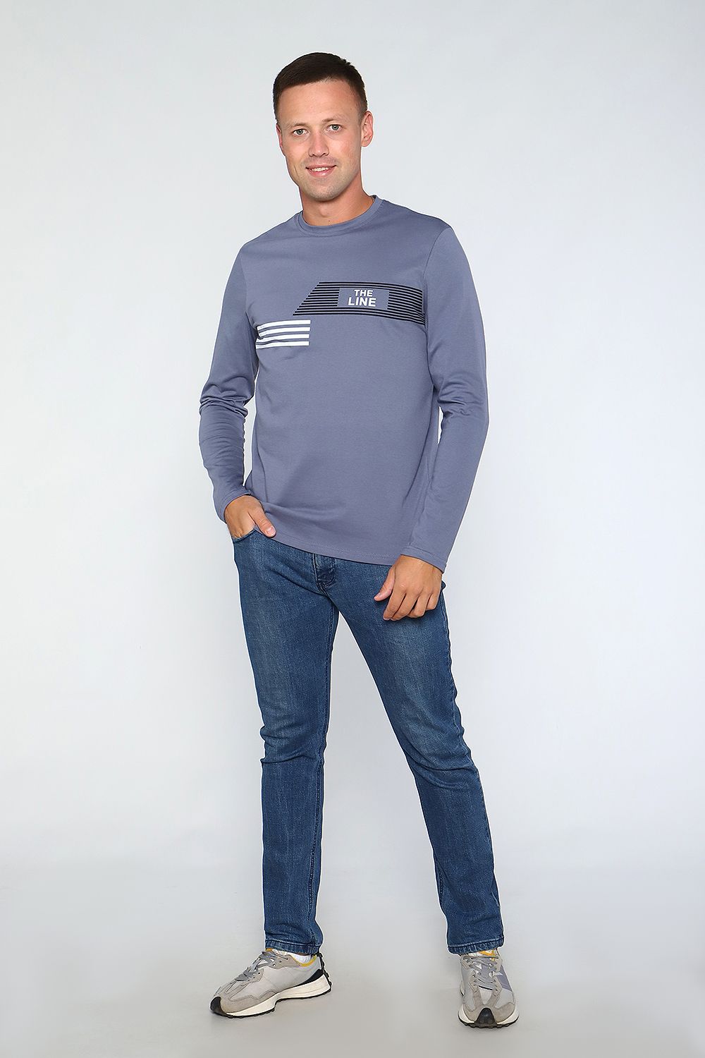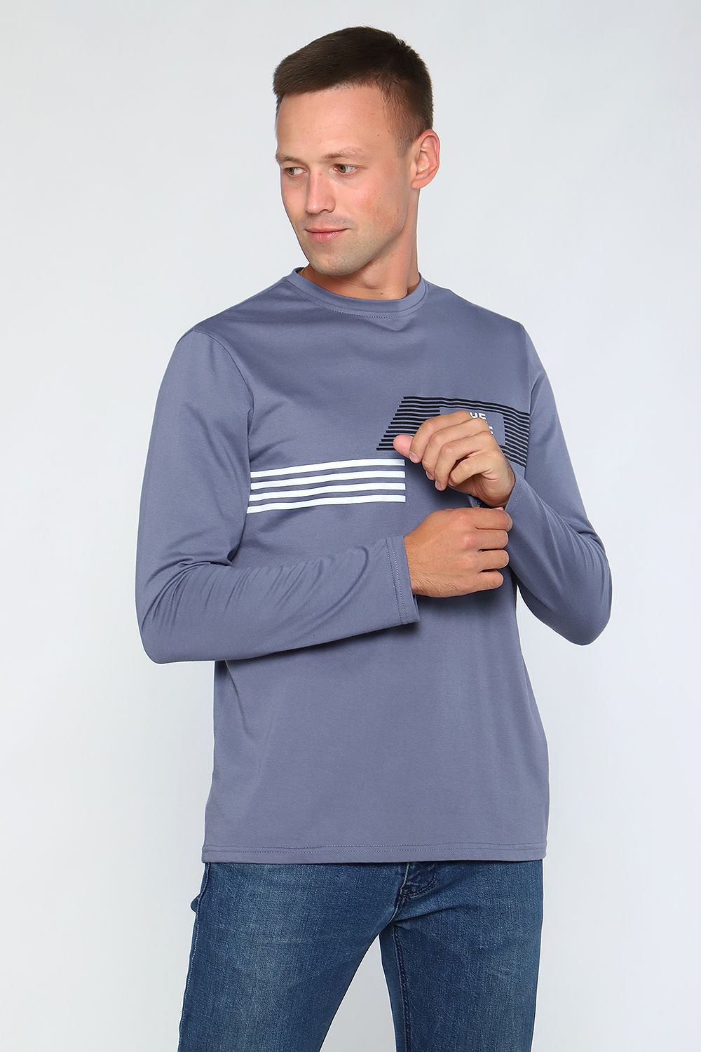 Лонгслив мужской с округлой горловиной, обработанной усилителем. Широкая футболка с длинными рукавами имеет свободный крой и классическую, не спущенную линию плеча.