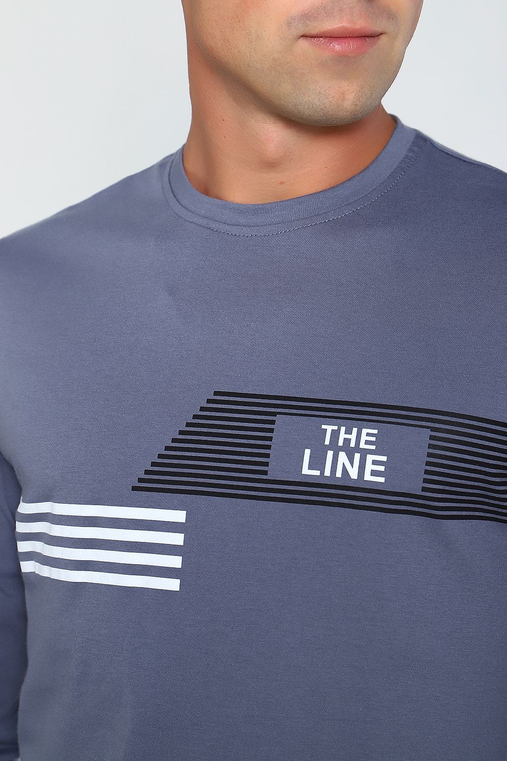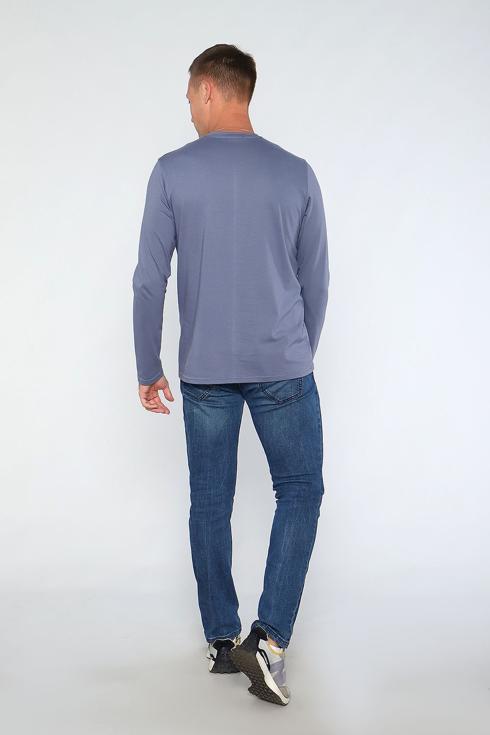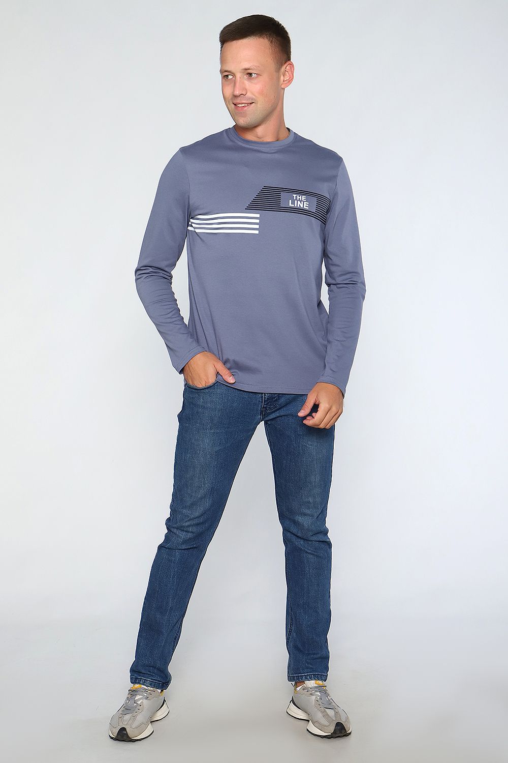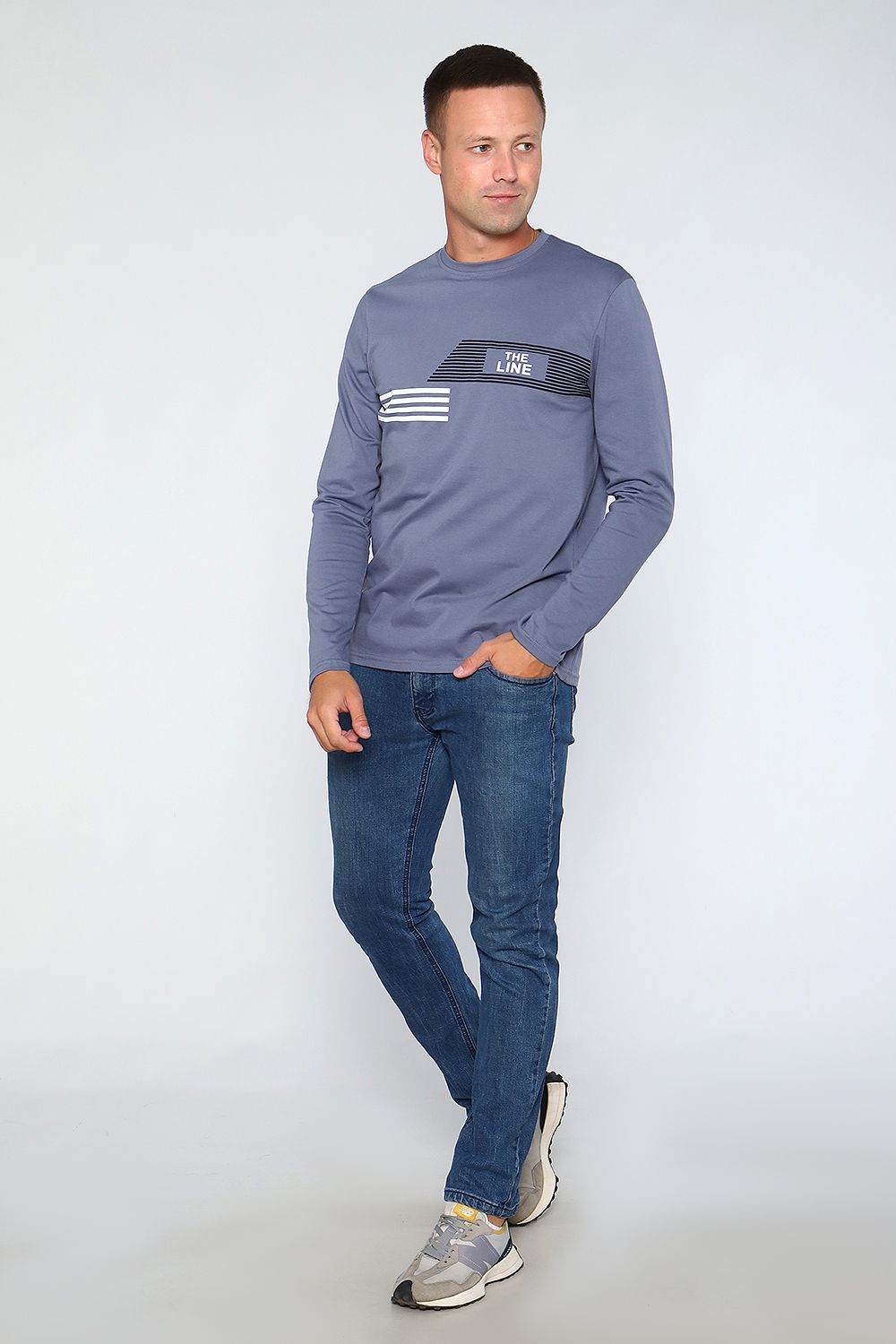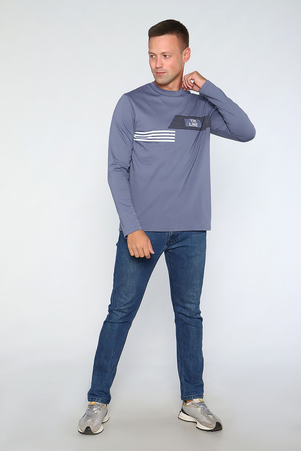 Лонгслив мужской с округлой горловиной, обработанной усилителем. Широкая футболка с длинными рукавами имеет свободный крой и классическую, не спущенную линию плеча.