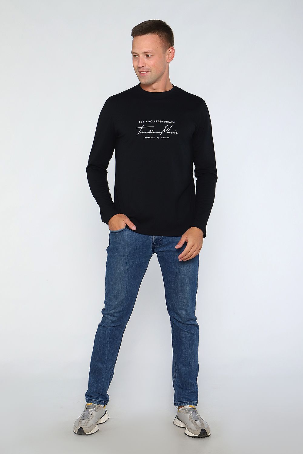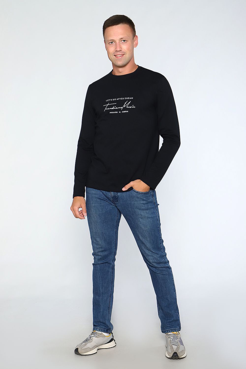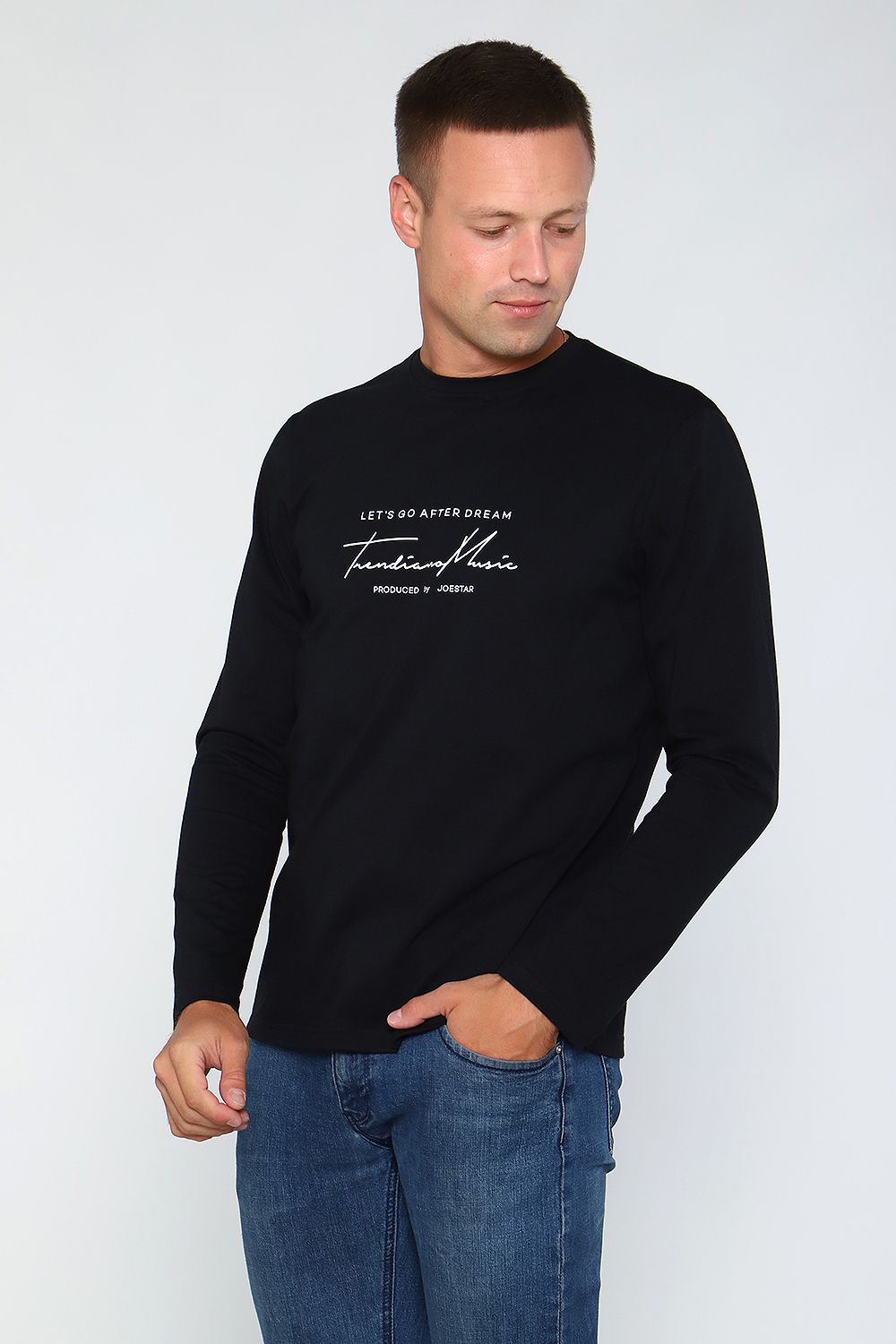 Лонгслив мужской с округлой горловиной, обработанной усилителем. Широкая футболка с длинными рукавами имеет свободный крой и классическую, не спущенную линию плеча.