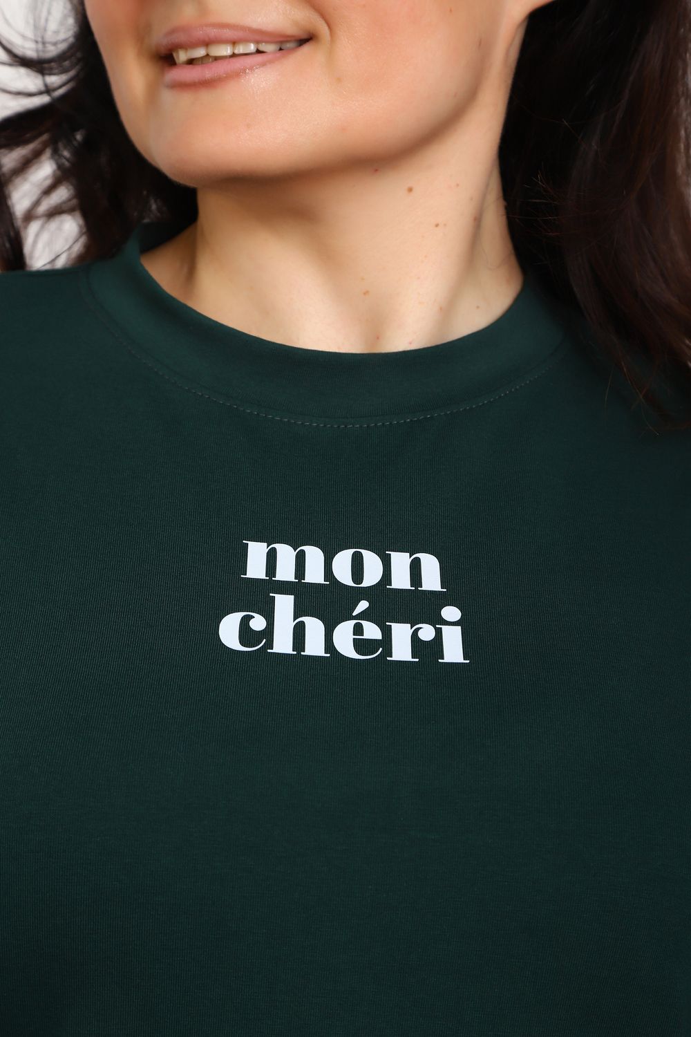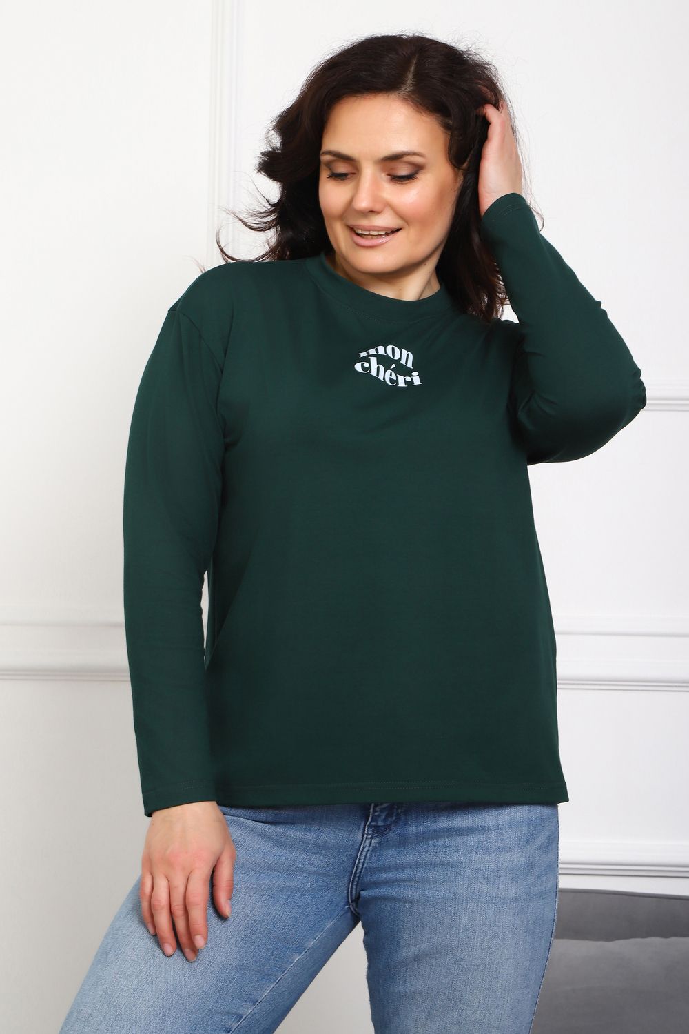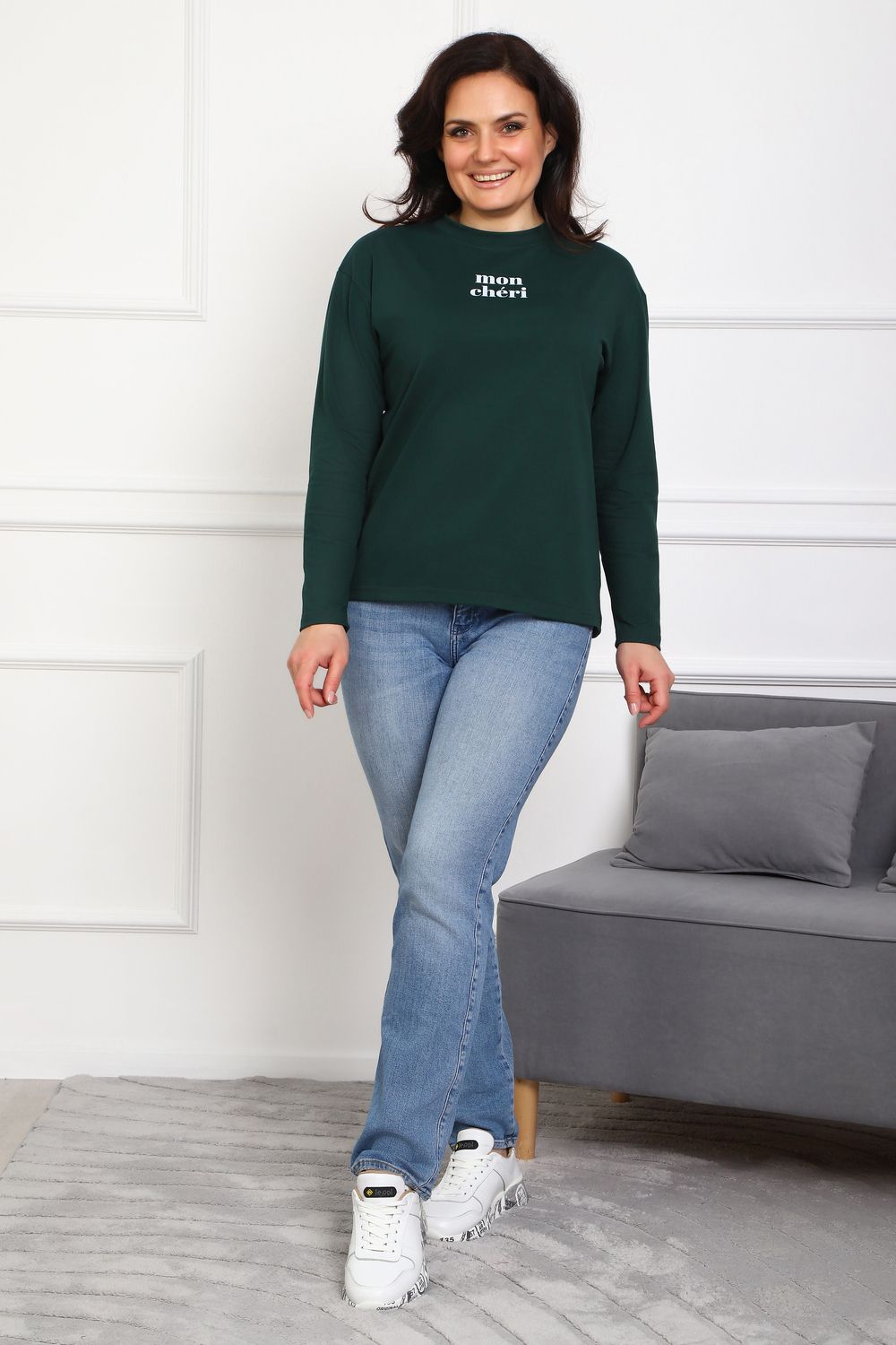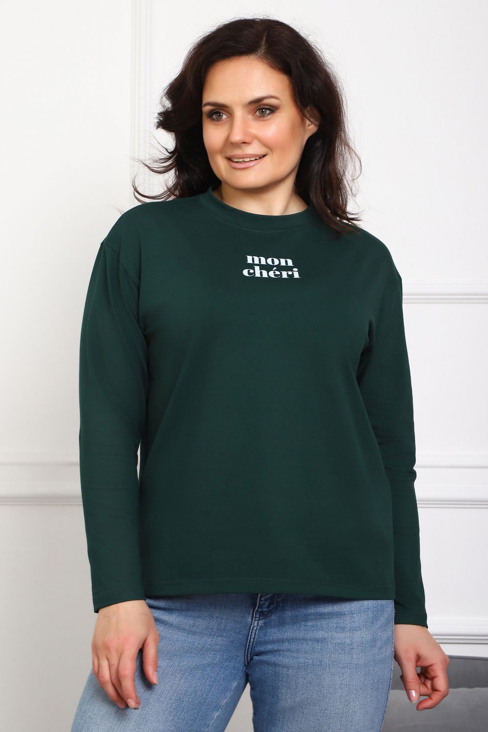 Лонгслив женский MON CHERI Женский лонгслив свободой посадки изготовлен из мягкой и приятной к телу кулирки, которая состоит из высококачественного хлопка (95%) и небольшого процента лайкры (5%), обеспечивающей лёгкую эластичность и долговечность изделия. Свободный прямой и удлиненный крой подчеркивает удобство и расслабленный стиль, позволяя носить его ежедневно. Длинные рукава и круглая горловина создают гармоничный внешний вид, подчеркивая женственность и утончённость. Элегантный минималистичный принт на груди с романтичным французским выражением "Mon Cheri" привносит особую атмосферу романтики и легкости в образ. Важным преимуществом является сдвоенный размер, позволяющий комфортно подобрать модель каждой женщине, независимо от особенностей фигуры. Данный лонгслив станет идеальным выбором для тех, кто ценит сочетание комфорта, удобства и современного дизайна.