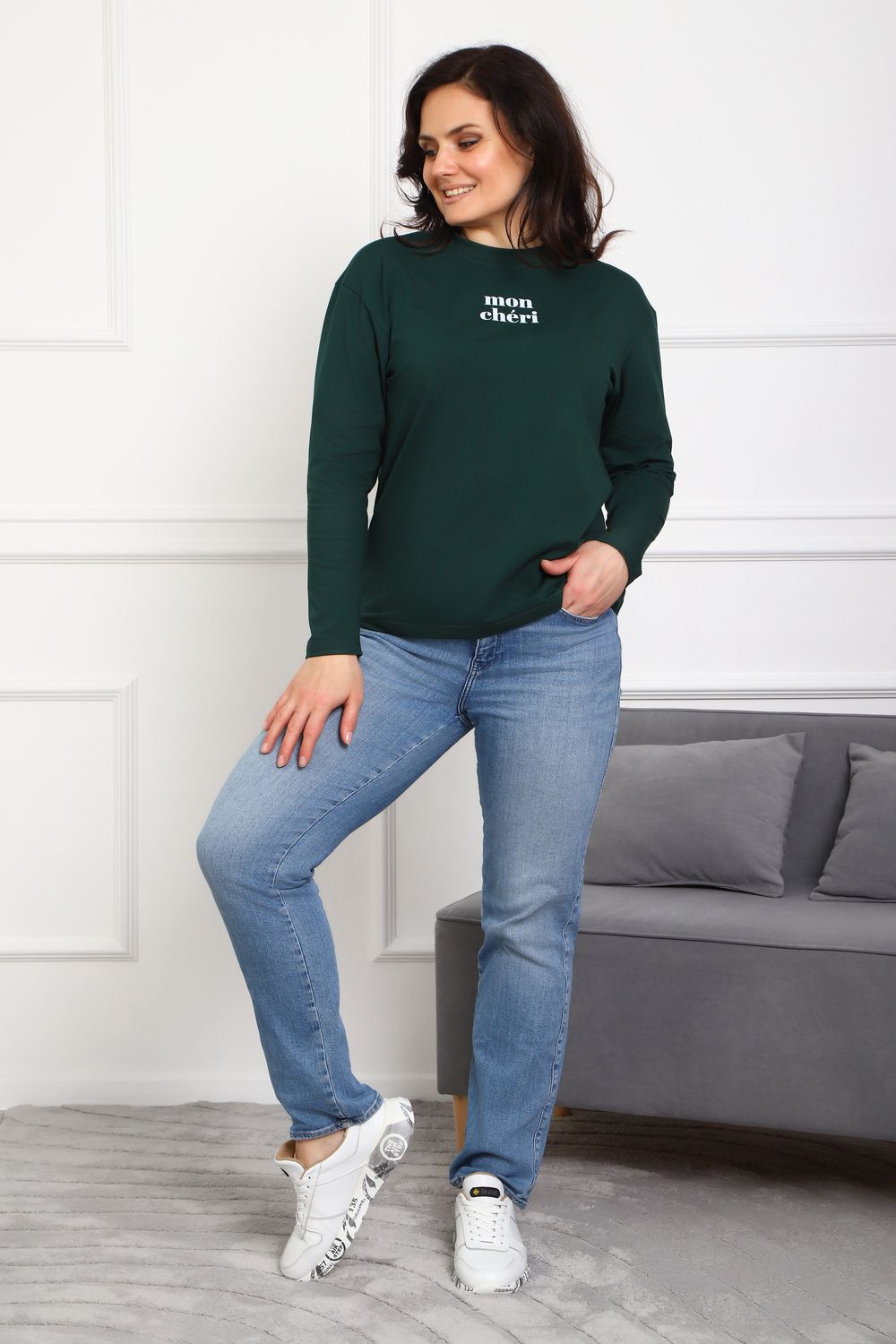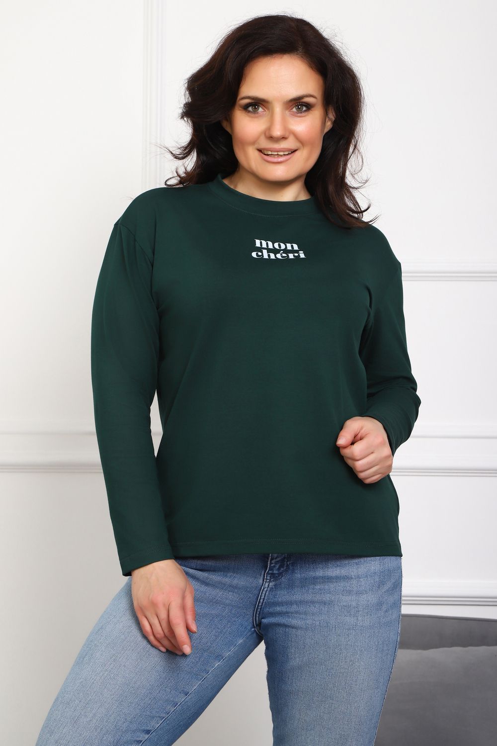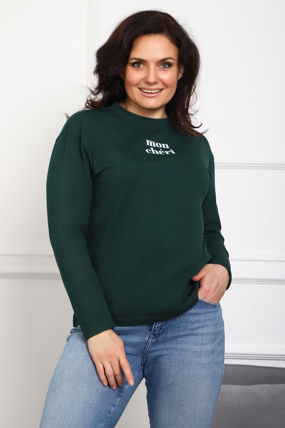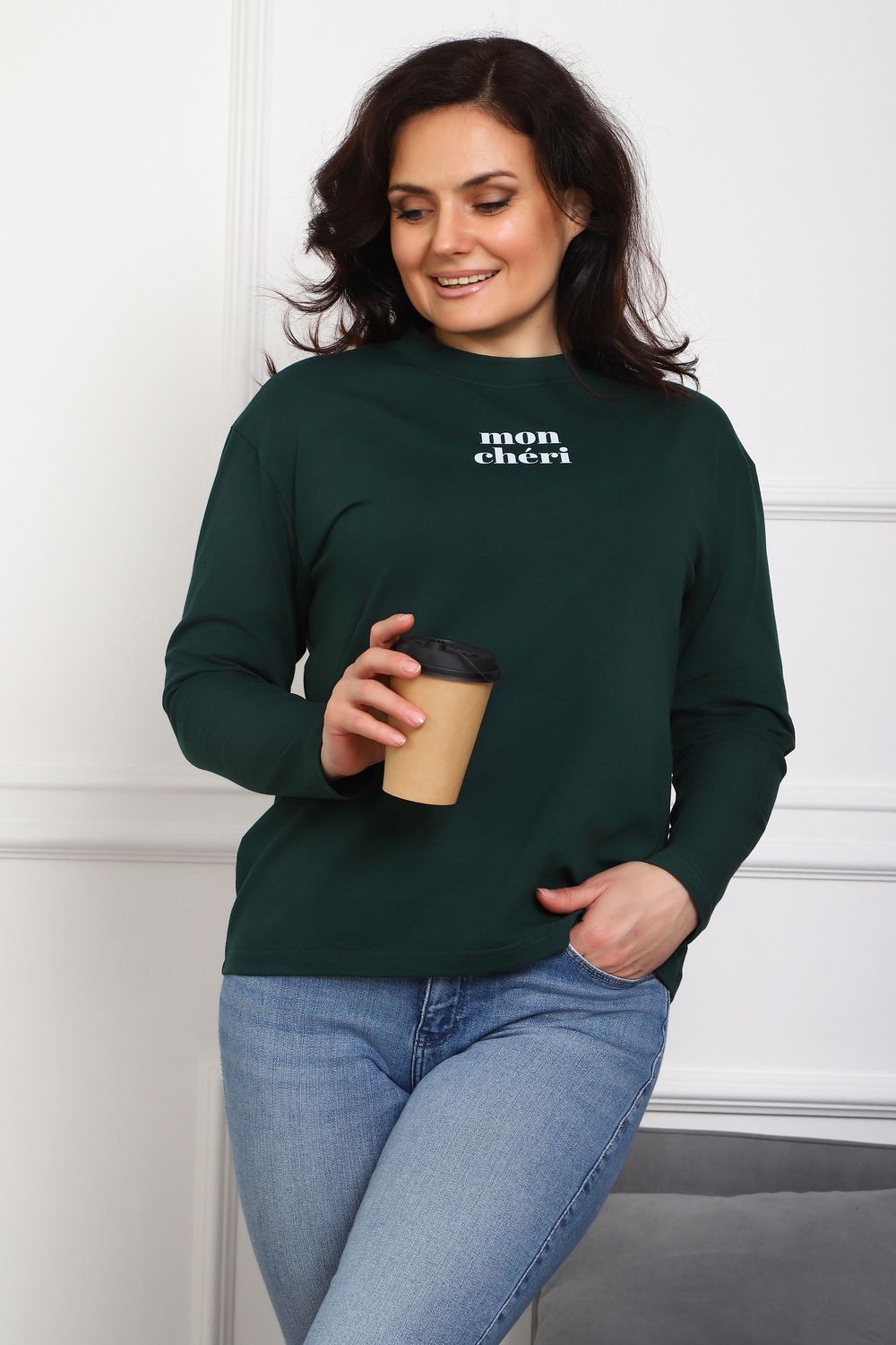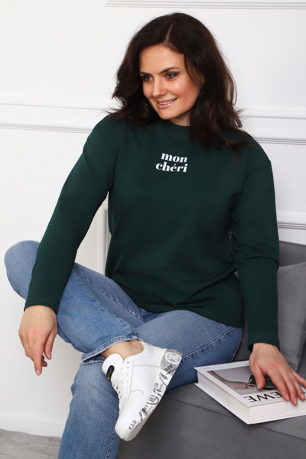 Лонгслив женский MON CHERI Женский лонгслив свободой посадки изготовлен из мягкой и приятной к телу кулирки, которая состоит из высококачественного хлопка (95%) и небольшого процента лайкры (5%), обеспечивающей лёгкую эластичность и долговечность изделия. Свободный прямой и удлиненный крой подчеркивает удобство и расслабленный стиль, позволяя носить его ежедневно. Длинные рукава и круглая горловина создают гармоничный внешний вид, подчеркивая женственность и утончённость. Элегантный минималистичный принт на груди с романтичным французским выражением "Mon Cheri" привносит особую атмосферу романтики и легкости в образ. Важным преимуществом является сдвоенный размер, позволяющий комфортно подобрать модель каждой женщине, независимо от особенностей фигуры. Данный лонгслив станет идеальным выбором для тех, кто ценит сочетание комфорта, удобства и современного дизайна.