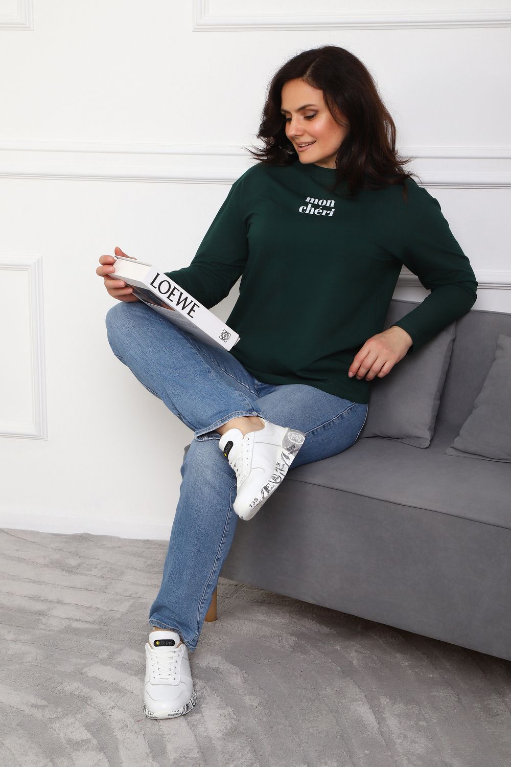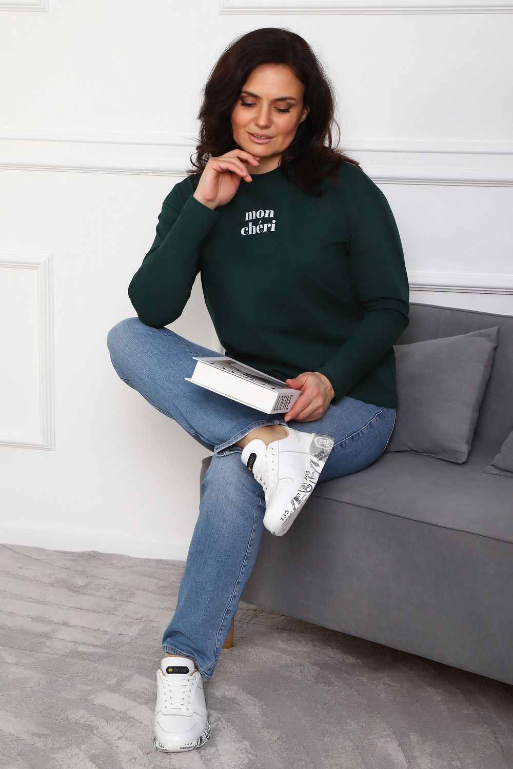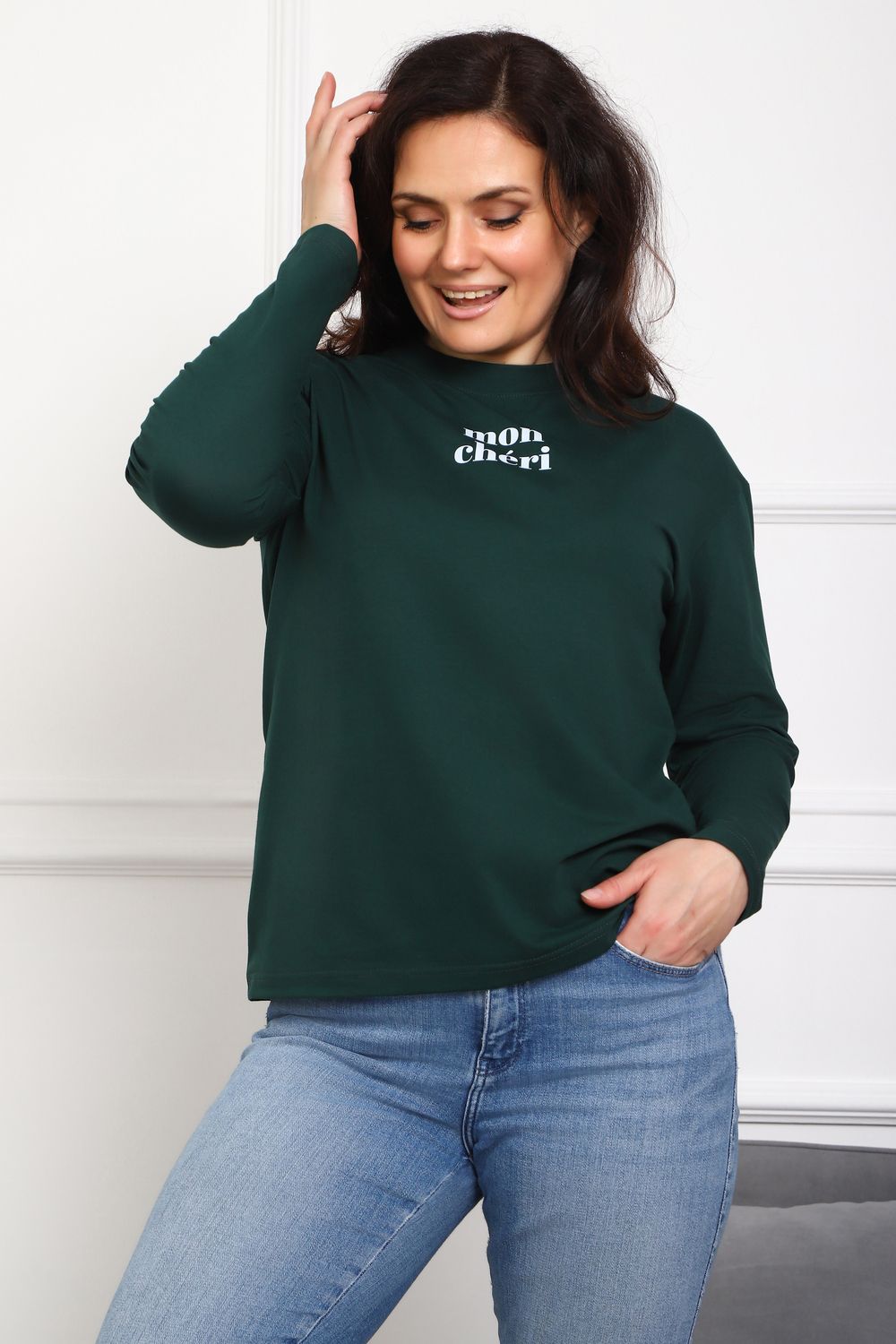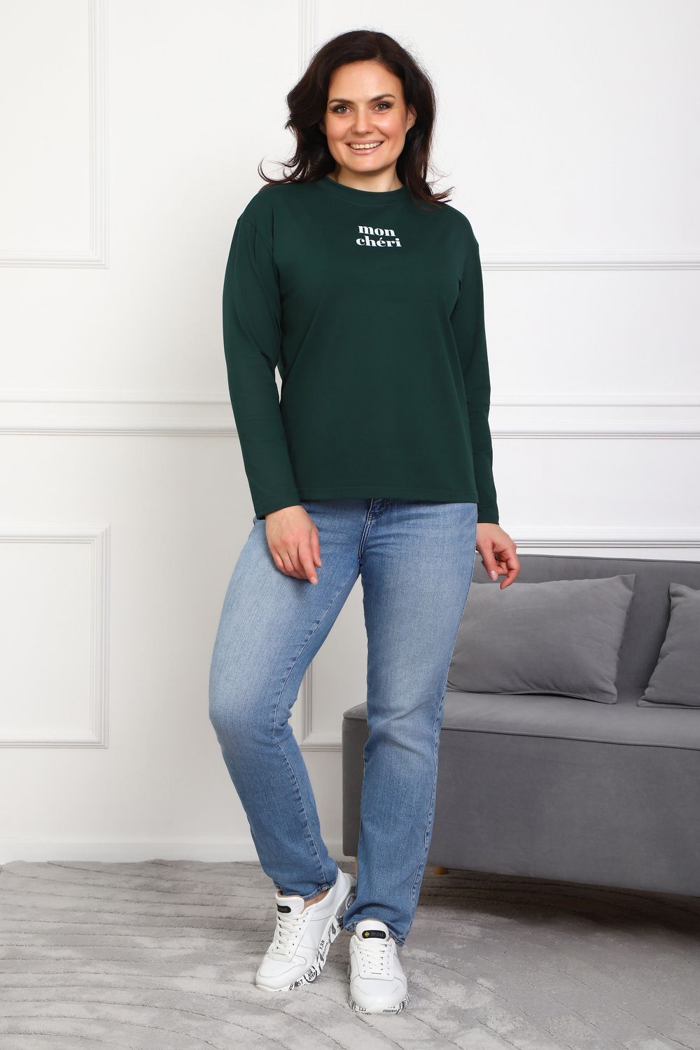 Лонгслив женский MON CHERI Женский лонгслив свободой посадки изготовлен из мягкой и приятной к телу кулирки, которая состоит из высококачественного хлопка (95%) и небольшого процента лайкры (5%), обеспечивающей лёгкую эластичность и долговечность изделия. Свободный прямой и удлиненный крой подчеркивает удобство и расслабленный стиль, позволяя носить его ежедневно. Длинные рукава и круглая горловина создают гармоничный внешний вид, подчеркивая женственность и утончённость. Элегантный минималистичный принт на груди с романтичным французским выражением "Mon Cheri" привносит особую атмосферу романтики и легкости в образ. Важным преимуществом является сдвоенный размер, позволяющий комфортно подобрать модель каждой женщине, независимо от особенностей фигуры. Данный лонгслив станет идеальным выбором для тех, кто ценит сочетание комфорта, удобства и современного дизайна.