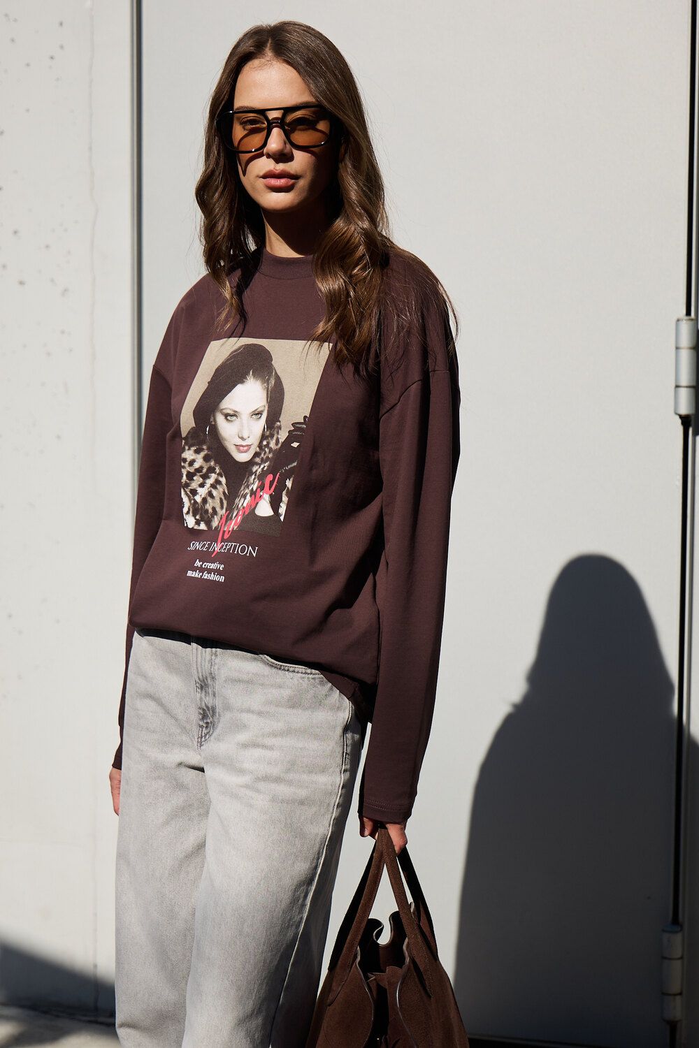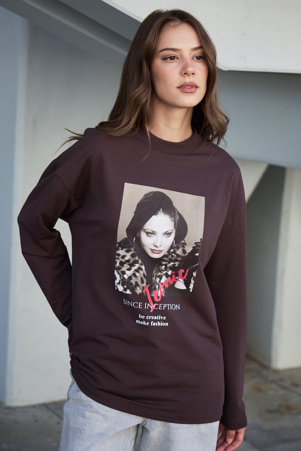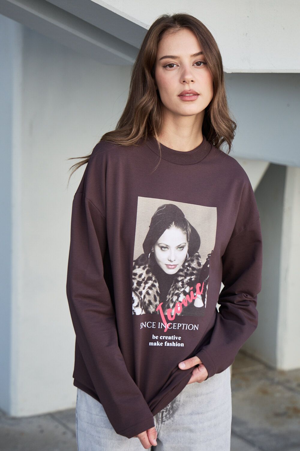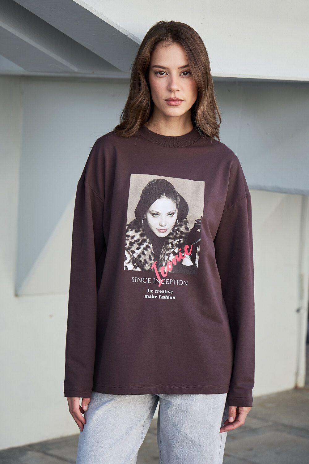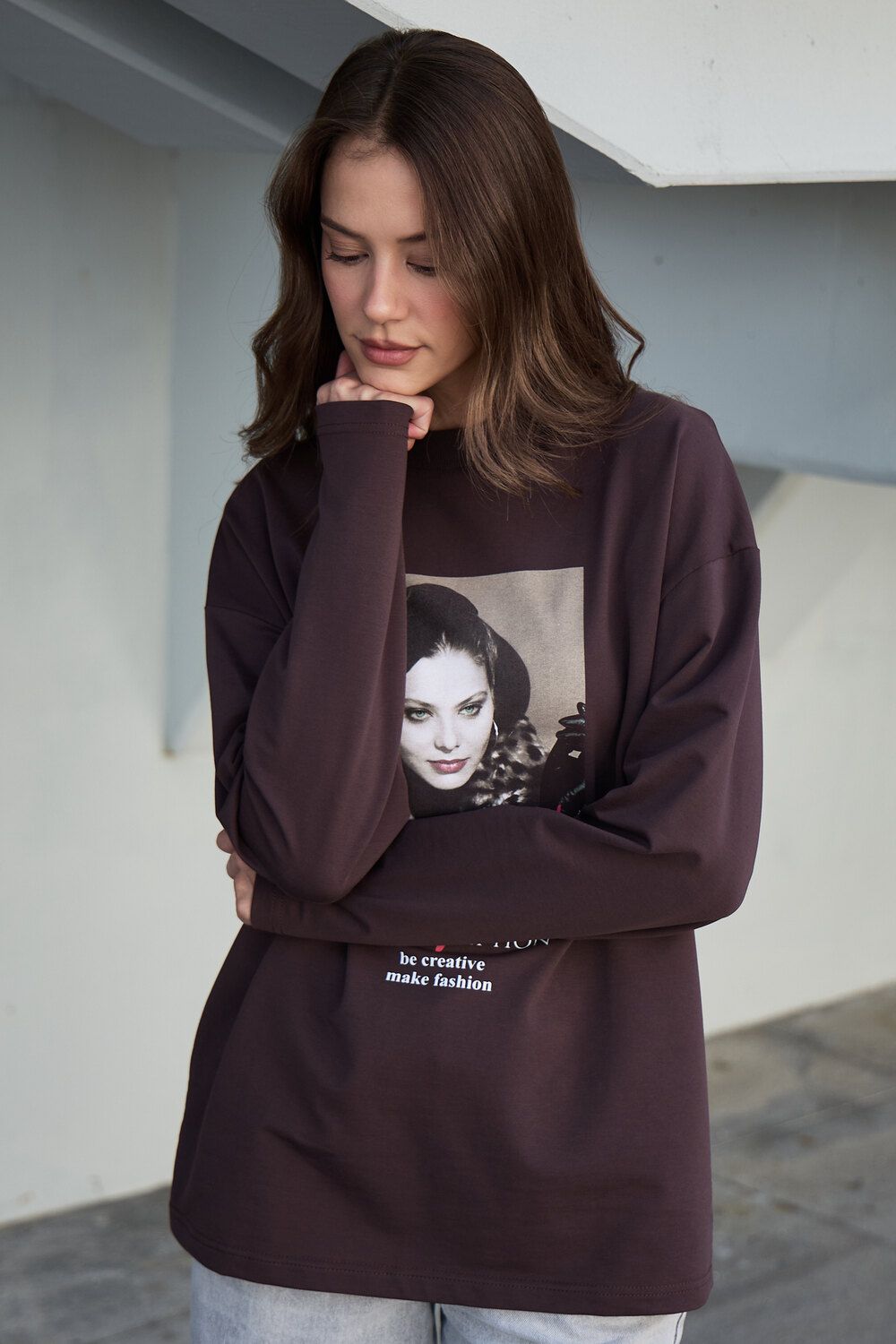 Лонгслив оверсайз с принтом - коричневый
