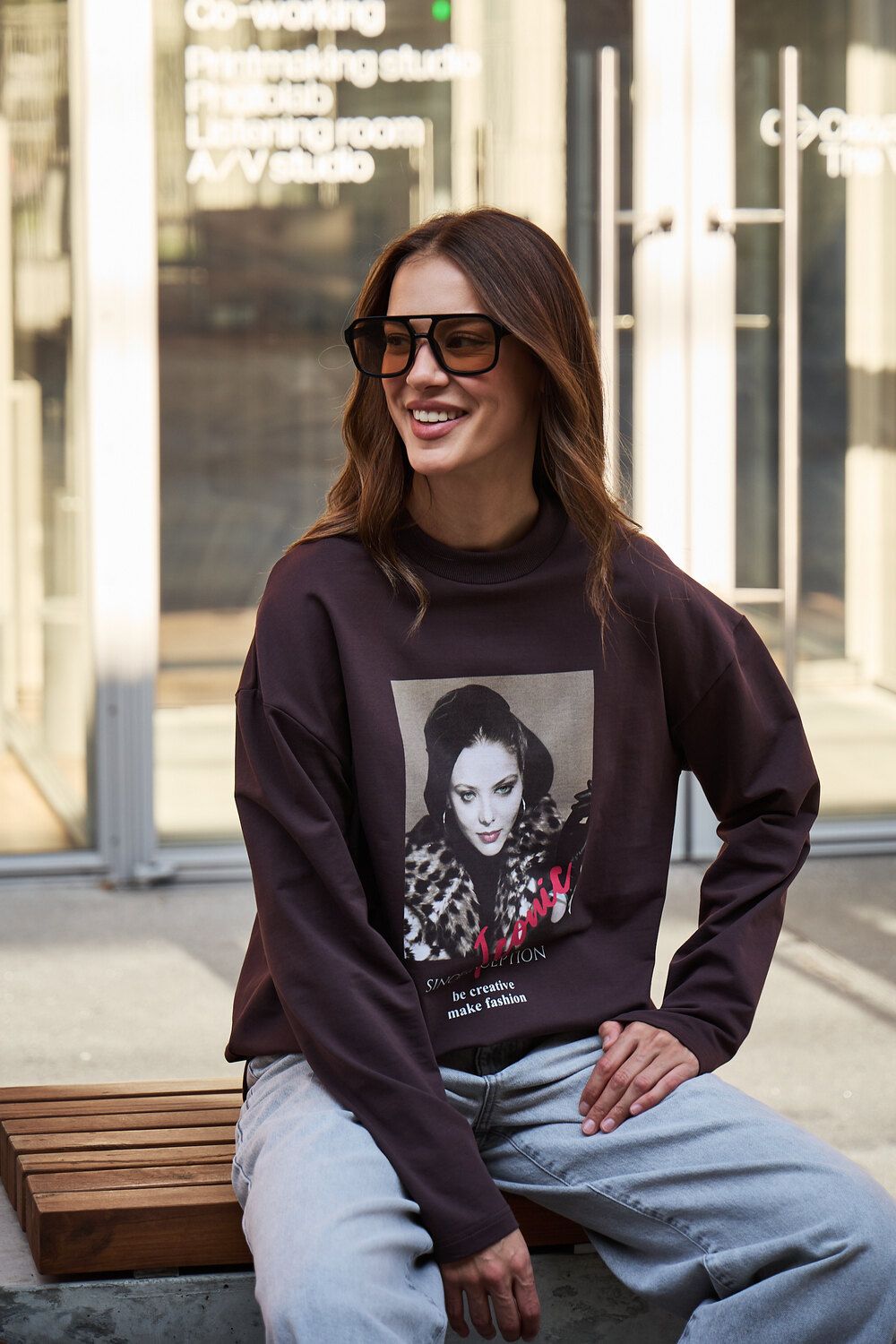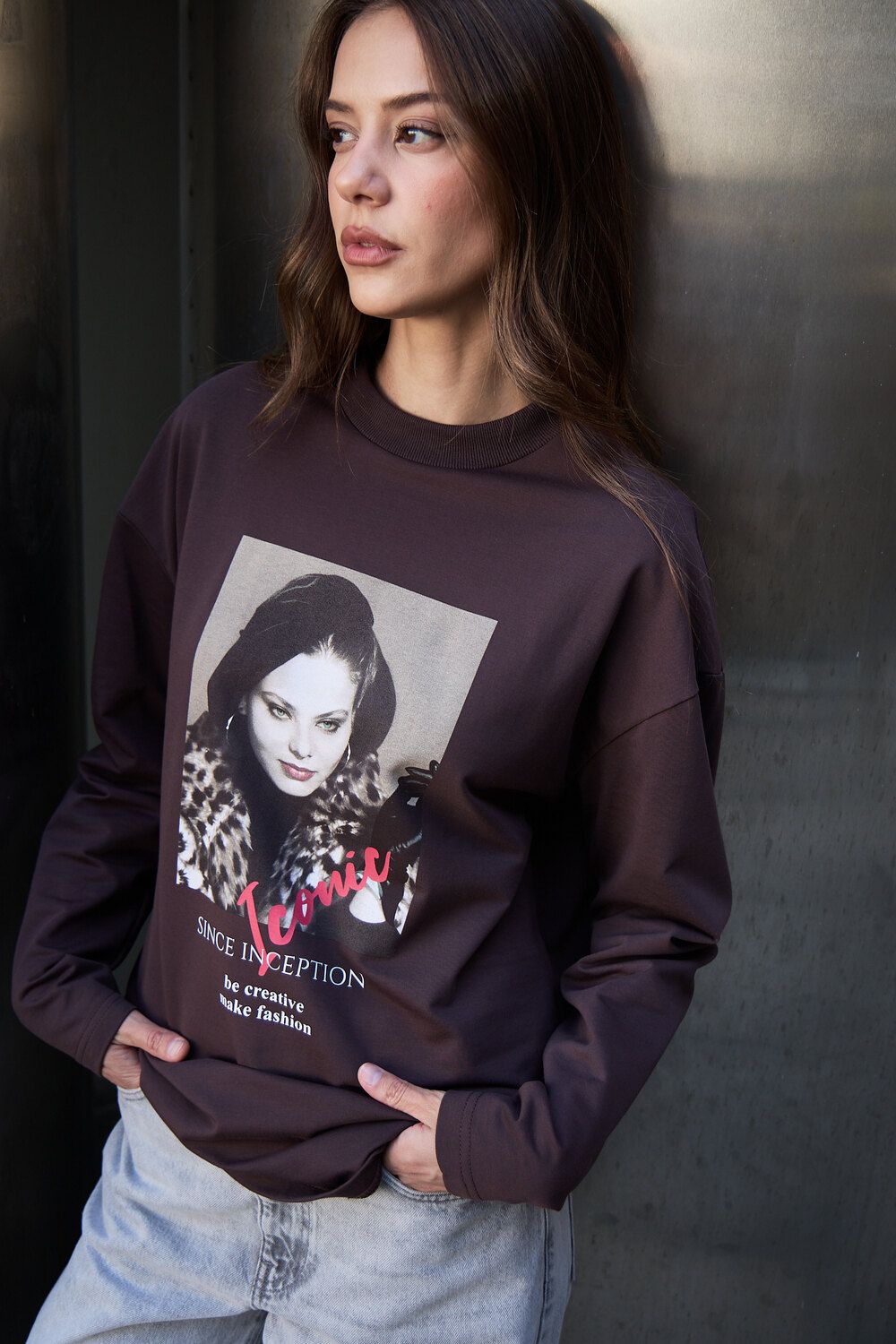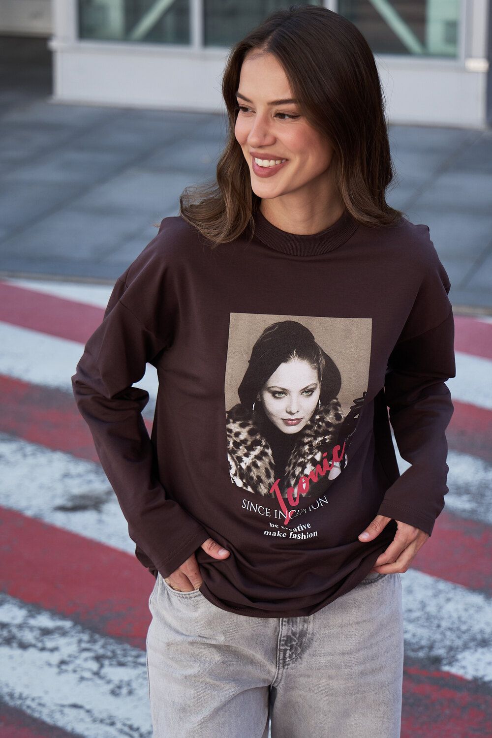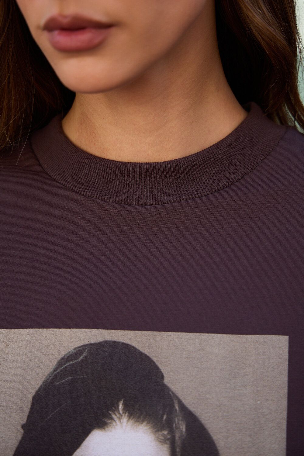 Лонгслив оверсайз с принтом - коричневый