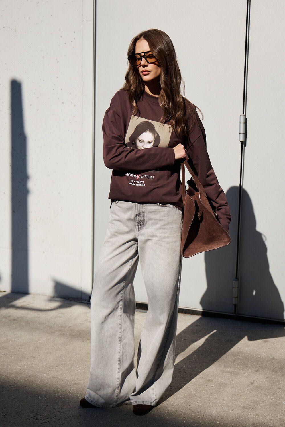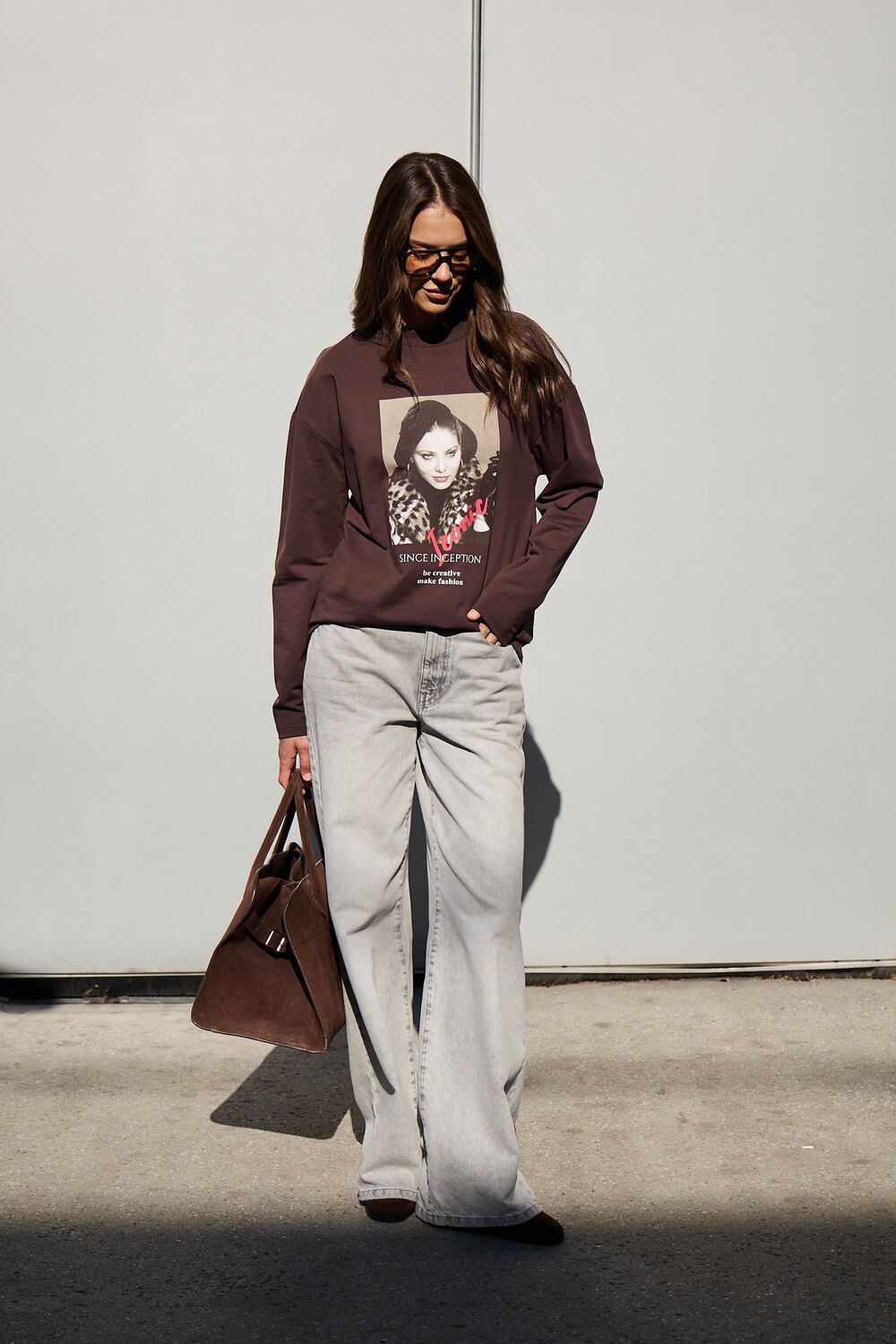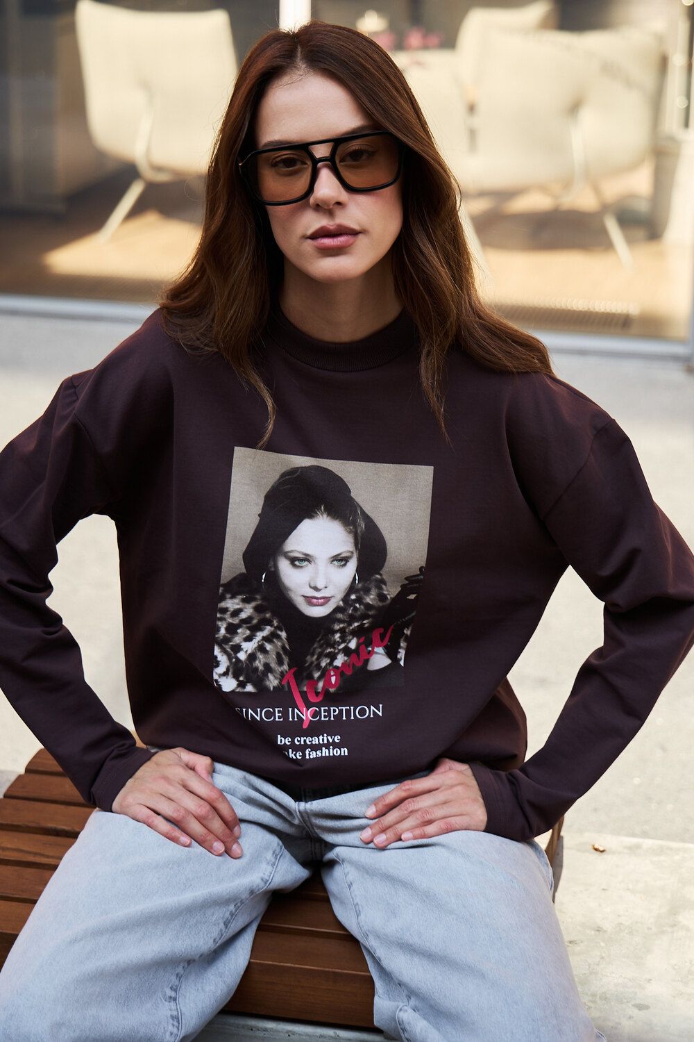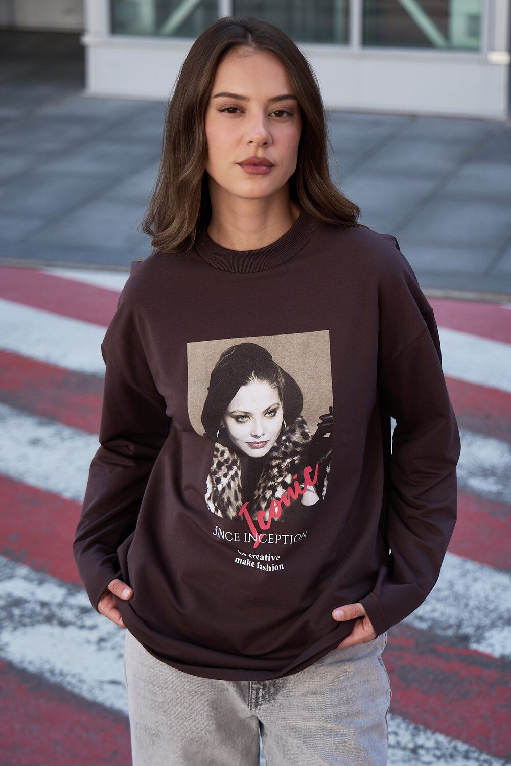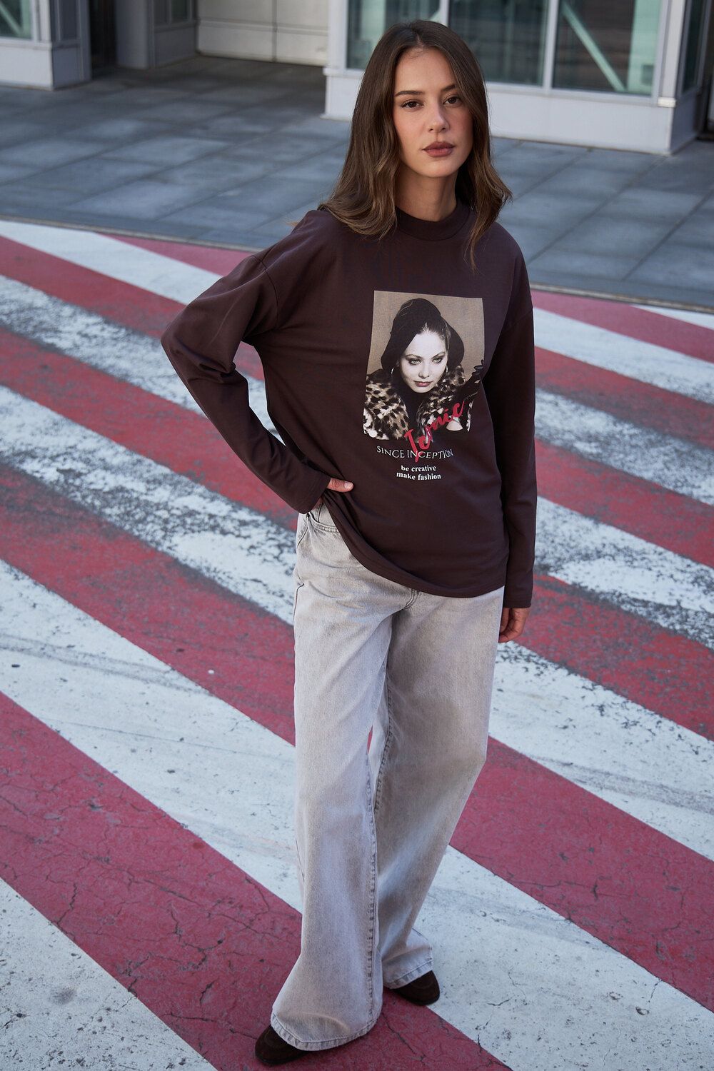 Лонгслив оверсайз с принтом - коричневый