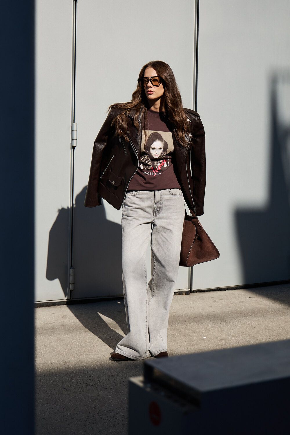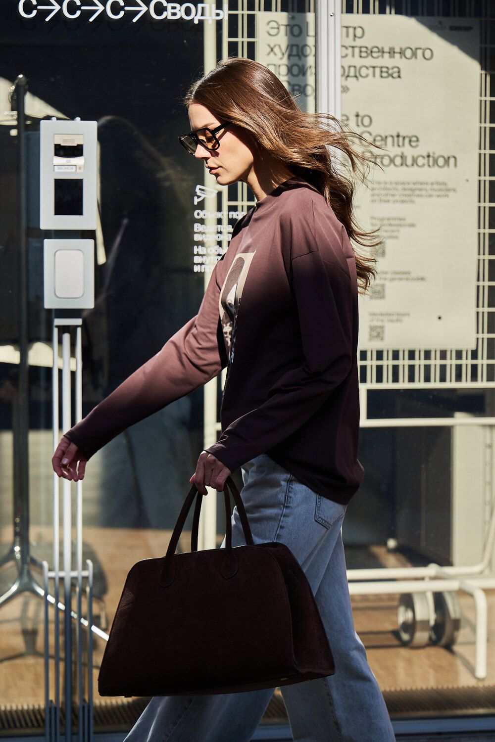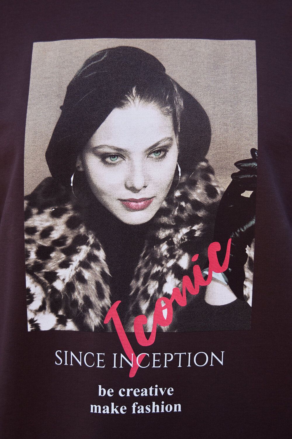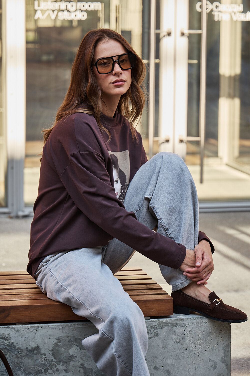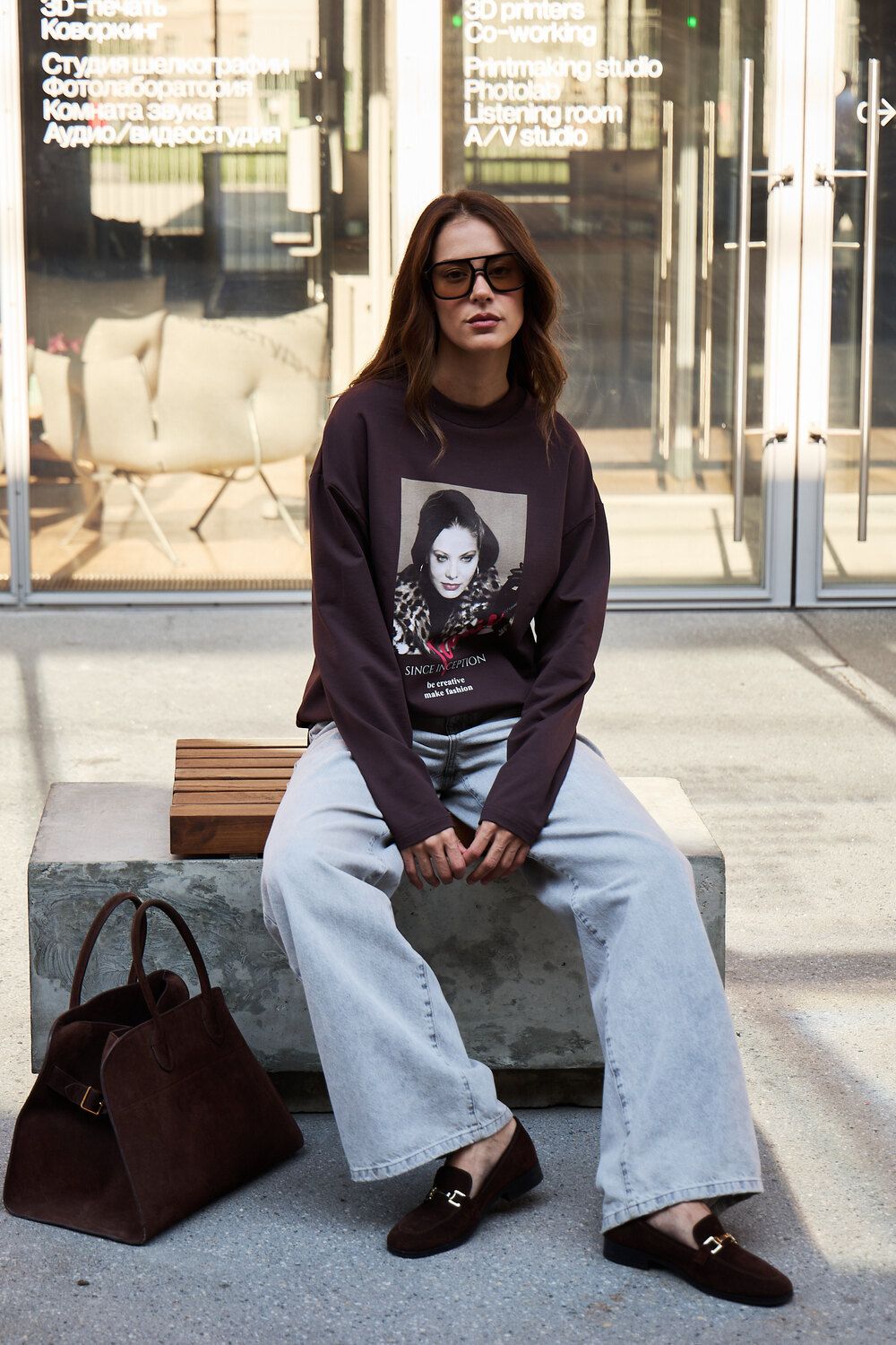Лонгслив оверсайз с принтом - коричневый