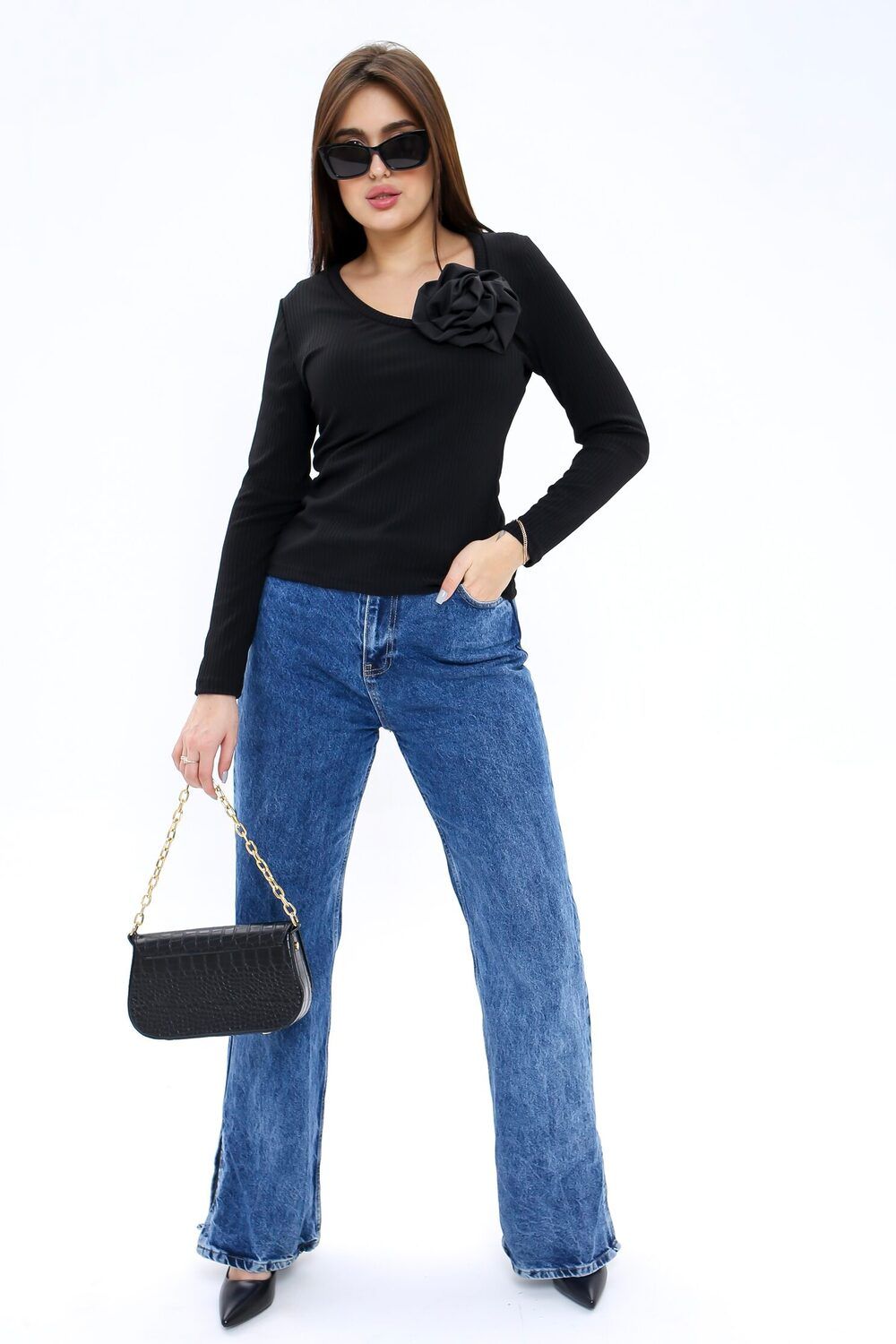 Модель лонгслива, украшенная эффектной объемной аппликацией в виде цветка. Этот предмет гардероба станет настоящим украшением вашего образа и привлечет восхищенные взгляды!