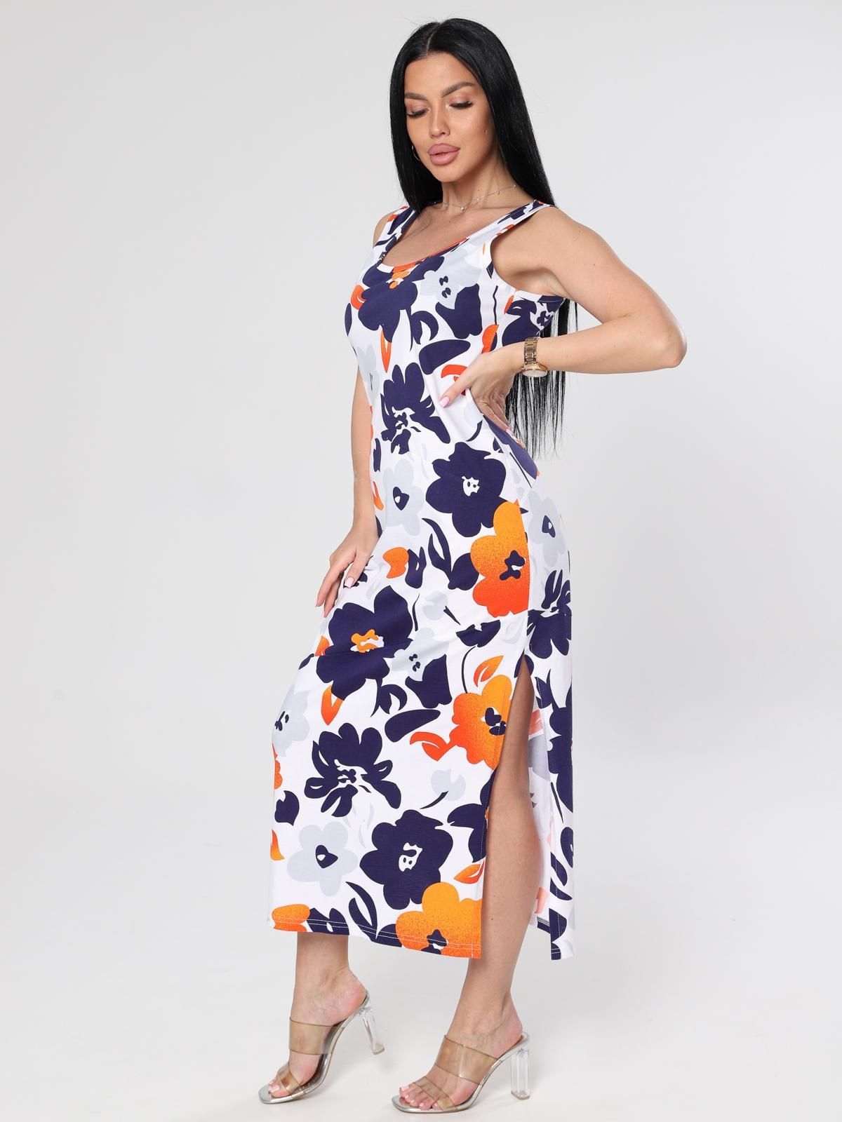 Платье женское "Мабель" из набивного трикотажного полотна "кулирка", удлиненное, полуприлегающего силуэта с круглым вырезом горловины без рукавов, с рельефными ассиметричными швами. Вырез горловины и проймы обработаны кантом из основной ткани. В левом боковом шве разрез.