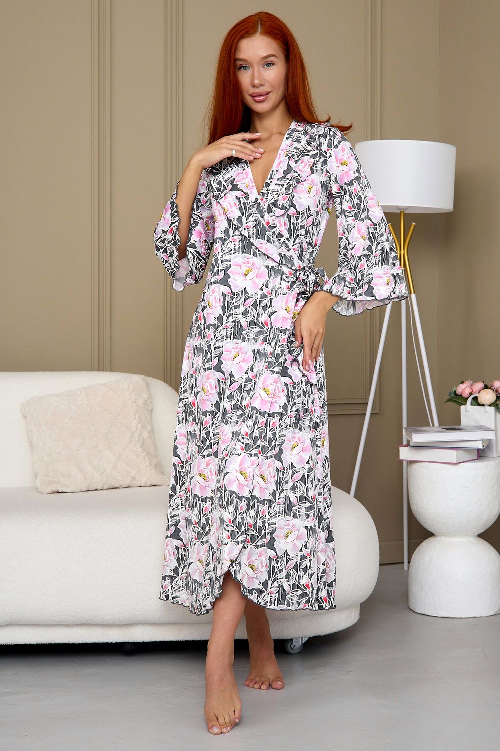 Халат домашний трикотажный женский - это отличное дополнение к вашей коллекции одежды для дома, созданной для тех, кто любит быть яркой и стильной, даже находясь в уютном уголке своего дома. Длинный халат с запахом имеет полуприлегающий силуэт, расклешенный к низу, длиной до середины икры. Линия талии завышена, что создает элегантный и изящный силуэт. На полочках, в области груди, расположены изящные воланы, которые добавляют изюминку к образу, подчеркивая женственность. Рукав в тачной, длиной 3/4, смотрится легко и элегантно, это делает его удобным в использовании. Подойдет как стройным женщинам, так и дамам с пышными формами. Идеально для подарка. Благодаря крою подойдет на маленькие и большие размеры, беременным и кормящим мамочкам. Возьмите халатик в роддом и будете самой элегантной мамочкой. Наш халат – это идеальный выбор для приятного времяпрепровождения в уютной обстановке. Сочетая в себе красоту и удобство, он идеально подходит для женщин, которые ценят качество во всем.