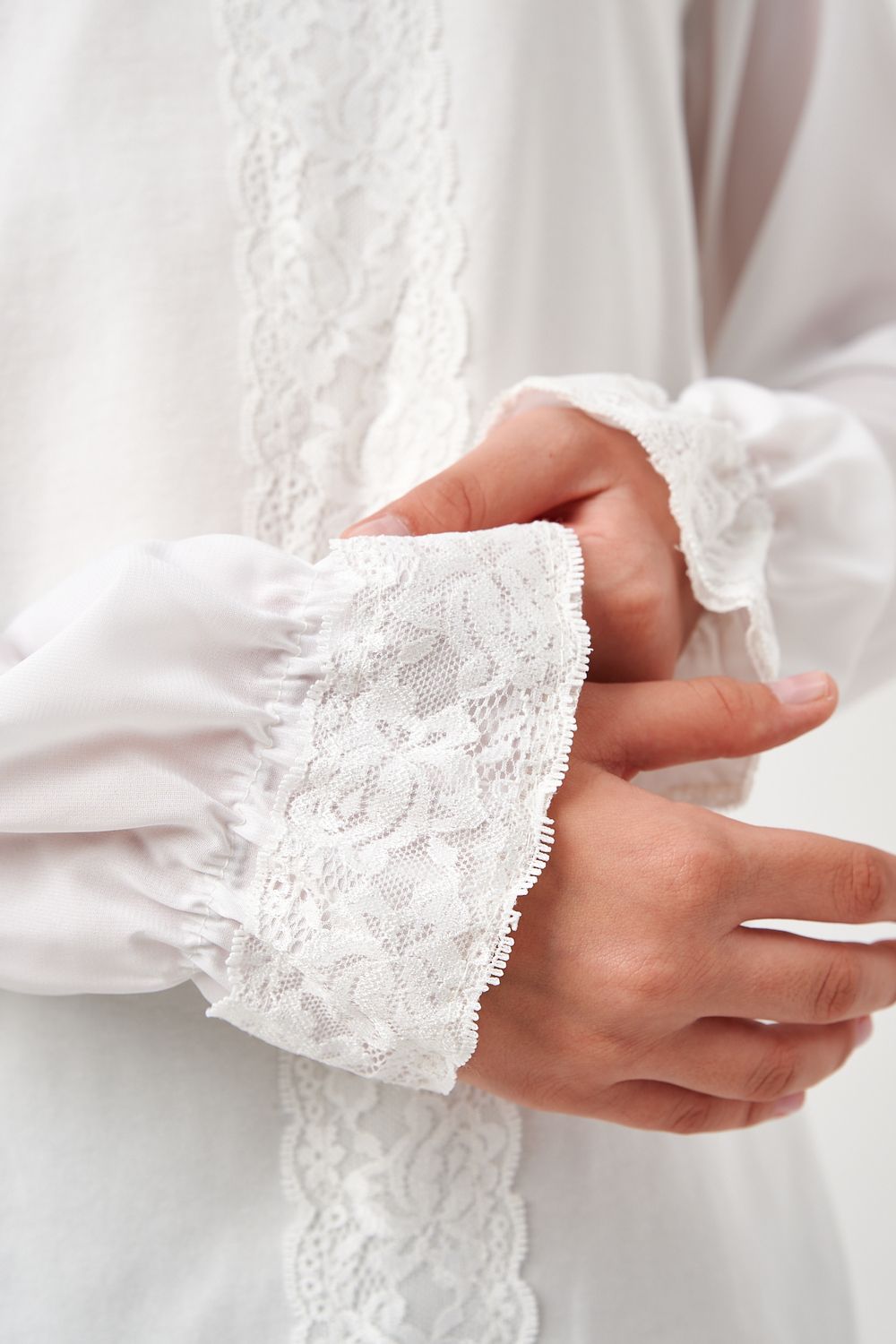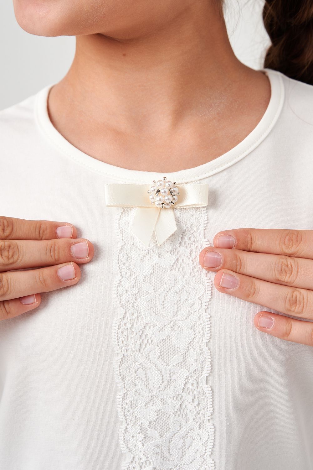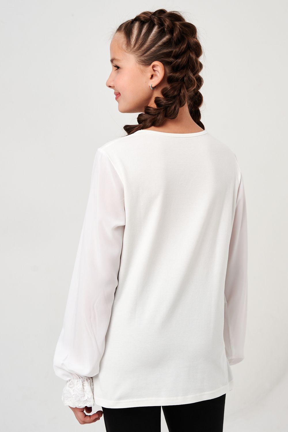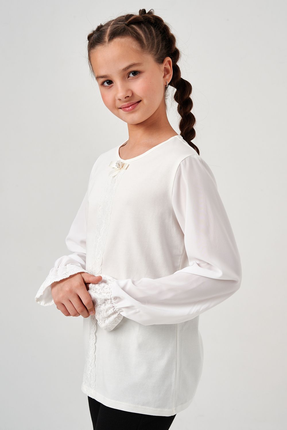 Блузка для девочек младшего и старшего школьного возраста, из трикотажного полотна кулирка с лайкрой и шифона. Блузка прилегающего силуэта, с втачным рукавом. Перед и спинка выполнены из трикотажного полотна, рукава из шифона. По центру переда от горловины до низа настрочено кружево. Рукава снизу присборены на резинку. По низу рукавов насточено кружево. Горловина окантована. По центру горловины спереди прикреплен декоративный элемент. Низ изделия подогнут.