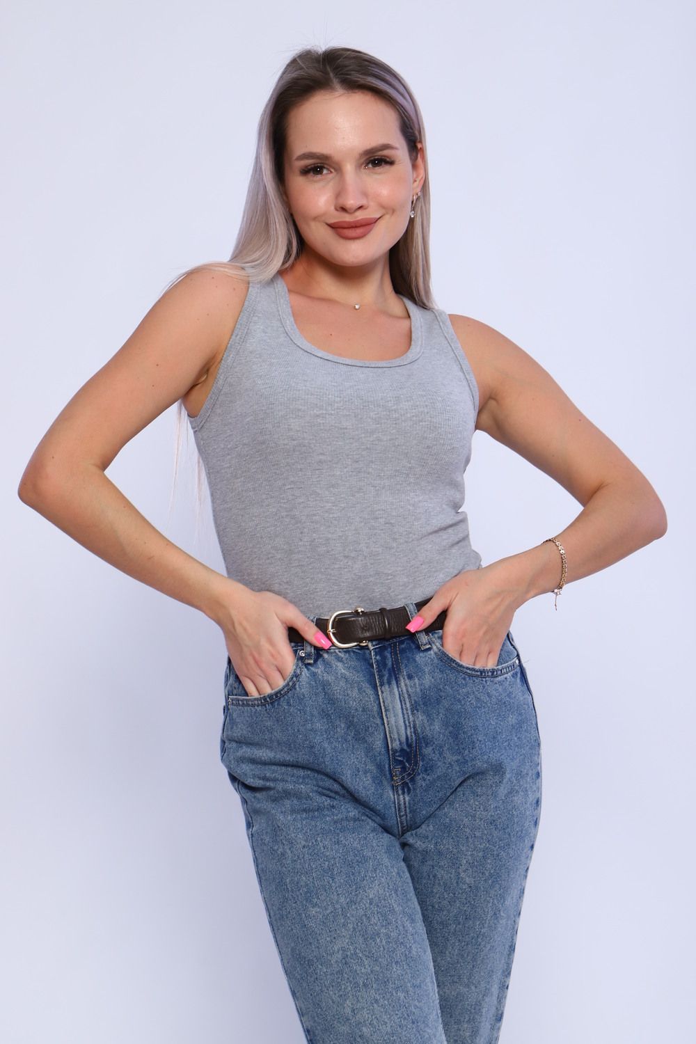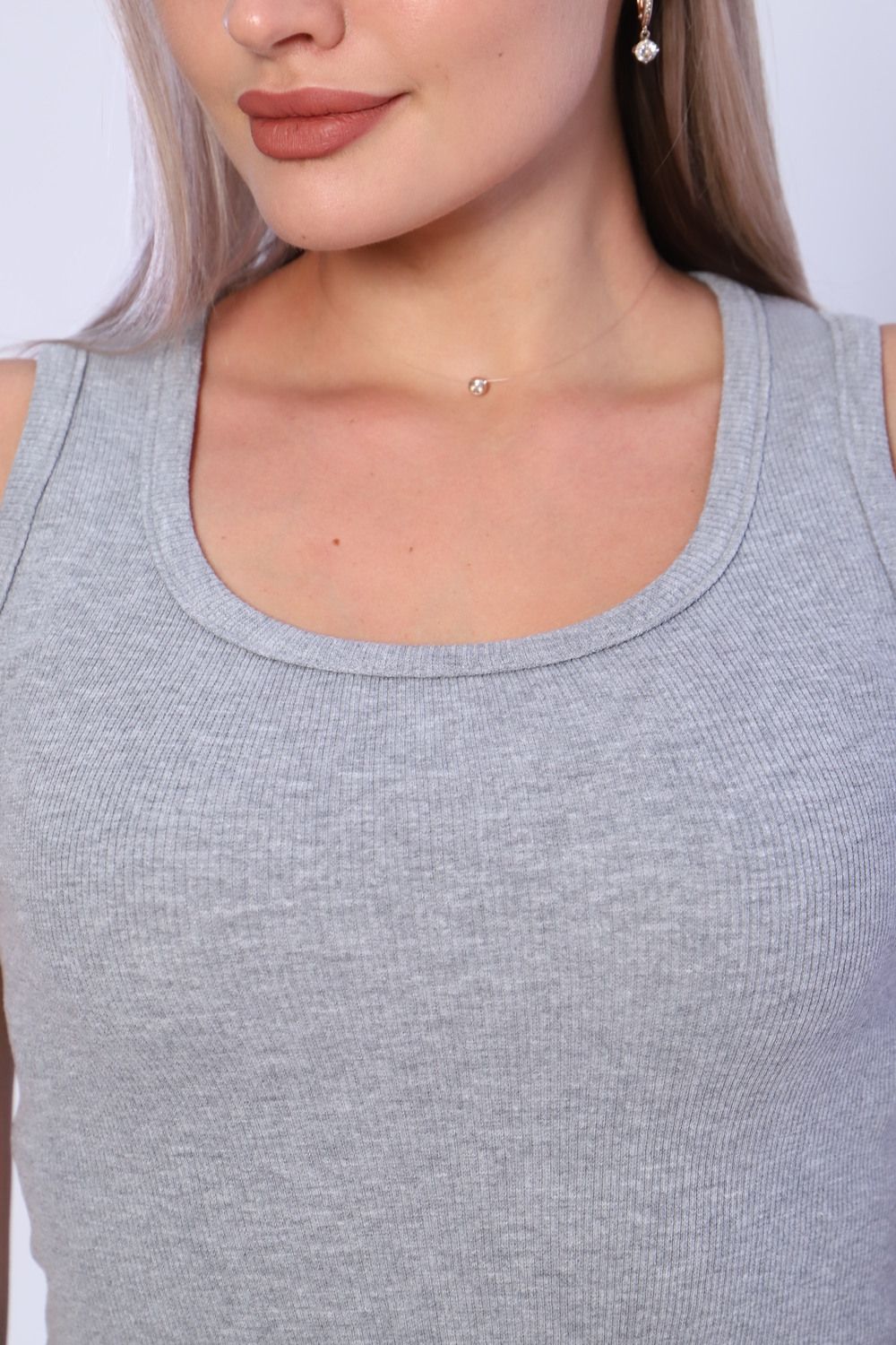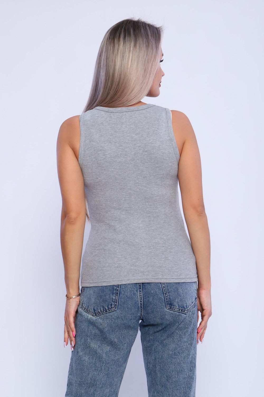 Майка женская из кашкорсе. Пройма и горловина майки обработаны окантовкой, низ подогнут на плоскошовной машине. Идеальный вариант для повседневной носки.